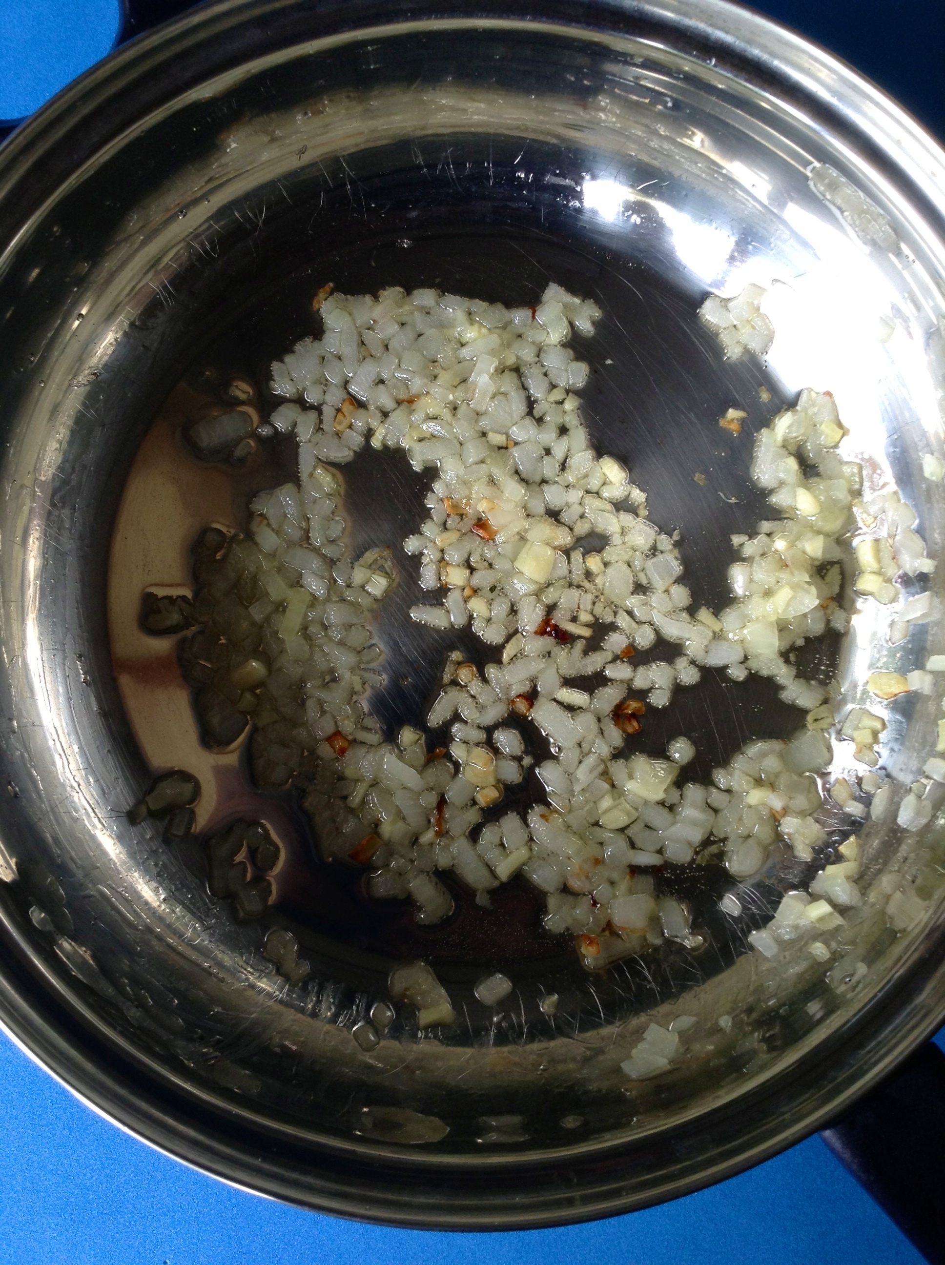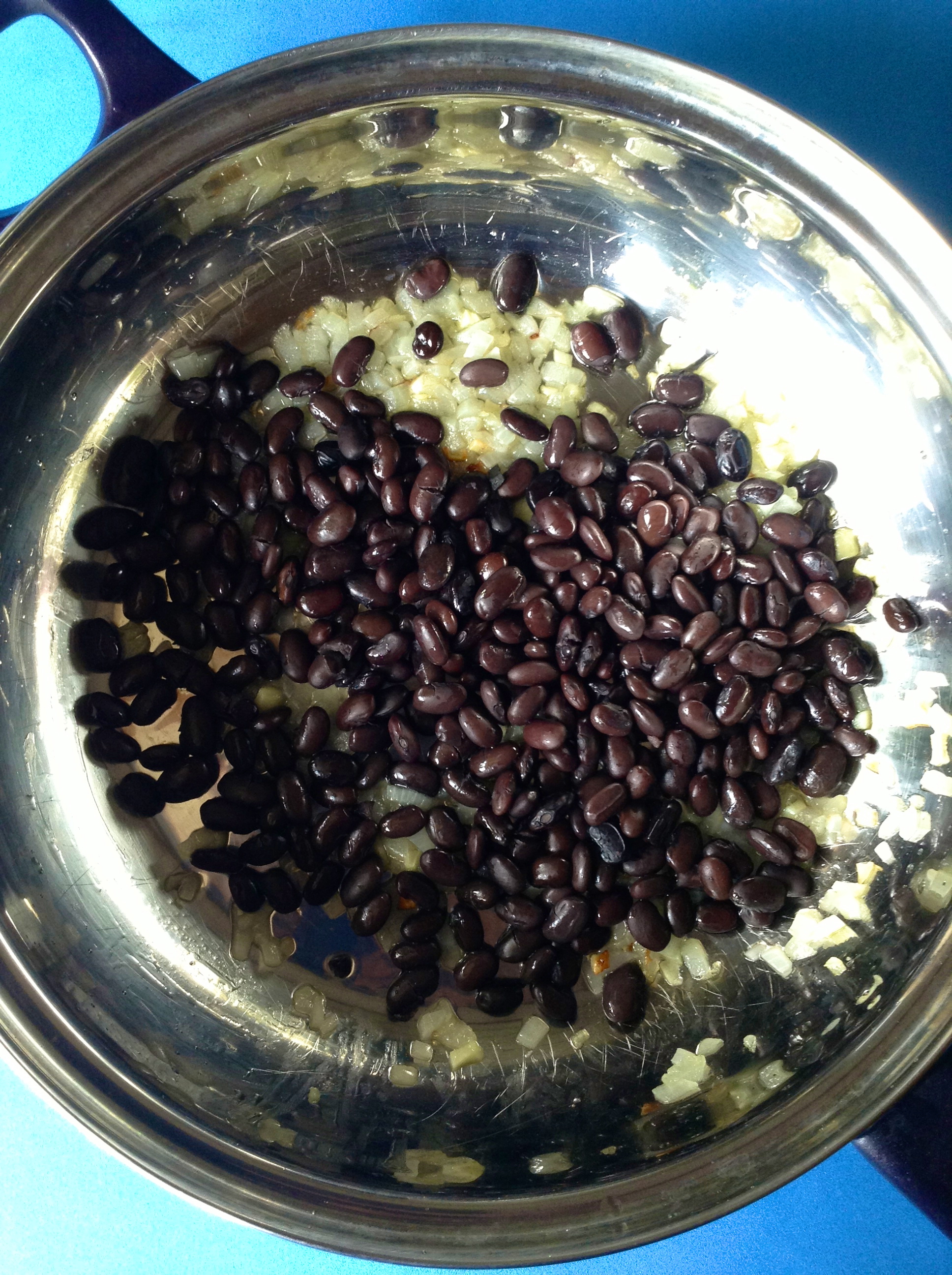 Pico media cebolla y un par de ajos, y los rehogo en una sartén con aceite de oliva. Cuando empiezan a dorarse, añado los frijoles con un poco del caldo de cocción y los aplasto.