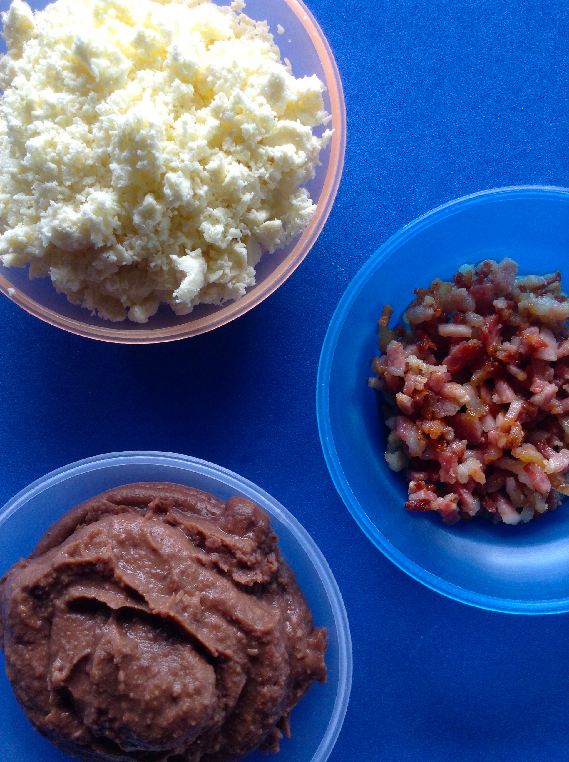 Mezclo el queso, el tocino y la pasta de los frijoles.