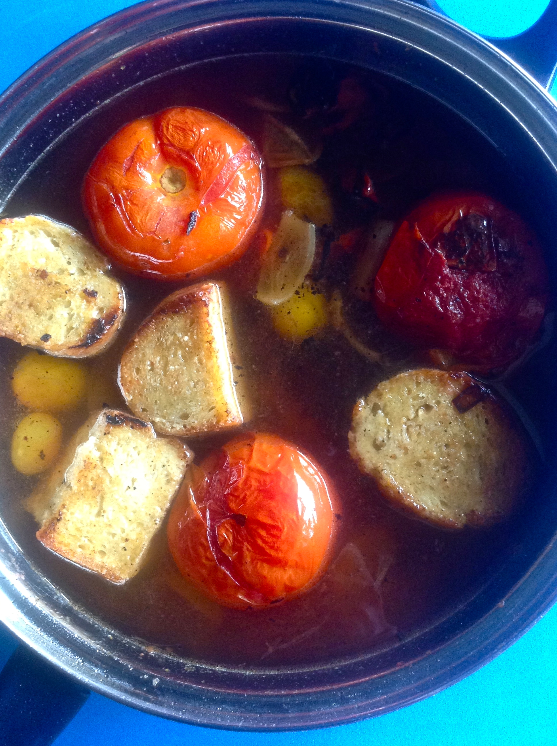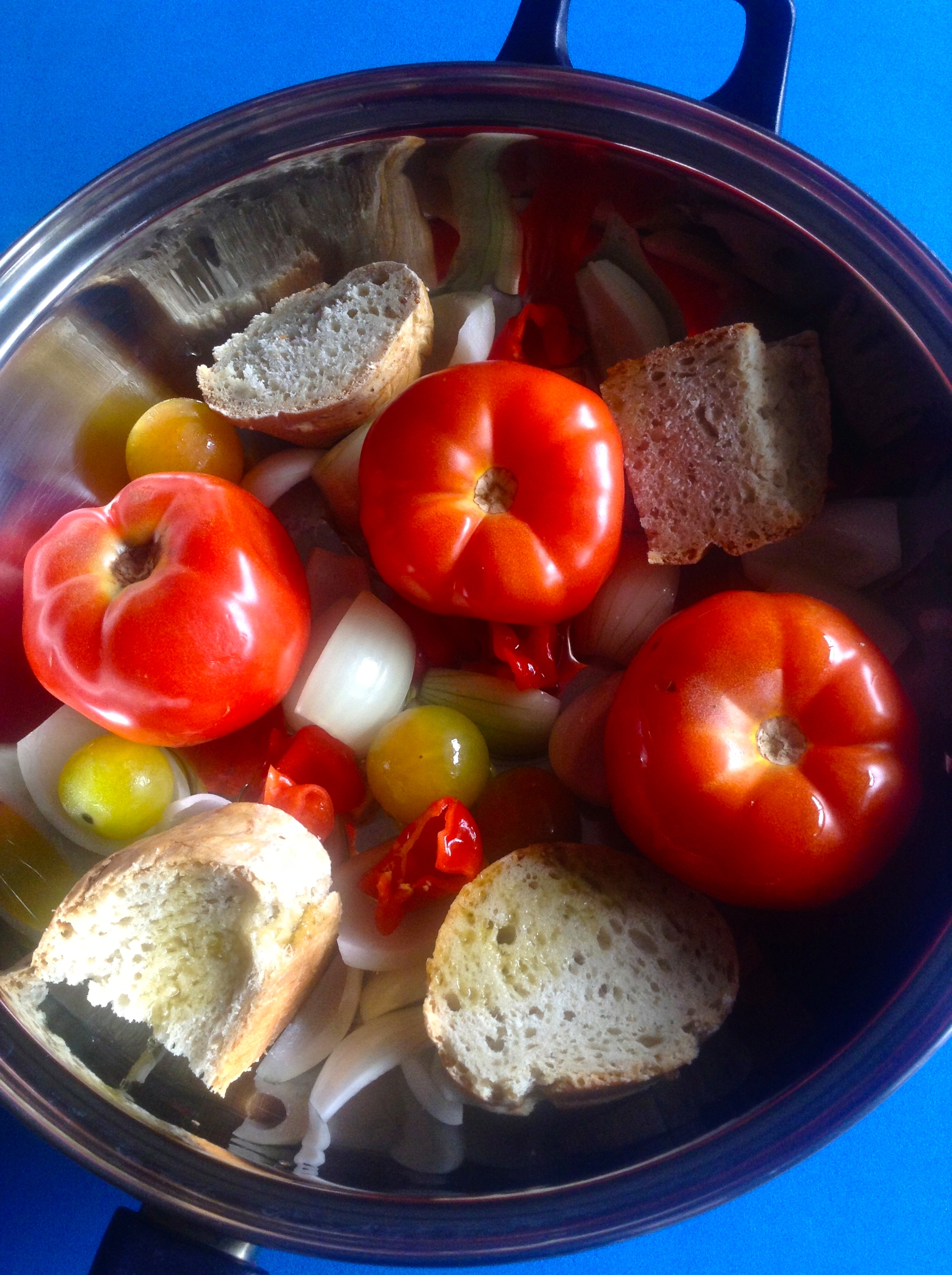 En otra cazuela a fuego medio-alto pongo un chorro de aceite de oliva, el pan, los tomates, la cebolla, los miltomates, los pimientos picantes, el cilantro y los ajos. Cuando estas verduras y el pan se han tostado, añado unas hojas de cilantro y agua de cocción del pollo hasta cubrir. Lo dejo cociendo durante una media hora. Pasado este tiempo, lo bato y lo cuelo.
