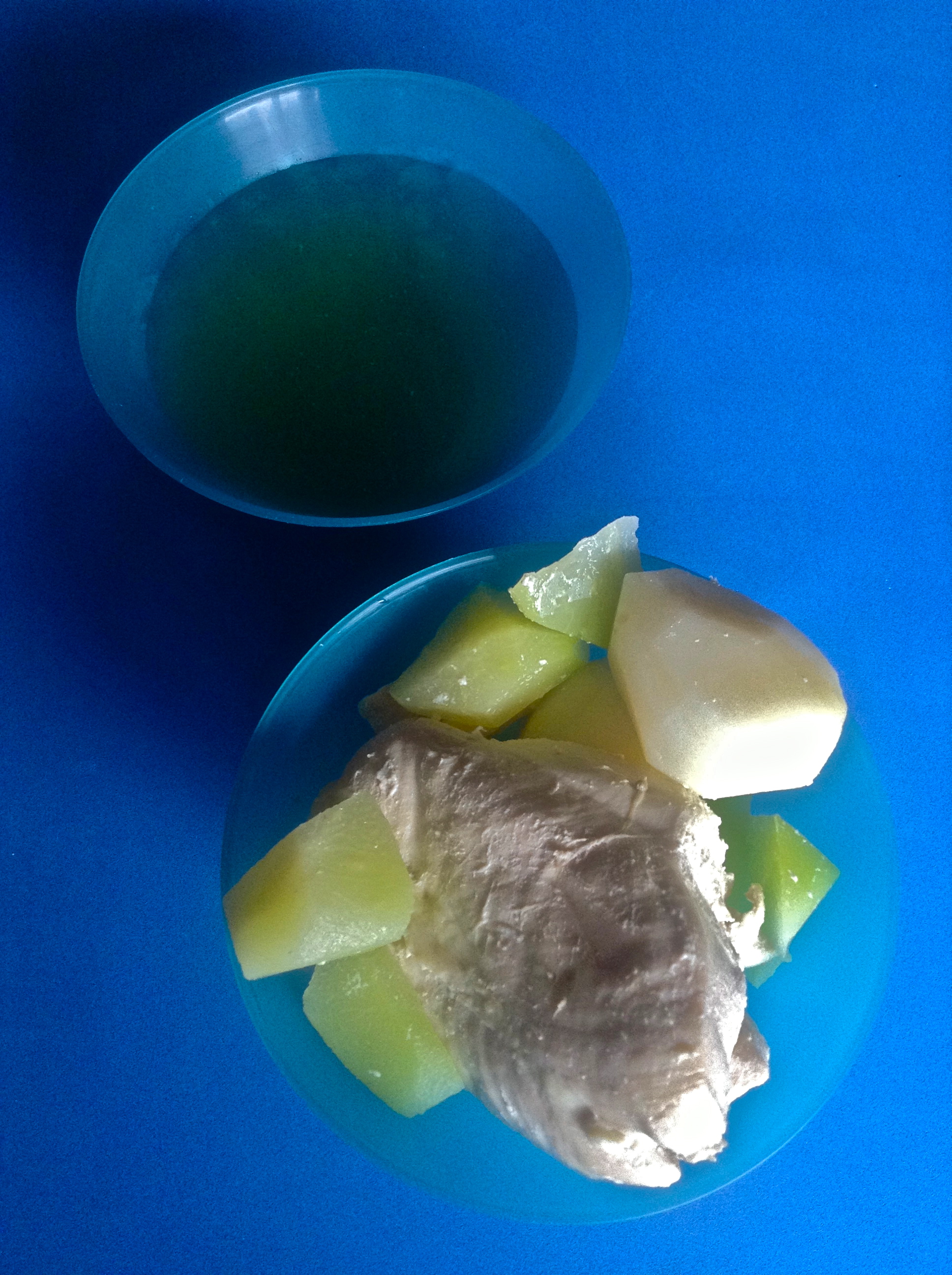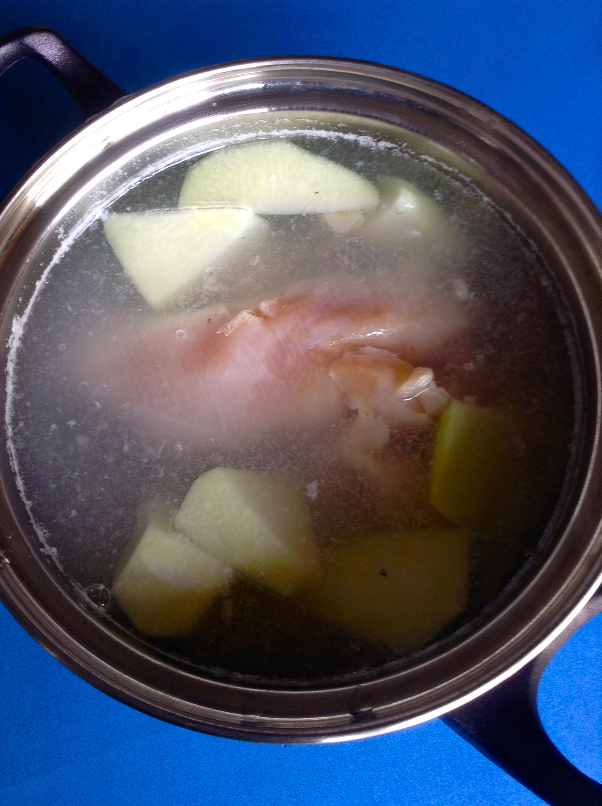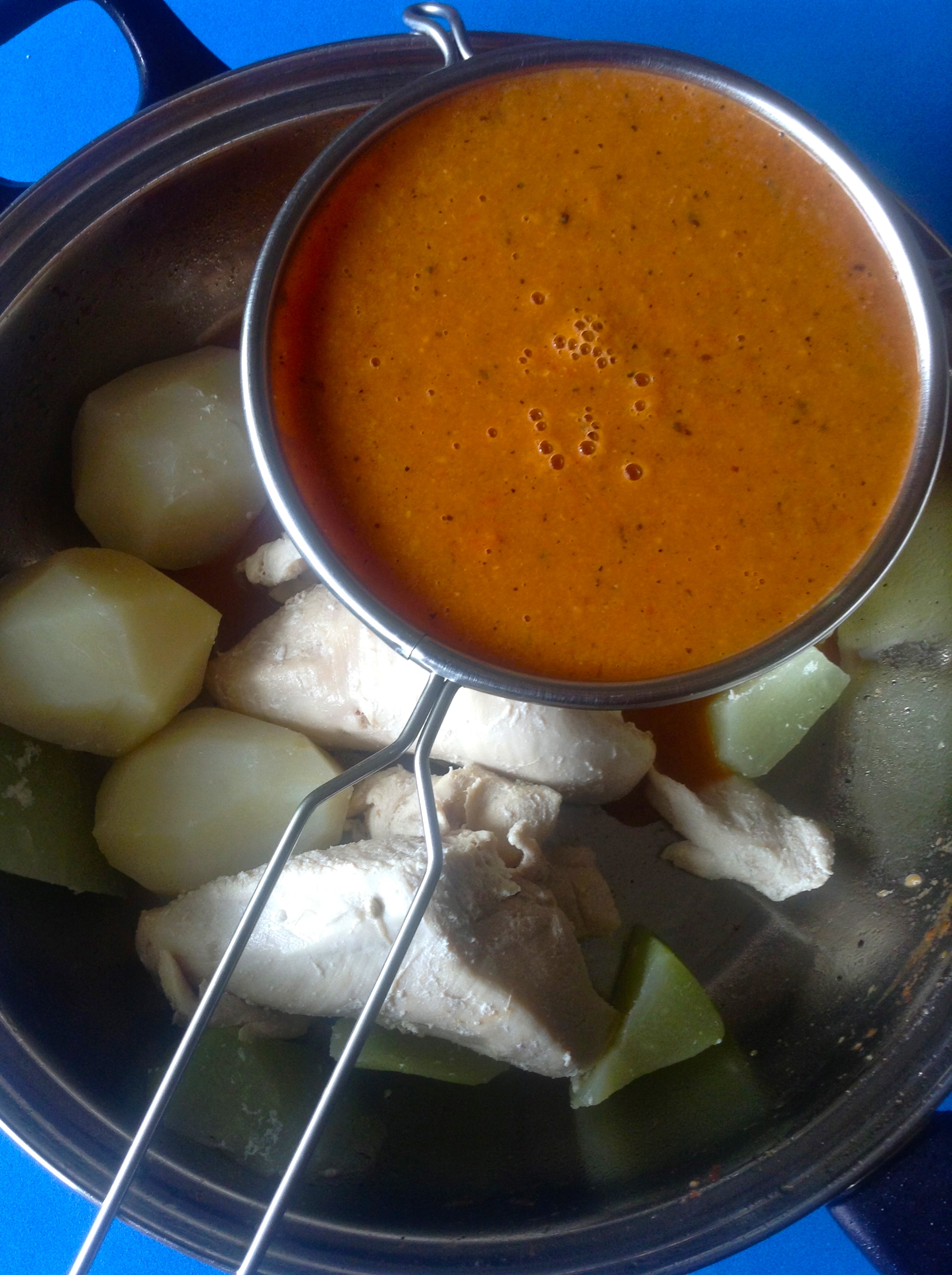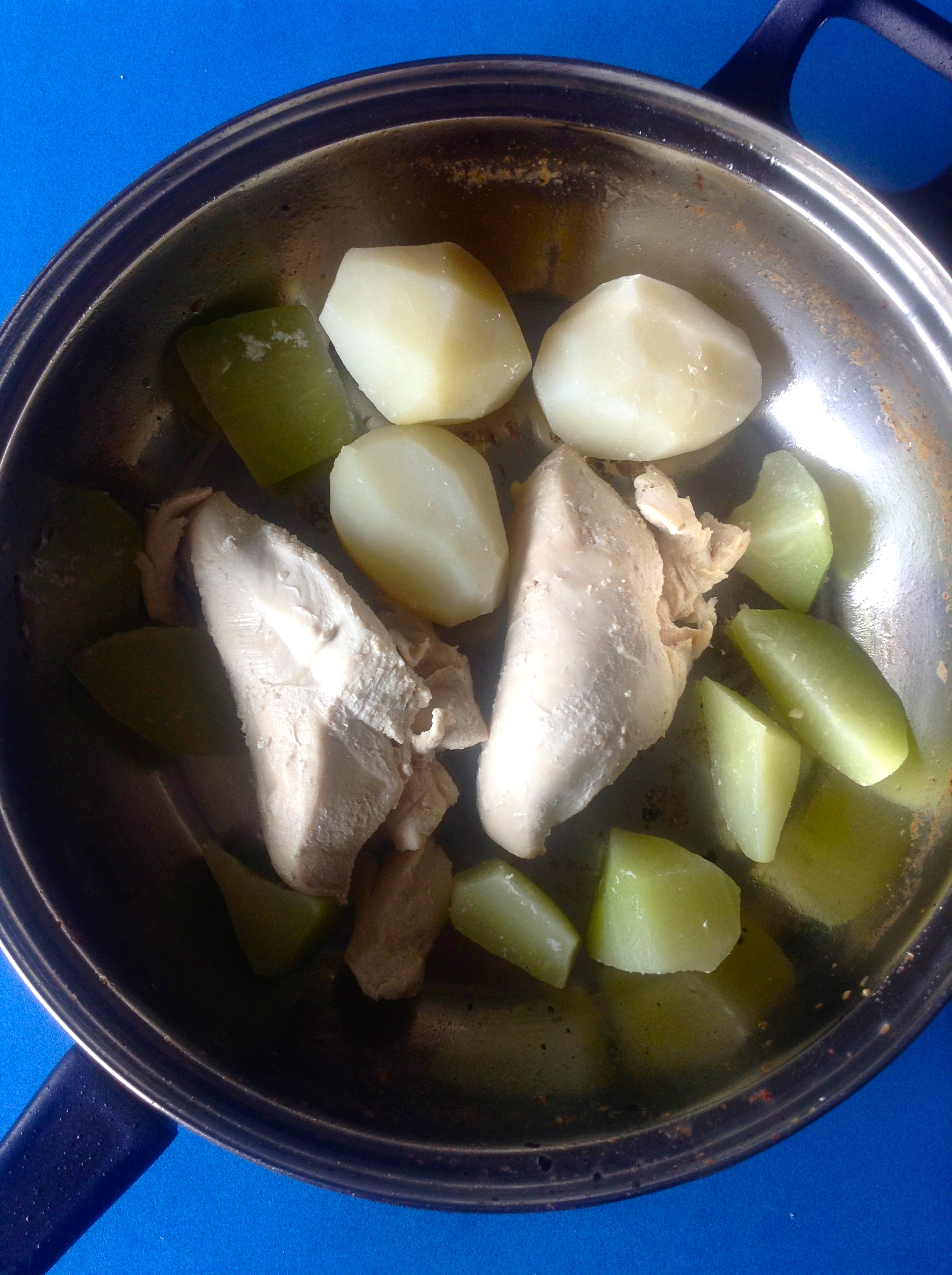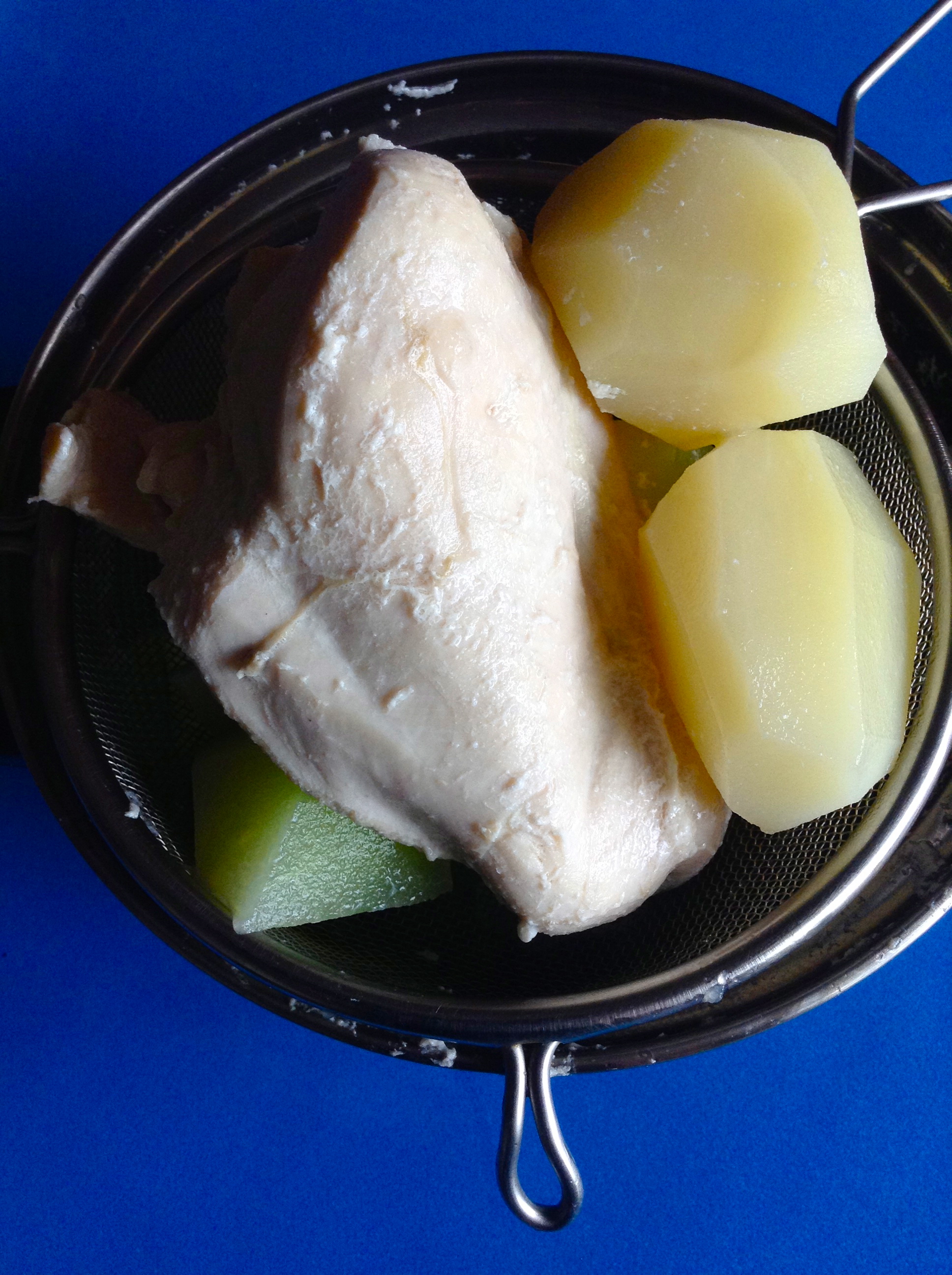 Pongo en una cazuela a fuego medio-alto la pechuga de pollo entera, las papas, la chayota y sal. Lo cubro de agua y lo dejo cociendo durante una media hora. Entonces, lo cuelo, reservando el caldo.