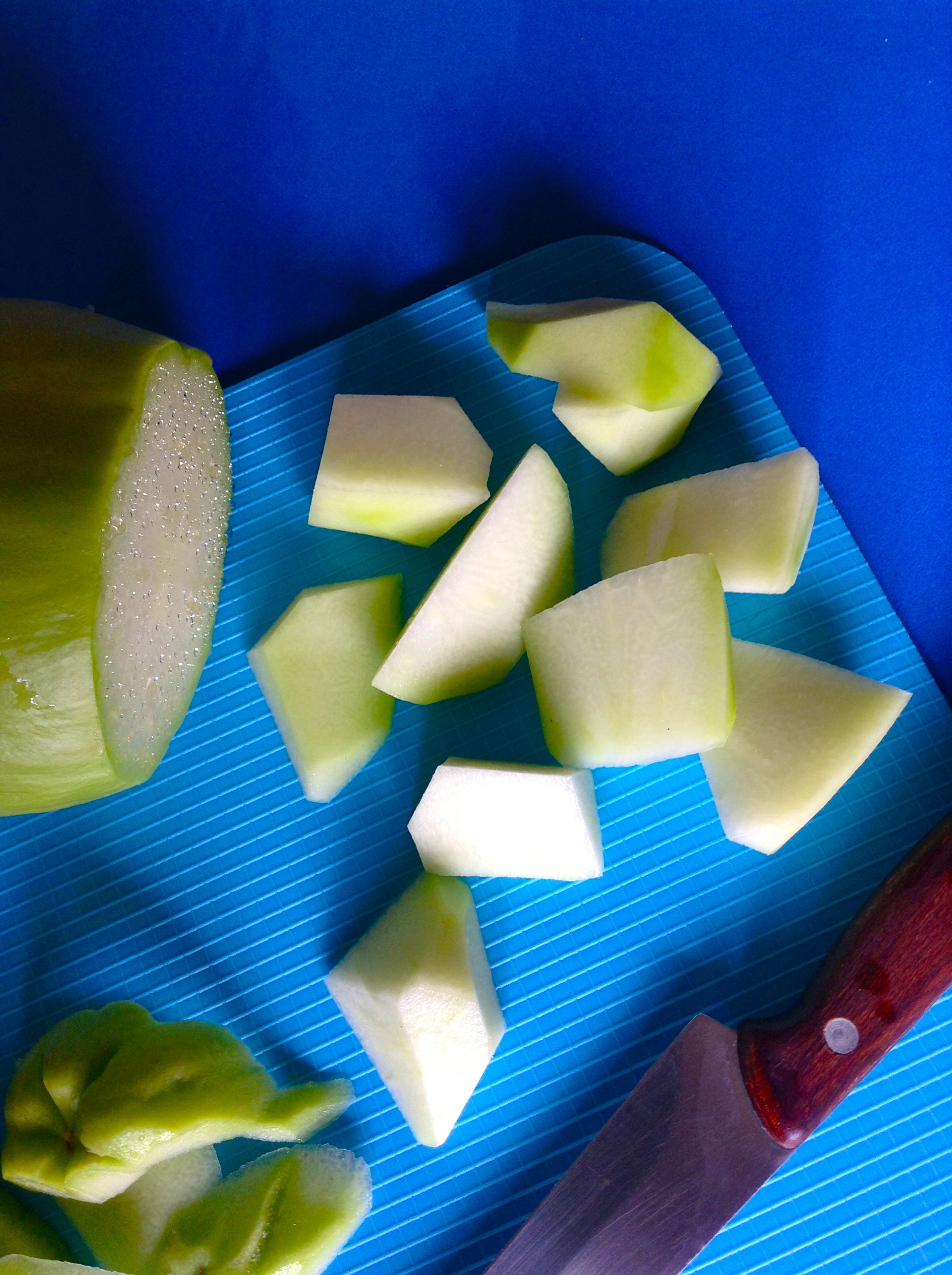 Para preparar el pollo pepián, empiezo pelando y troceando la chayota. Pelo las papas.