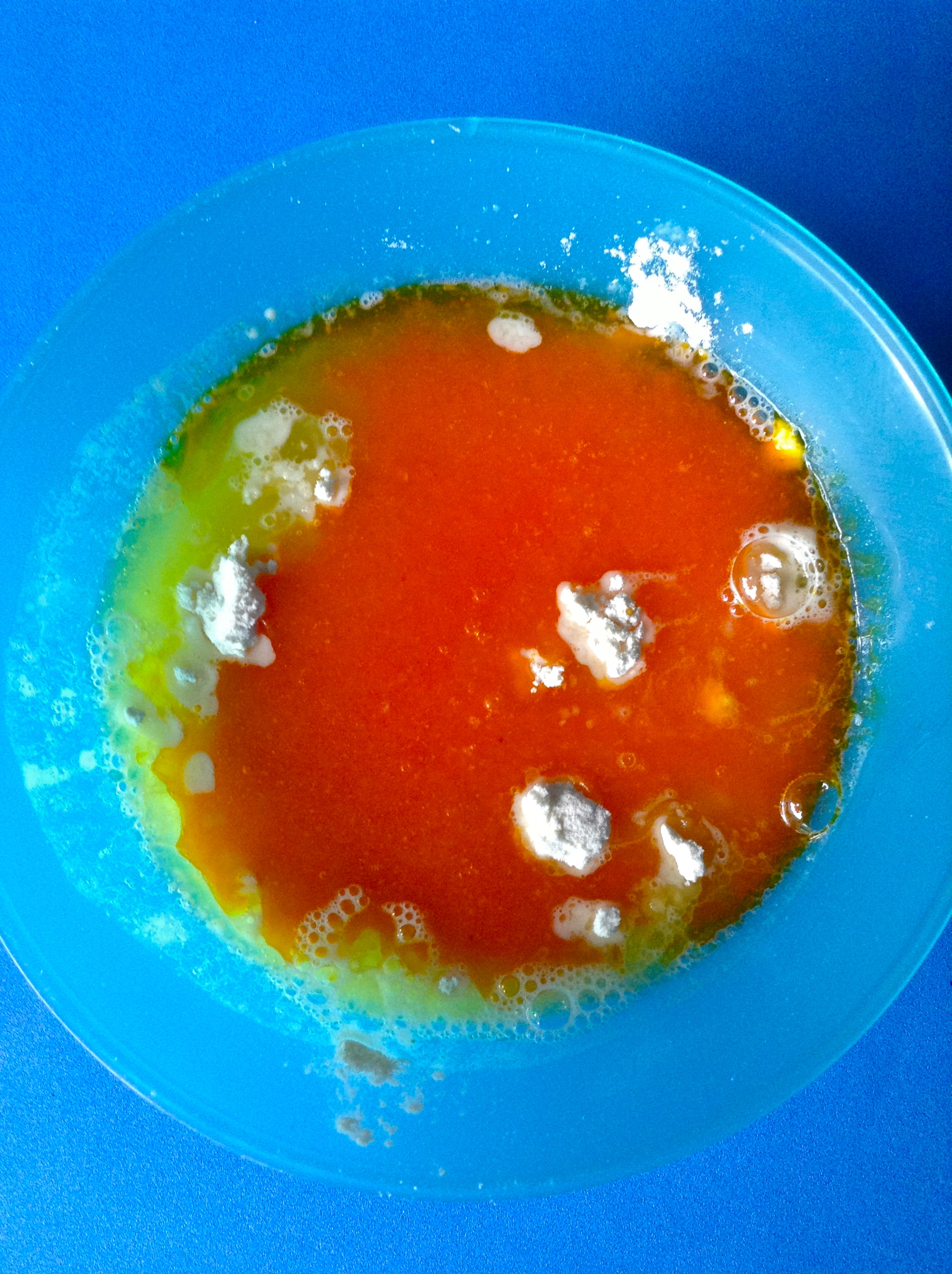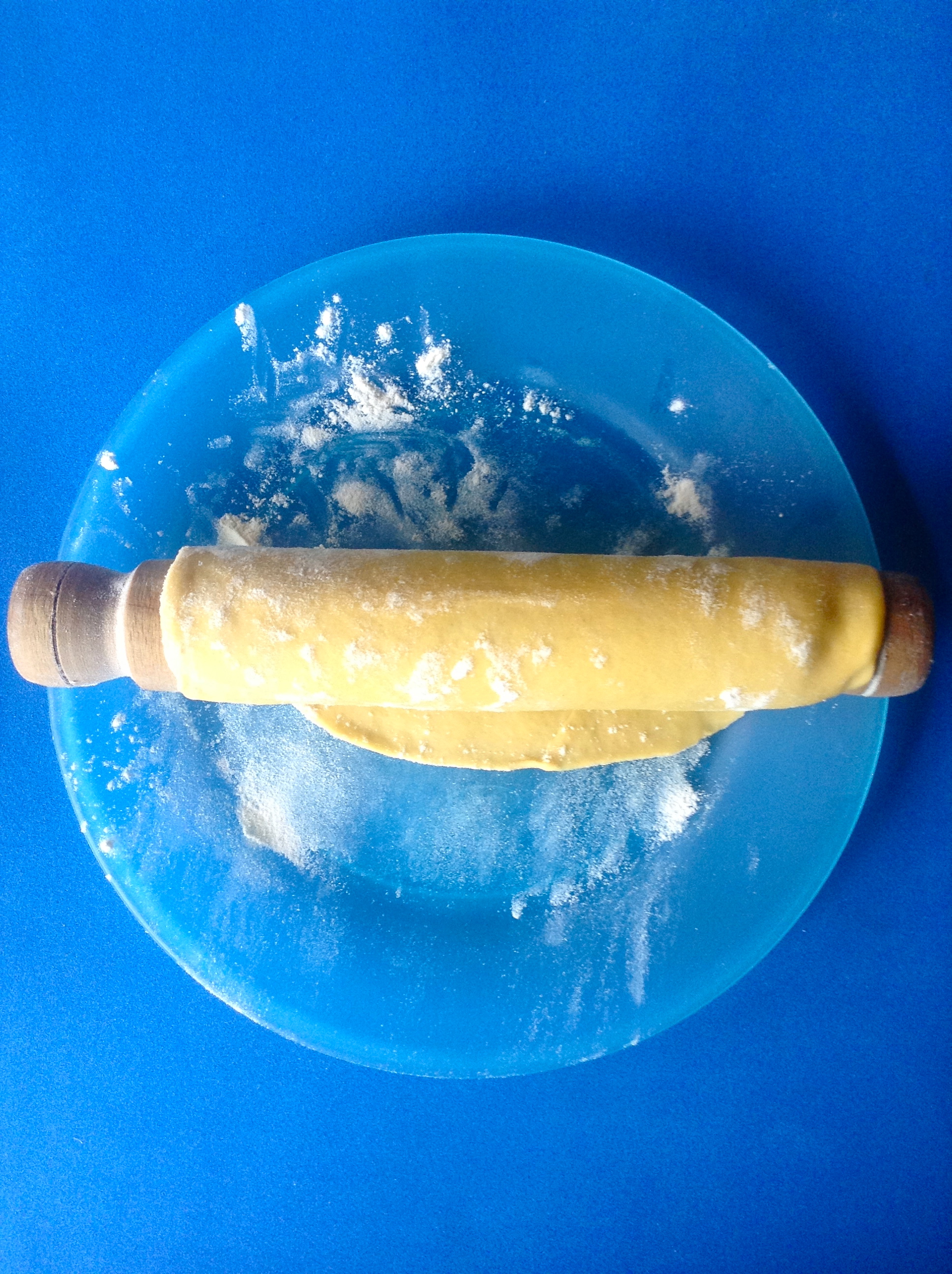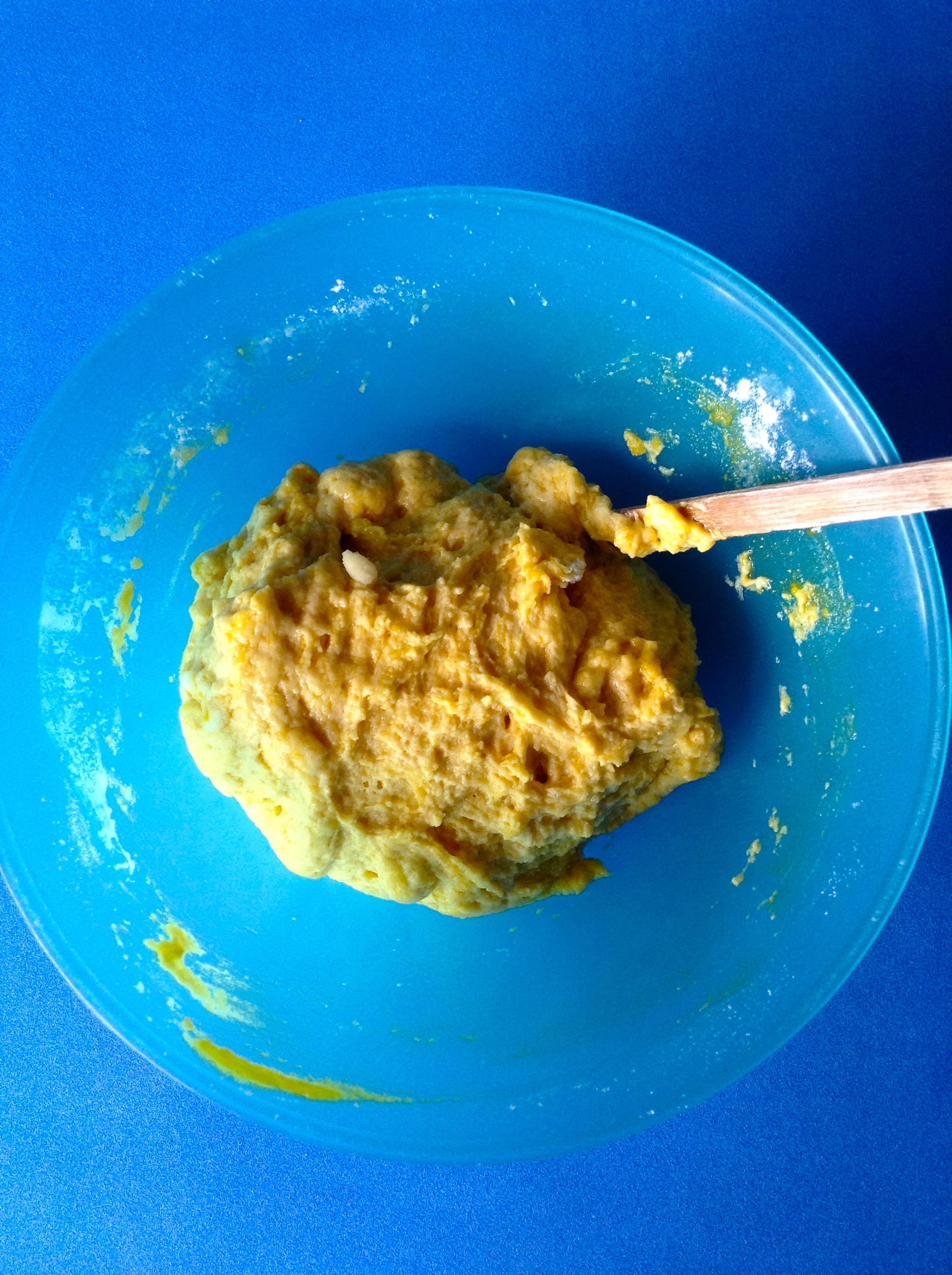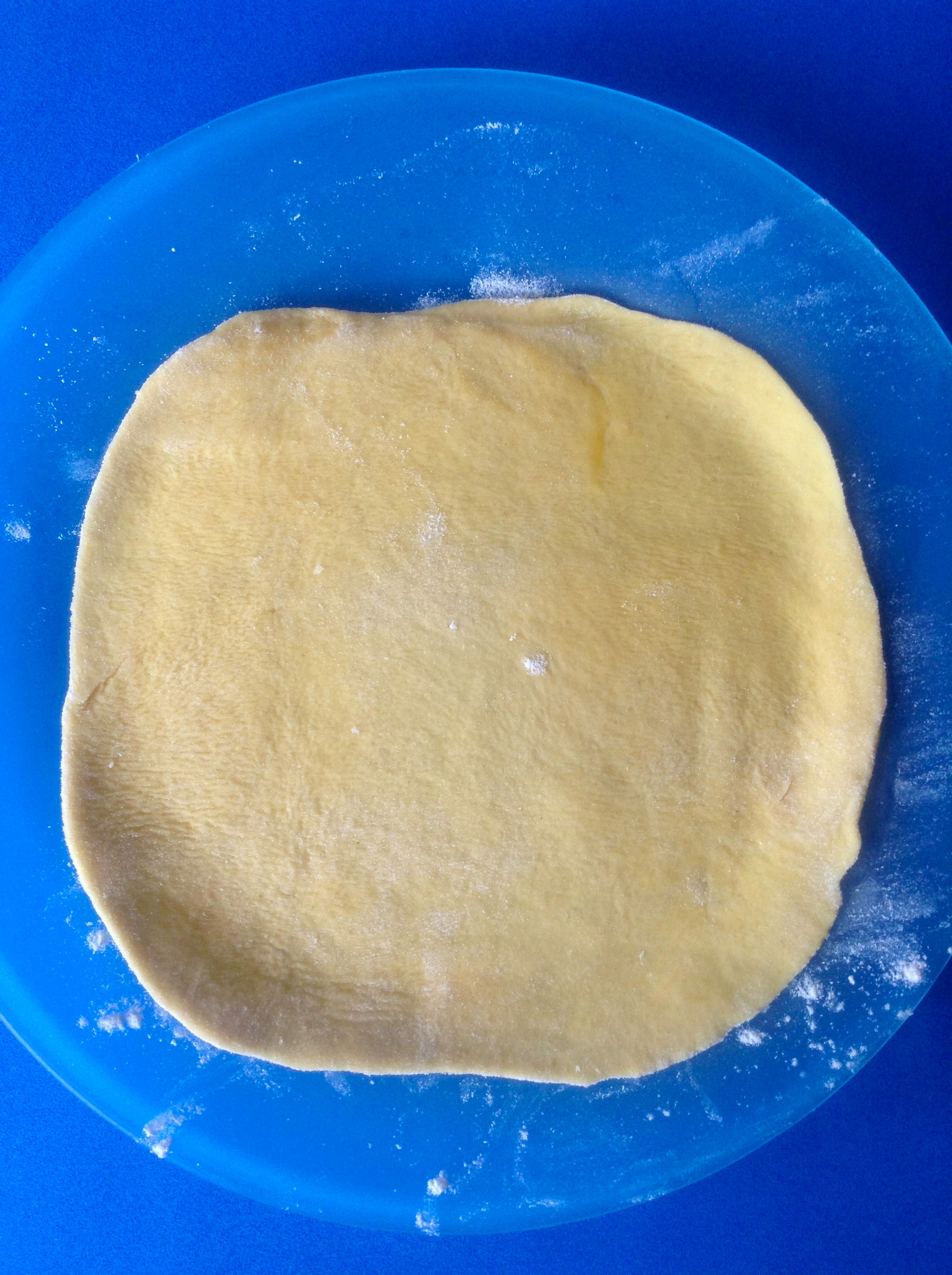 Derrito la margarina en una sartén con un poco de achiote. Cuando se haya derretido cuelo el achiote, dejo templar la margarina y luego la mezclo con la harina, un chorro de aceite de oliva, el agua y la sal hasta que quede una masa sin grumos.