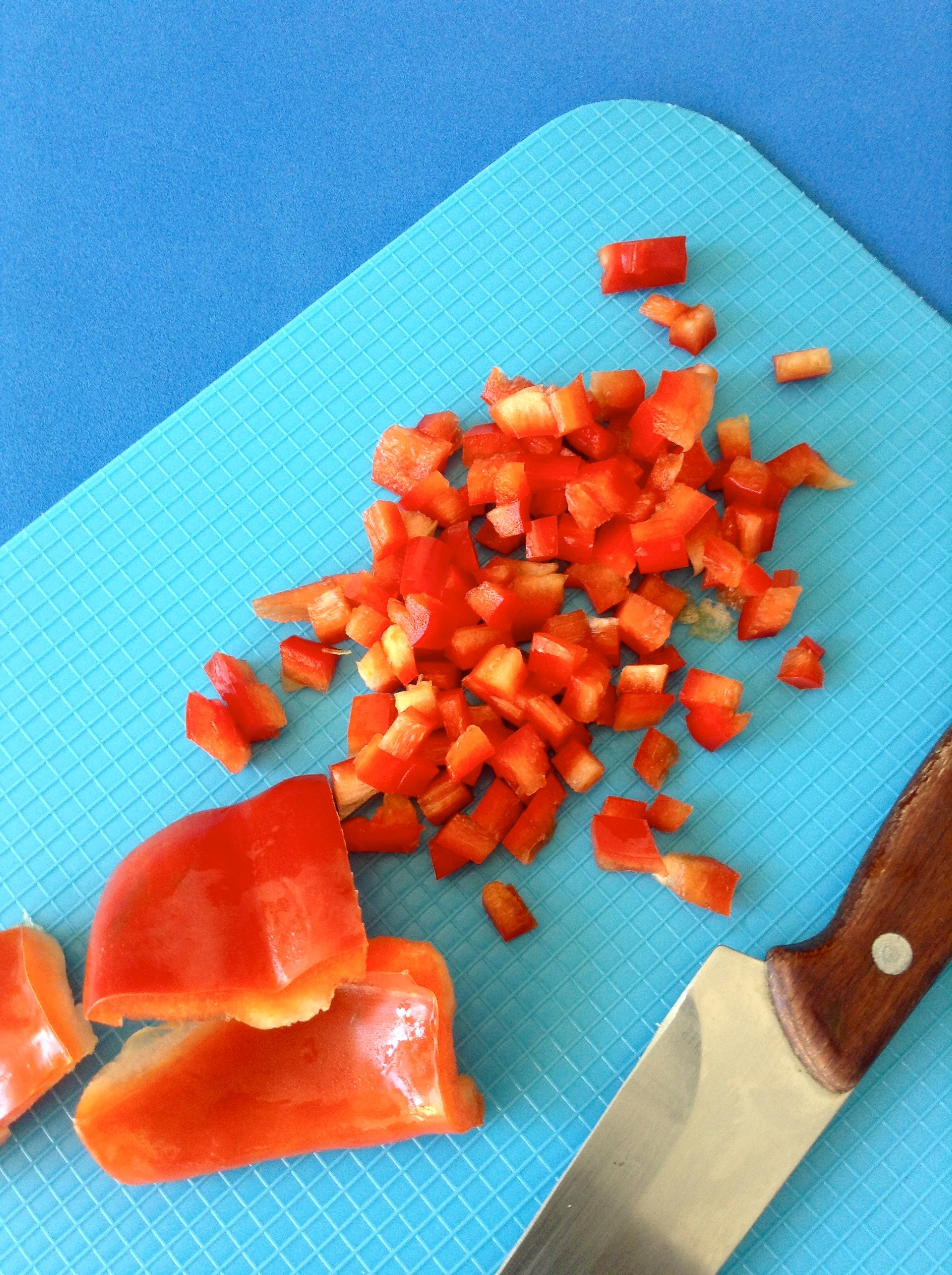 Para prepararlo, pico la cebolla y el pimiento rojo, y los rehogo en una sartén con aceite de oliva.