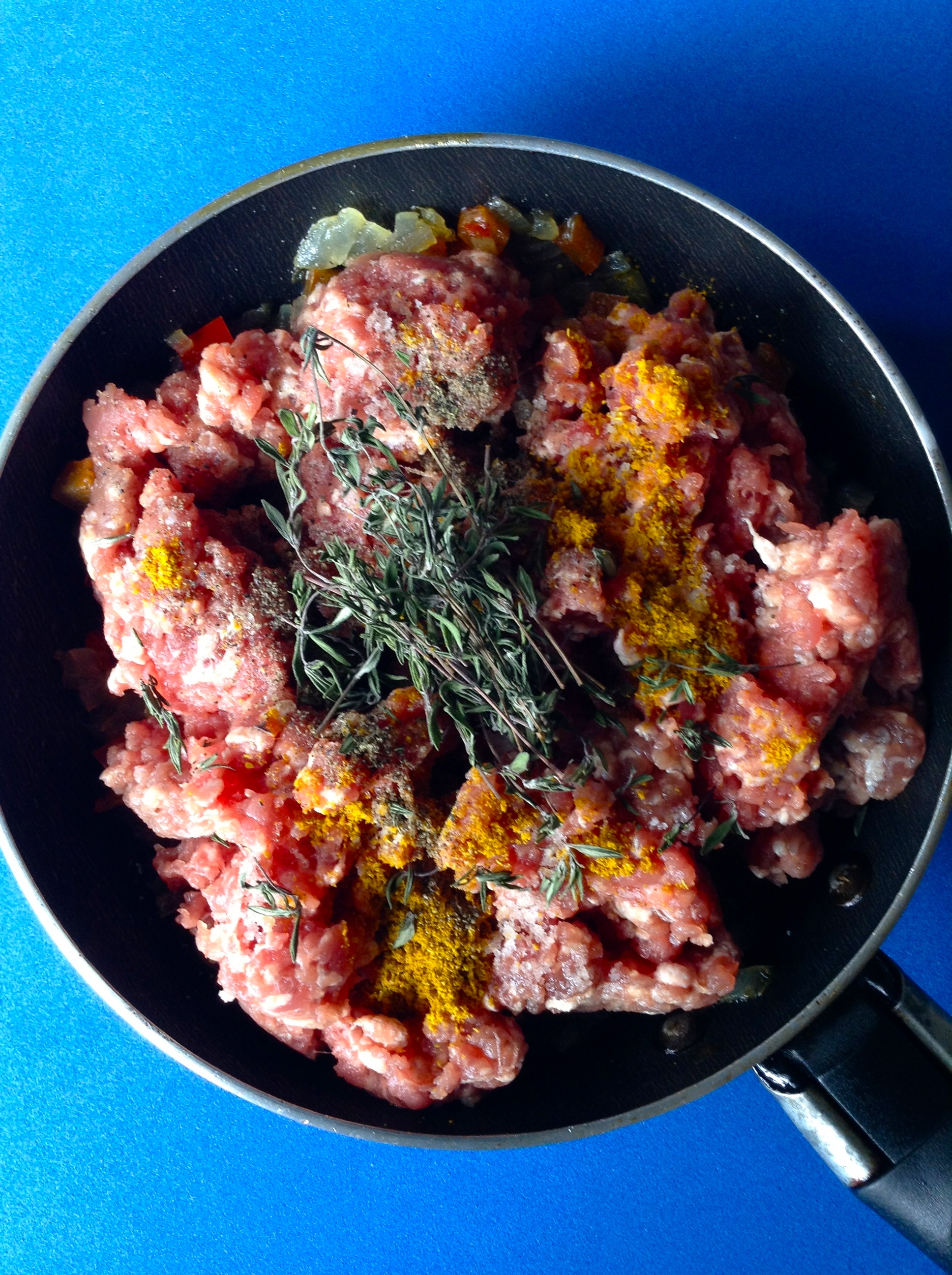 Cuando las verduras empiezan a ablandarse, añado la carne picada, la sal, la pimienta, el curry y unas ramitas de tomillo. Remuevo y voy quitando las ramitas del tomillo que se vayan soltando. Lo dejo cocinando durante un cuarto de hora, removiendo de vez en cuando para que la carne no se quede apelmazada.
