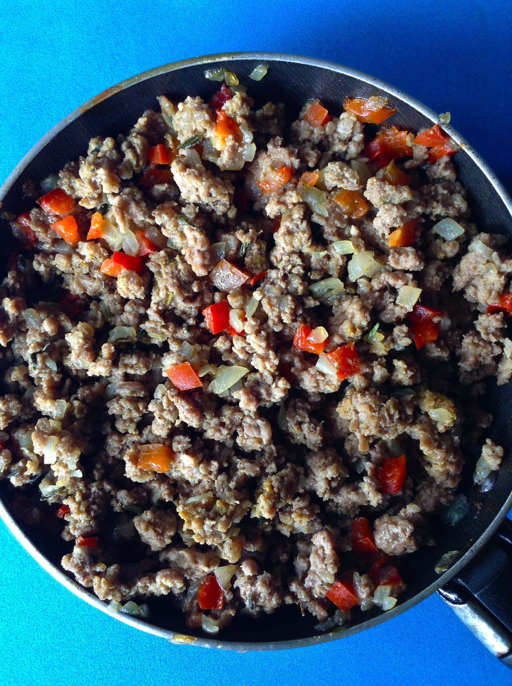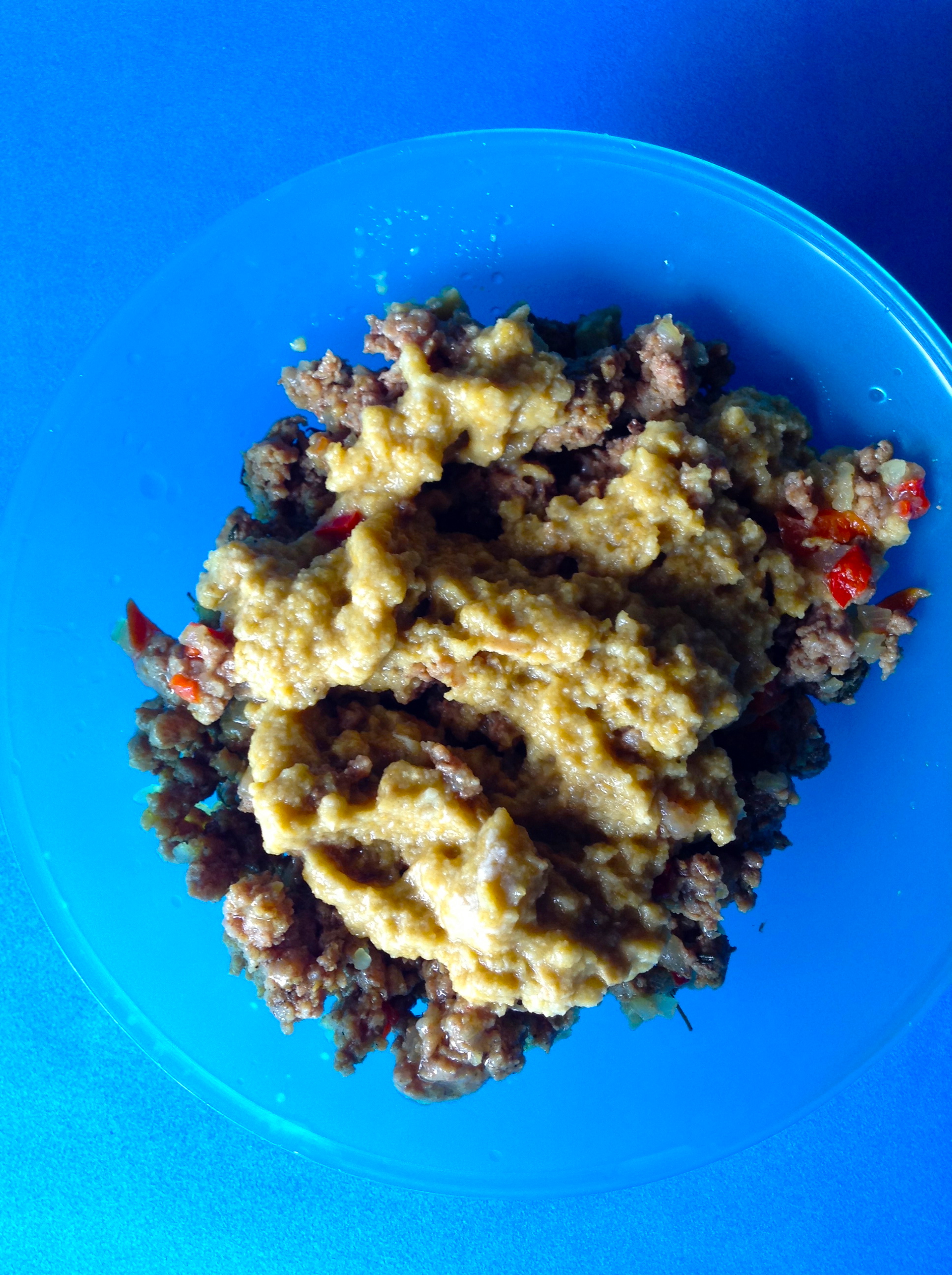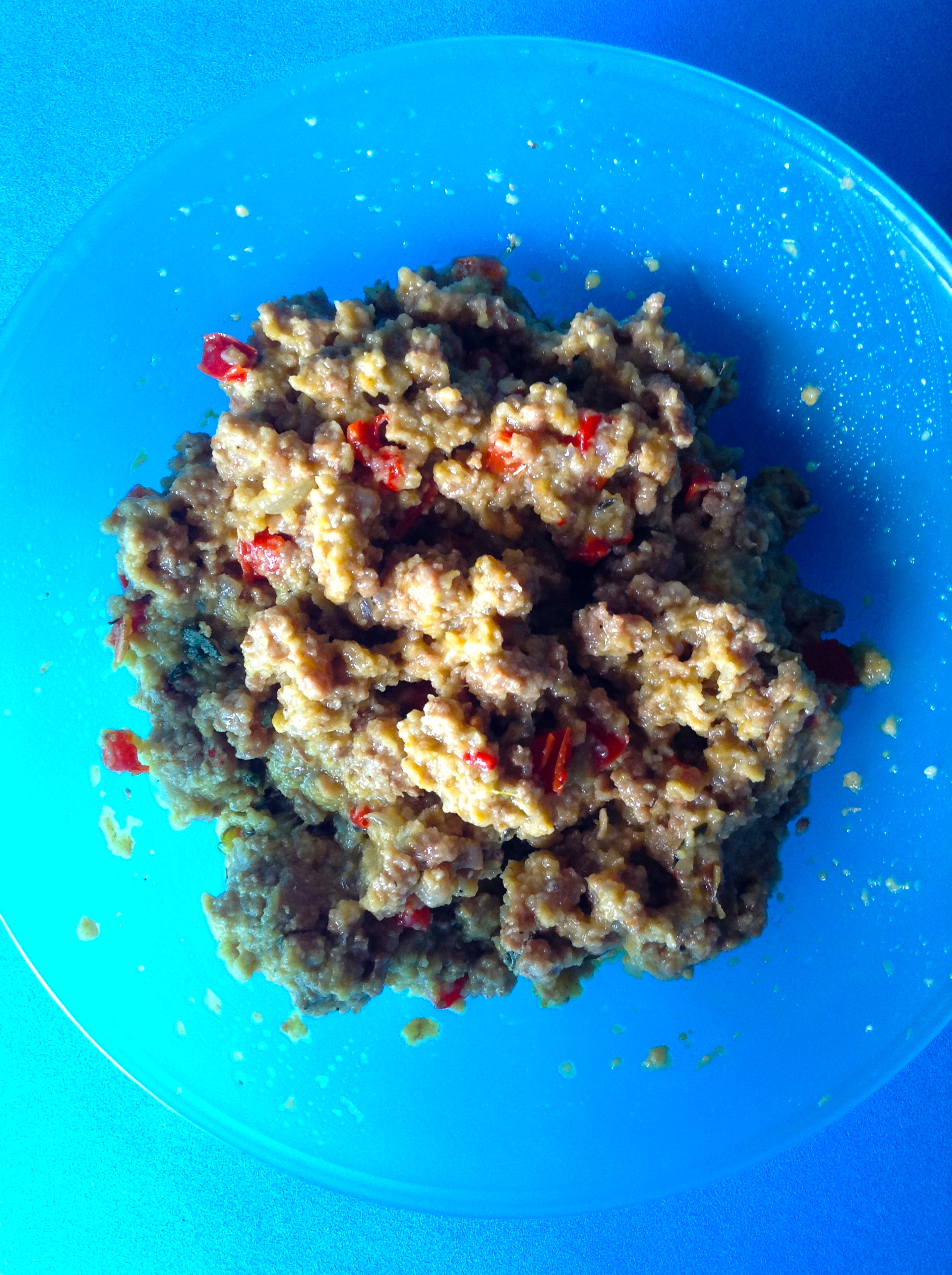 Entonces, lo junto con la carne hasta formar una masa compacta, suave y homogénea. Lo reservo.
