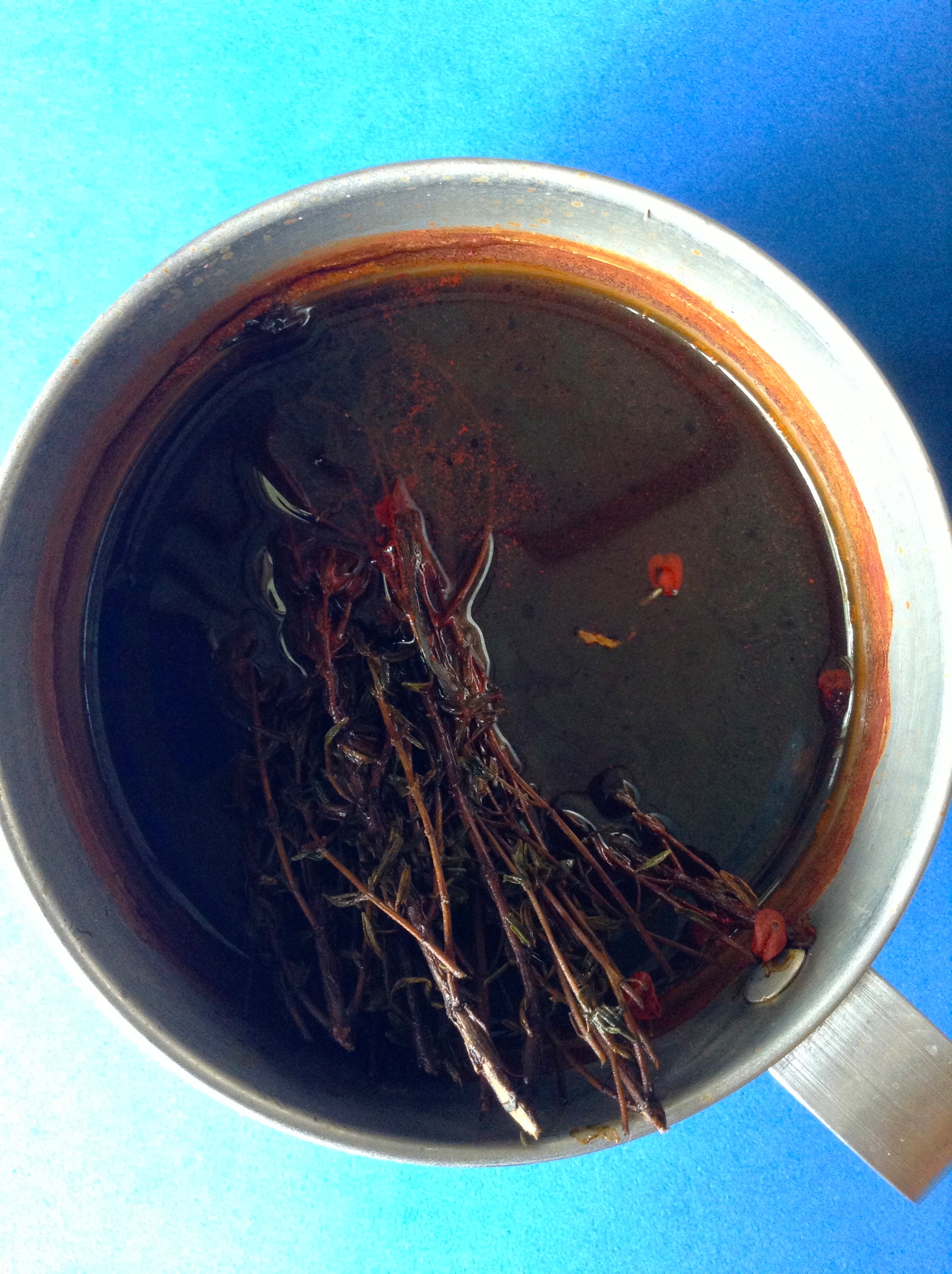 Mientras, pongo a fuego medio-alto un cazo con agua, un poco de achiote (o pimentón o azafrán), unas ramitas de tomillo y una pizca de sal. Cuando rompe a hervir bajo el fuego y lo dejo cociendo durante unos 10 ó 15 minutos. Lo cuelo y lo dejo templar.