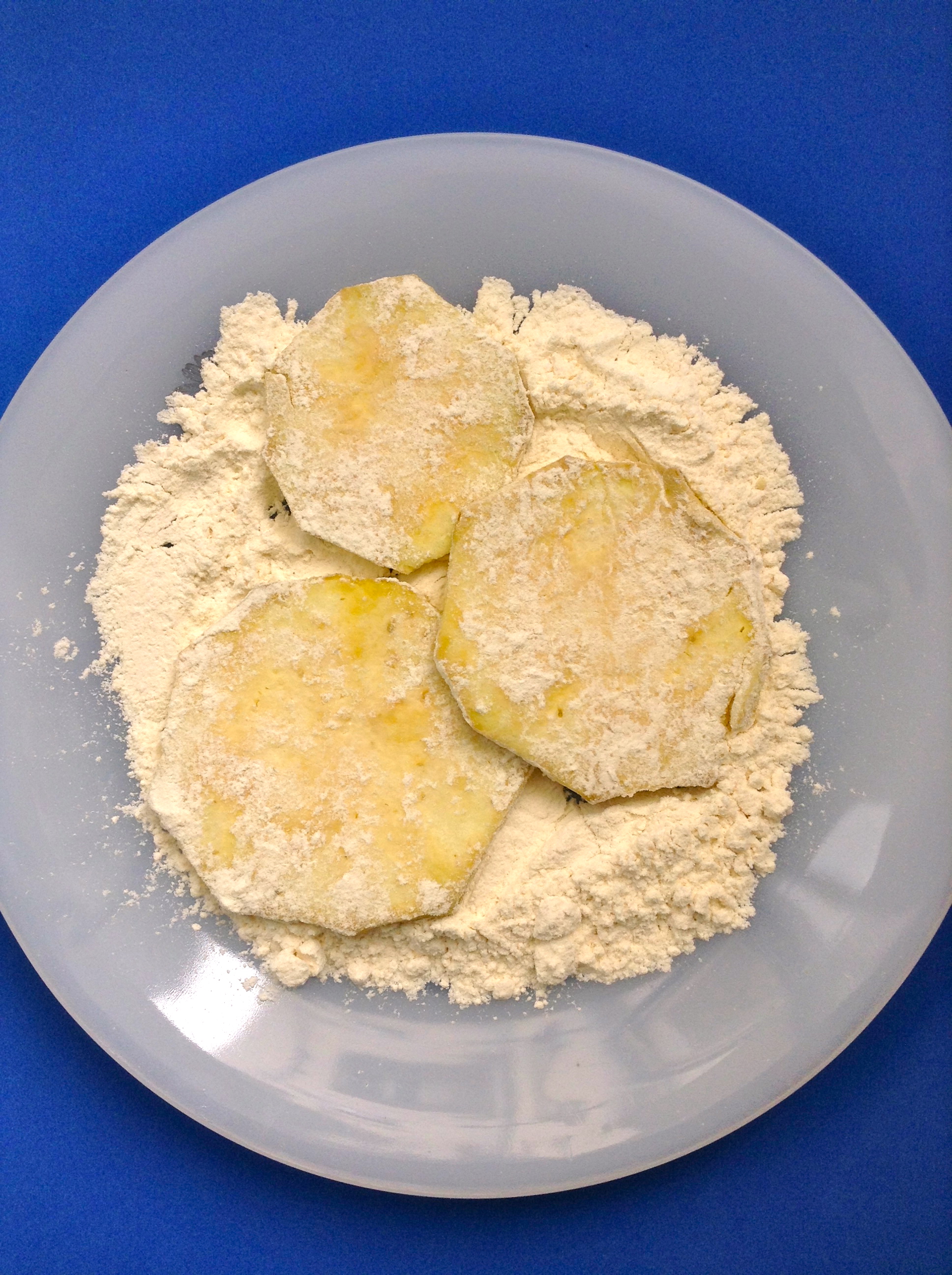 Corto las berenjenas en rodajas de 1 cm, las salo y las enharino. Unto una fuente con un poco de aceite y la cubro con las rodajas de berenjenas. Las meto en el horno durante 45 minutos a 180º.