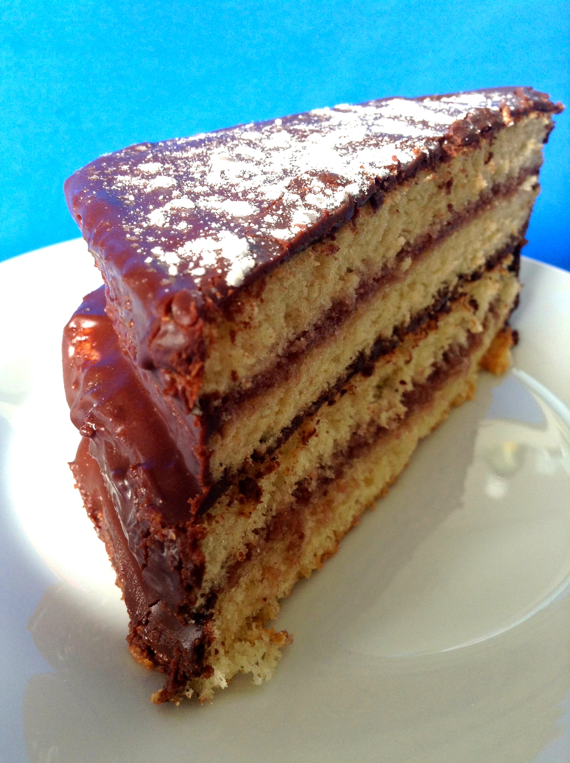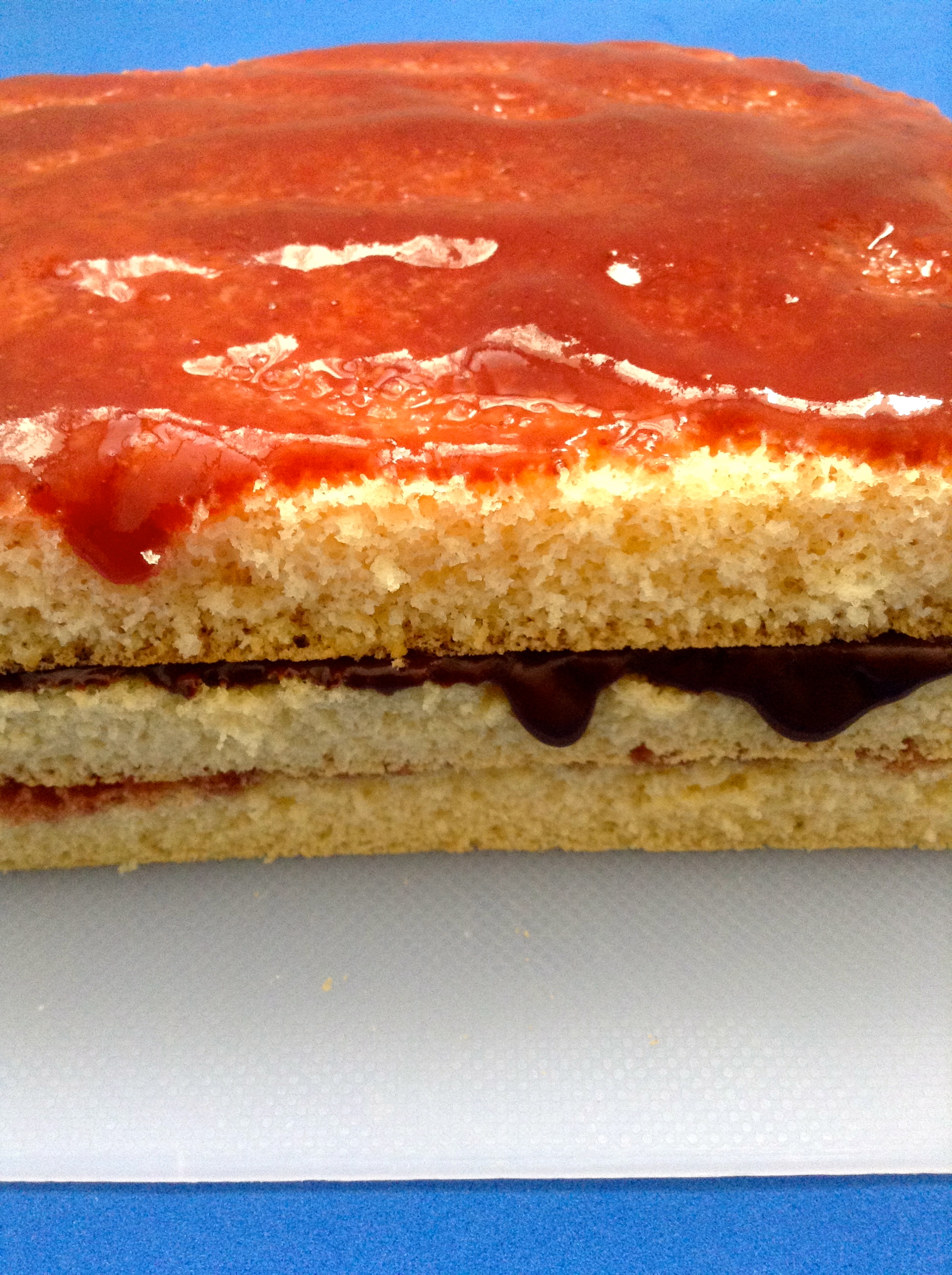Unto el primer trozo con mermelada de fresa. Lo tapo con otro trozo de bizcocho que cubro con chocolate. Lo tapo también con otro trozo de bizcocho y unto lo que queda de mermelada. Lo tapo y cubro la tarta con el resto de chocolate.
