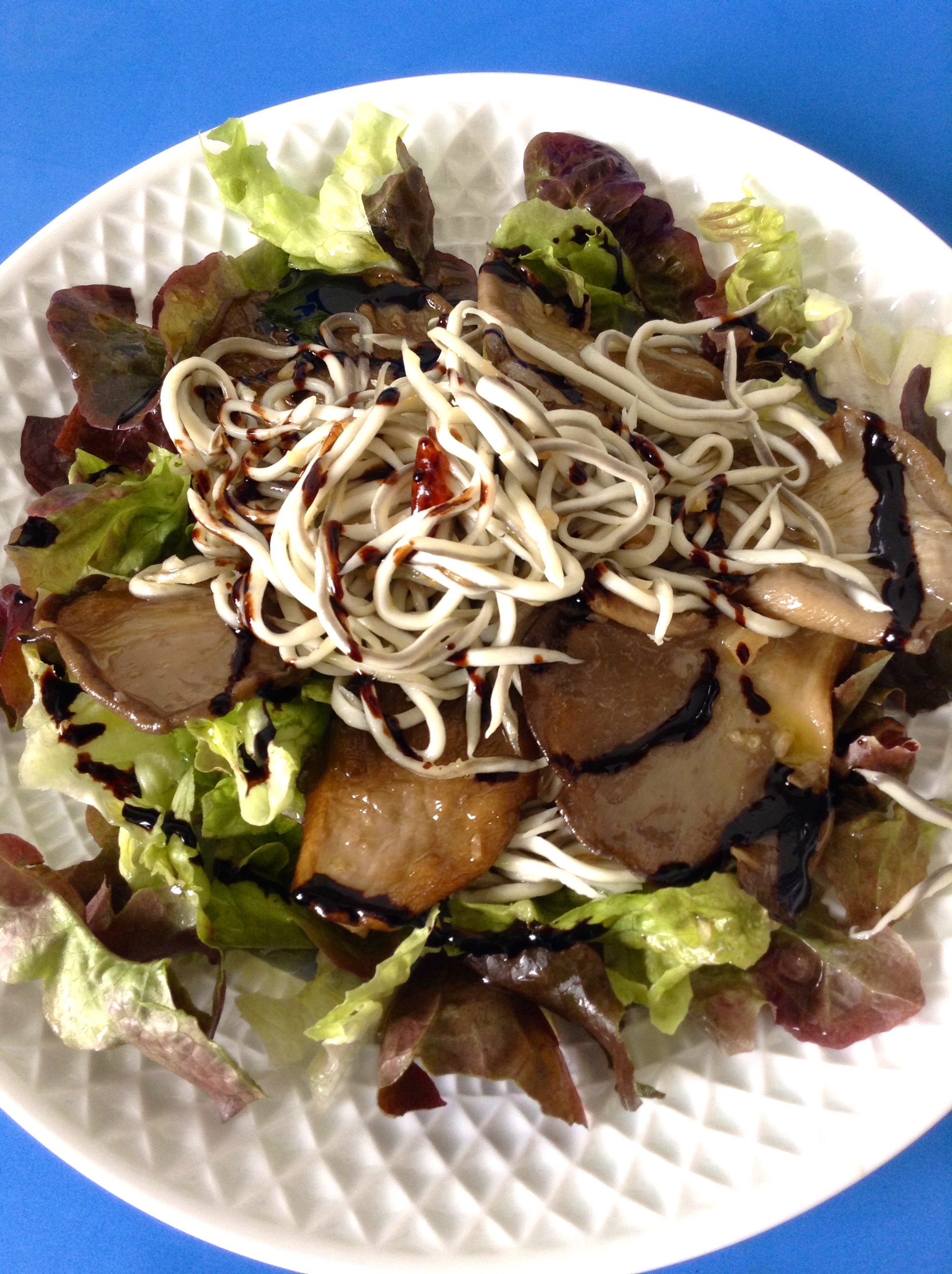 En un plato, coloco una cama de lechuga, la salo y sobre ella pongo una ración de setas y otra de gulas.