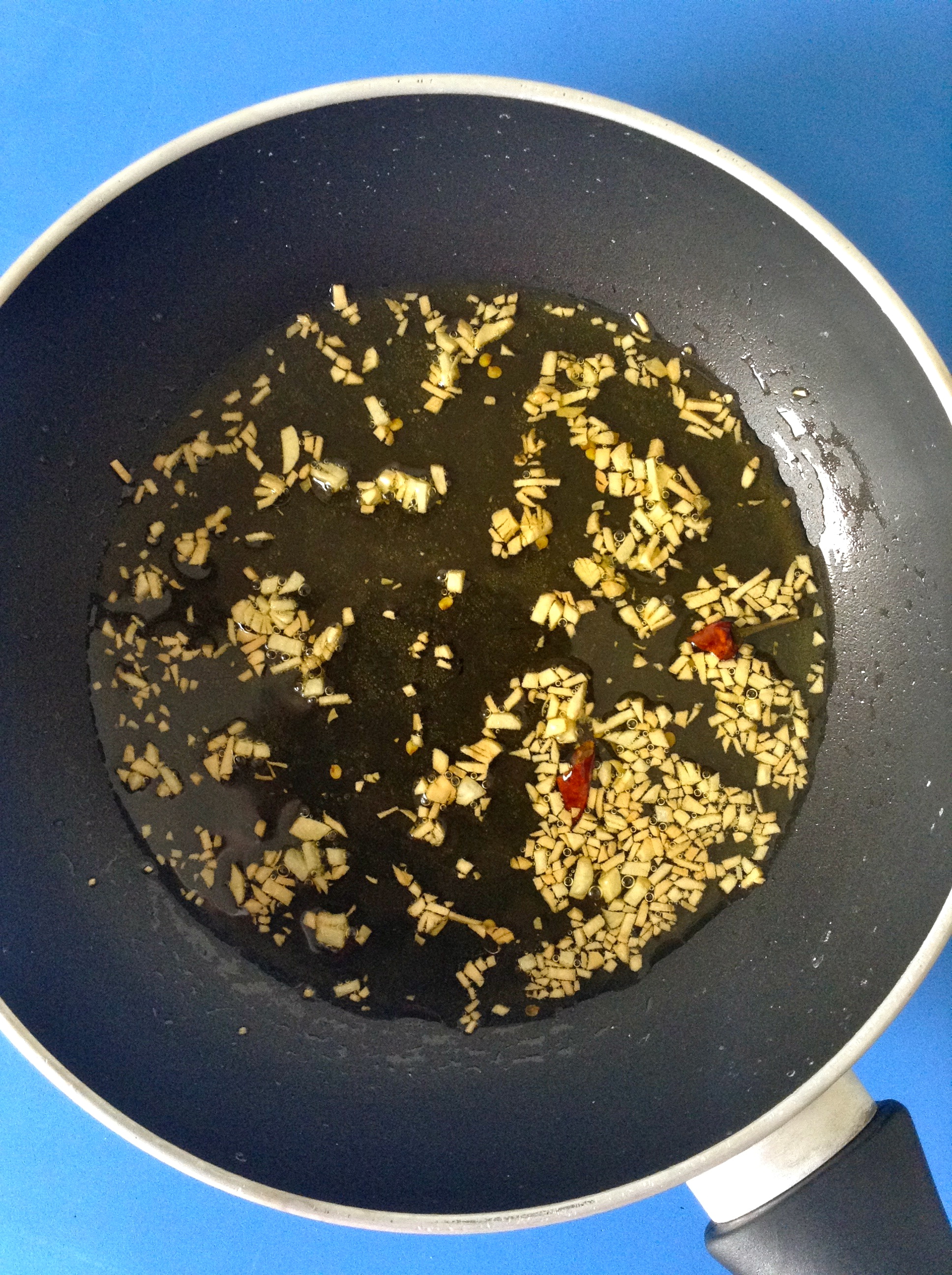 Mientras, echo la otra mitad de ajo y las cayenas partidas por la mitad en otra sartén con aceite de oliva a fuego medio. Cuando el ajo está dorado, añado las gulas. Le doy una vuelta y las quito del fuego.