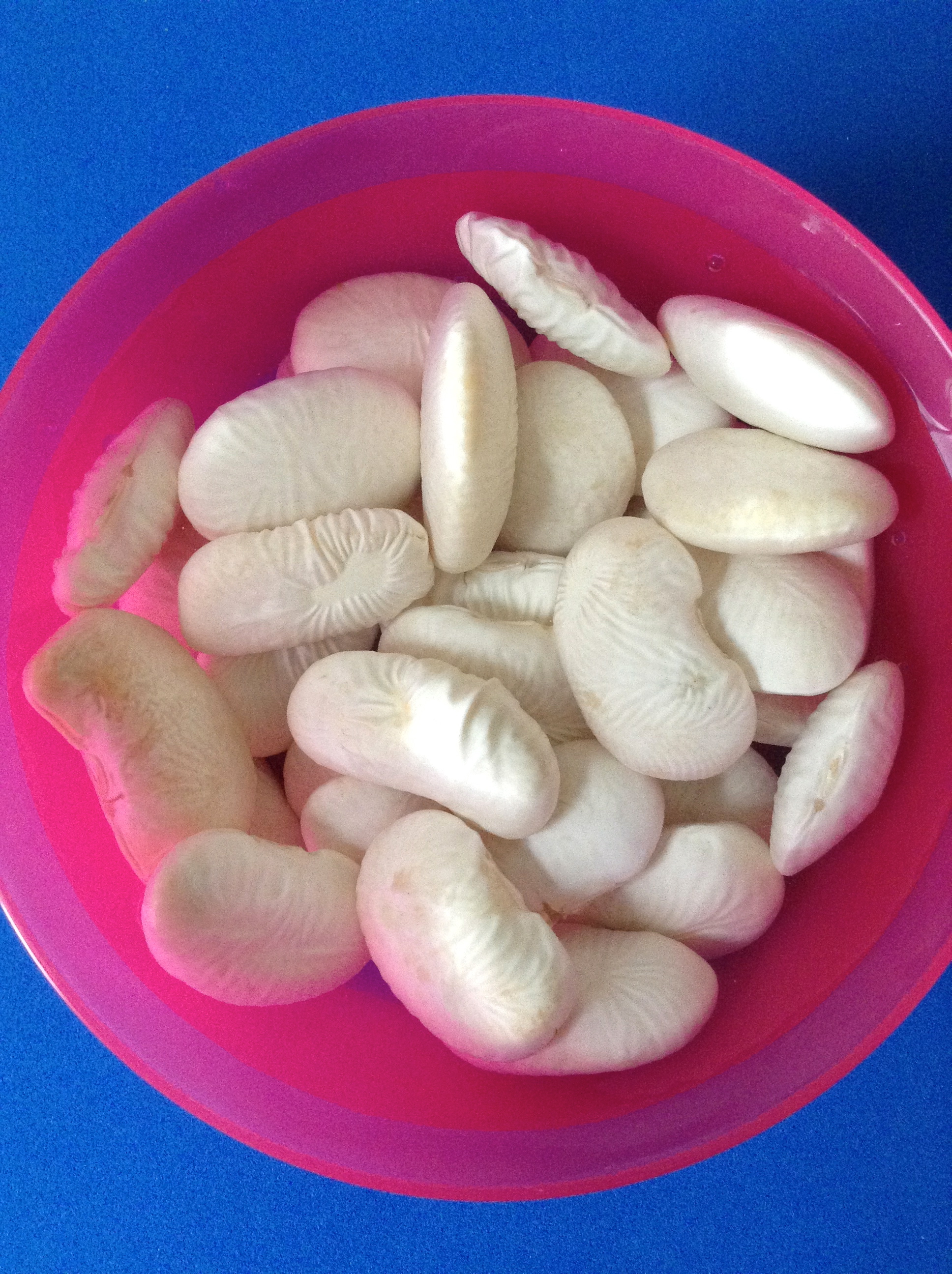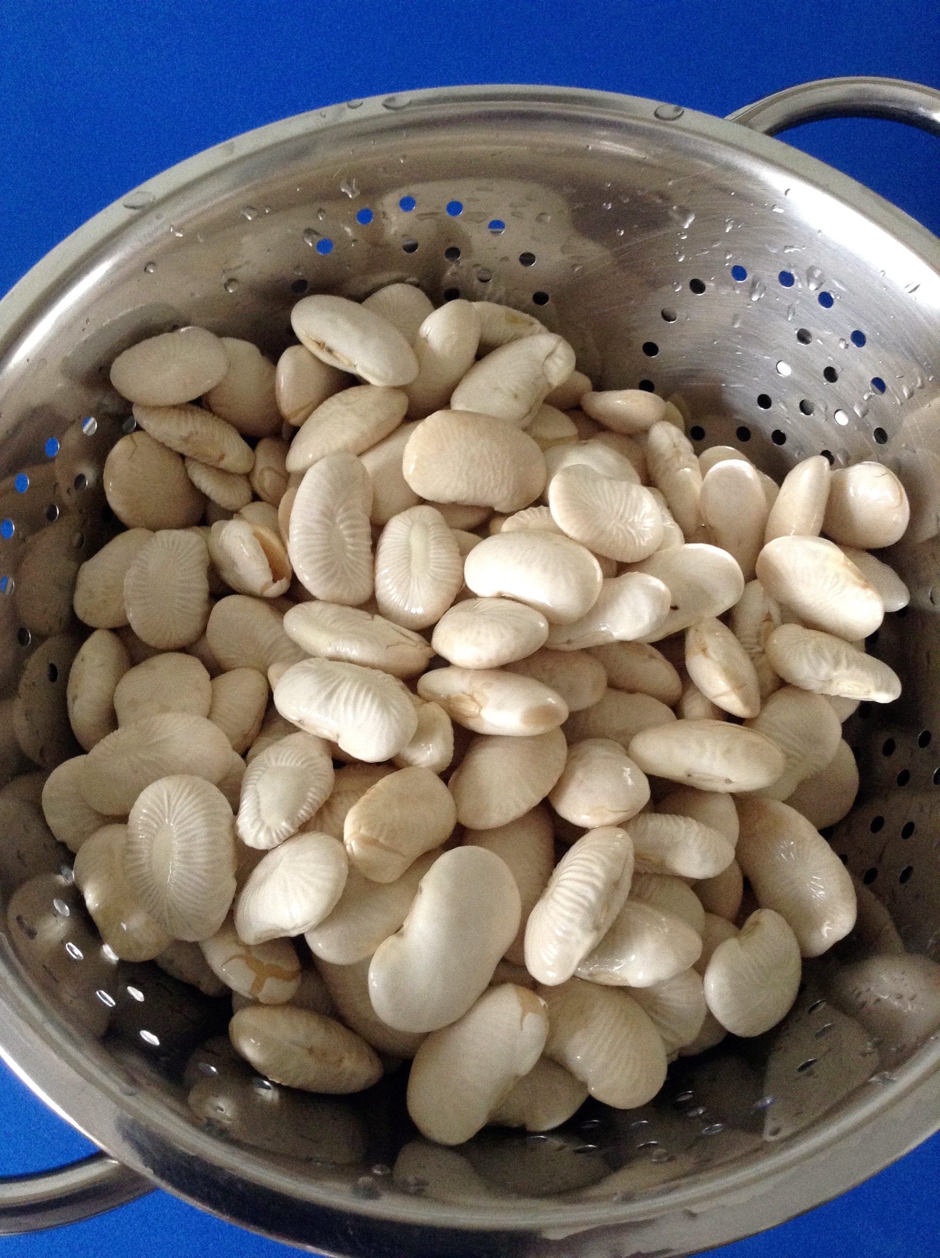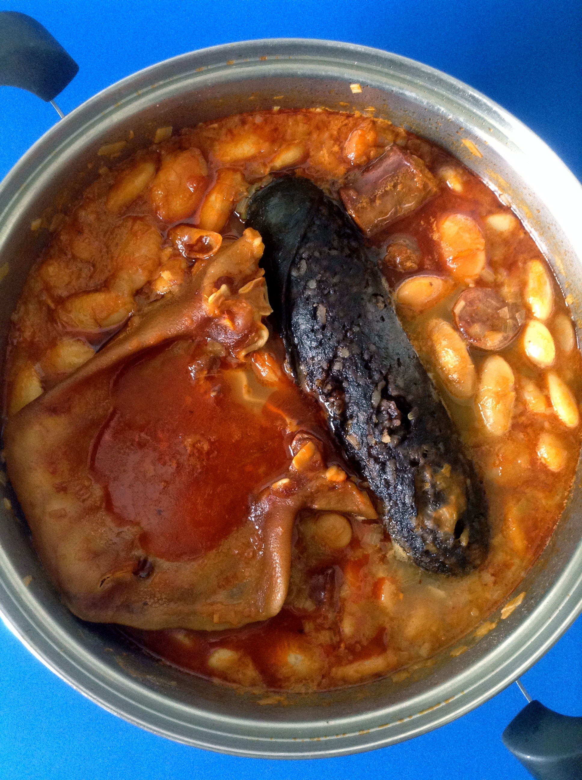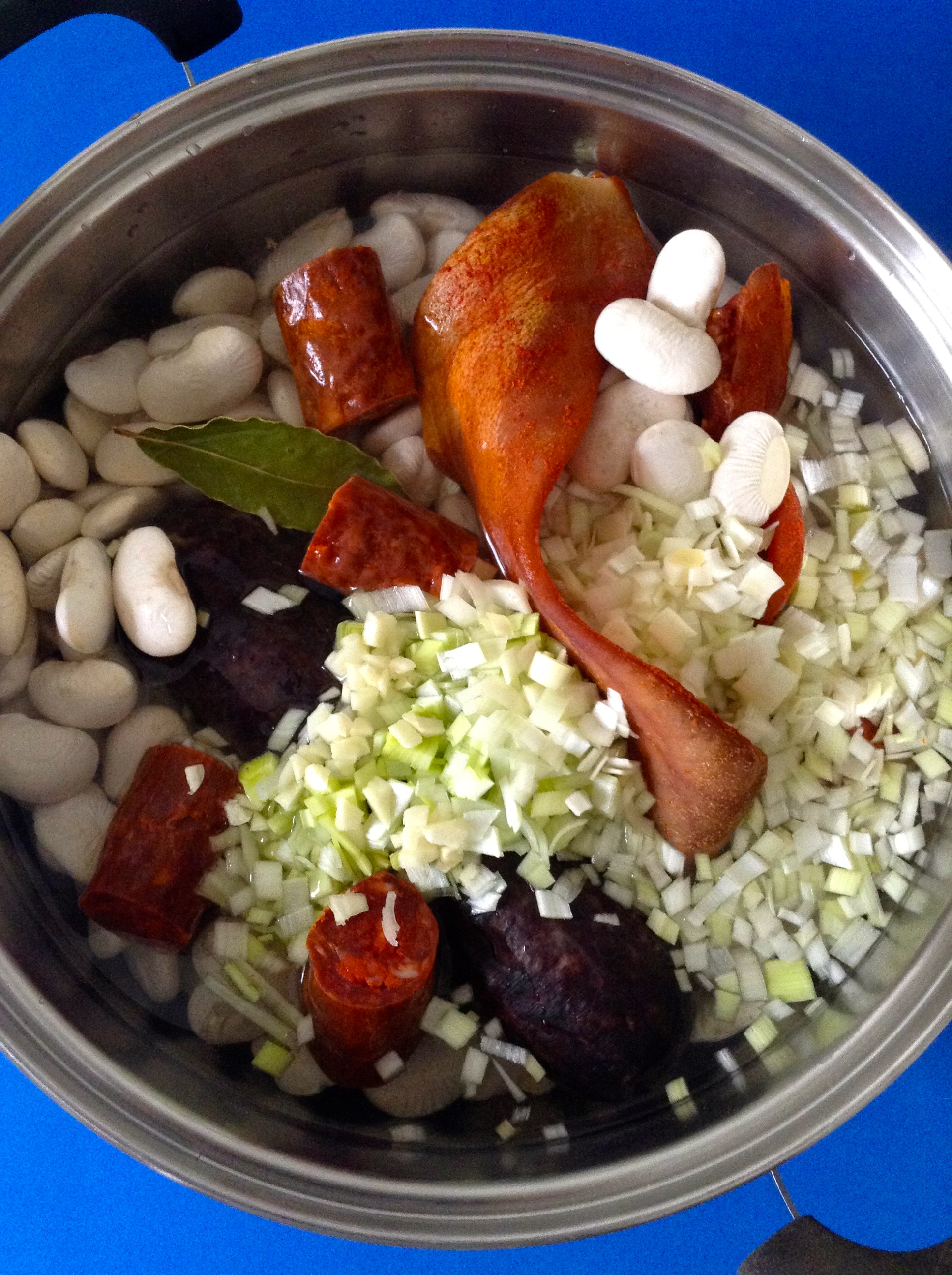 Cubro todo de agua y lo pongo a fuego alto hasta que hierva. Entonces, echo un chorro de agua fría para asustarlas (romper el hervor a fin de que no se despegue la piel del judión durante la cocción).