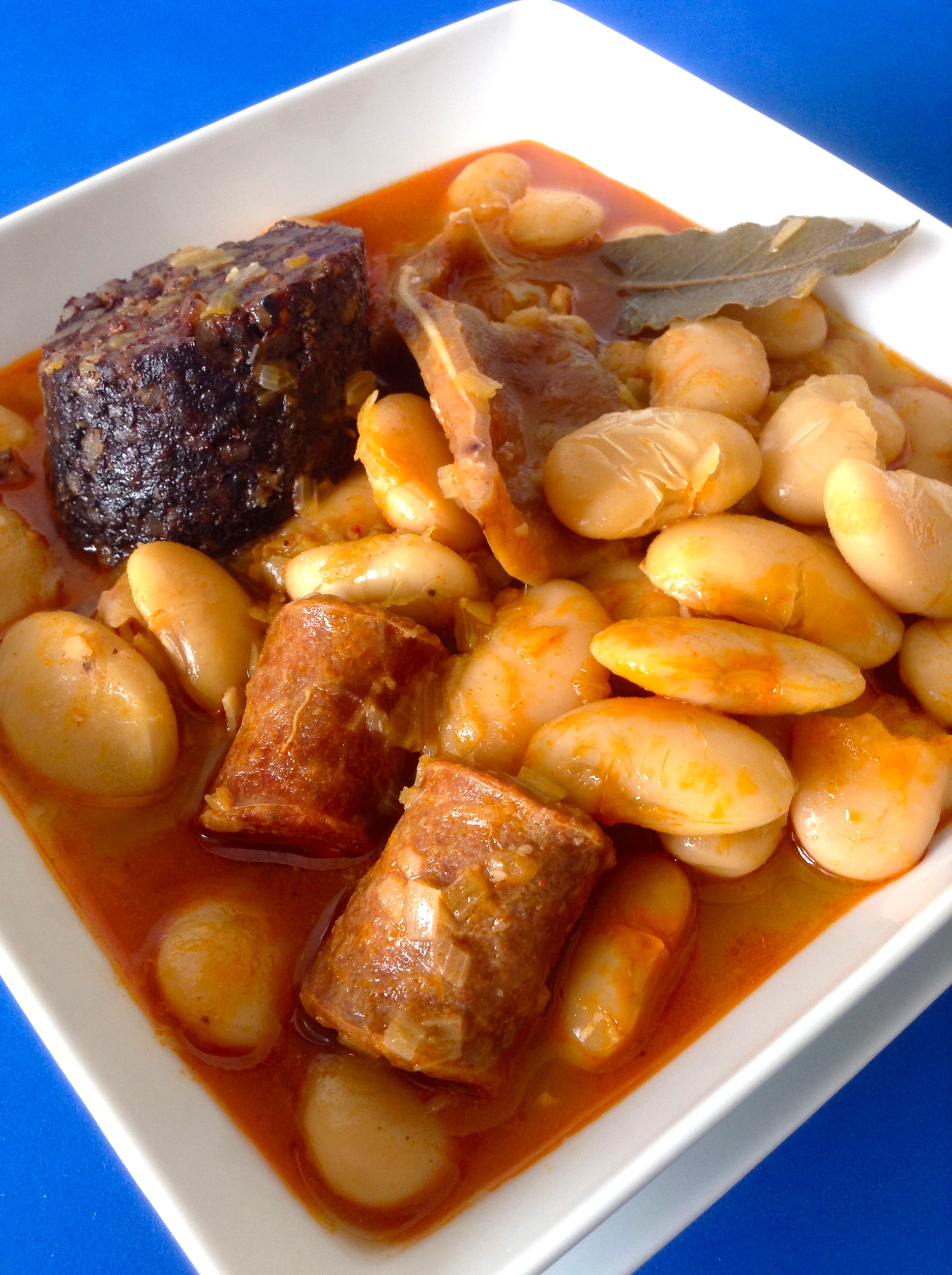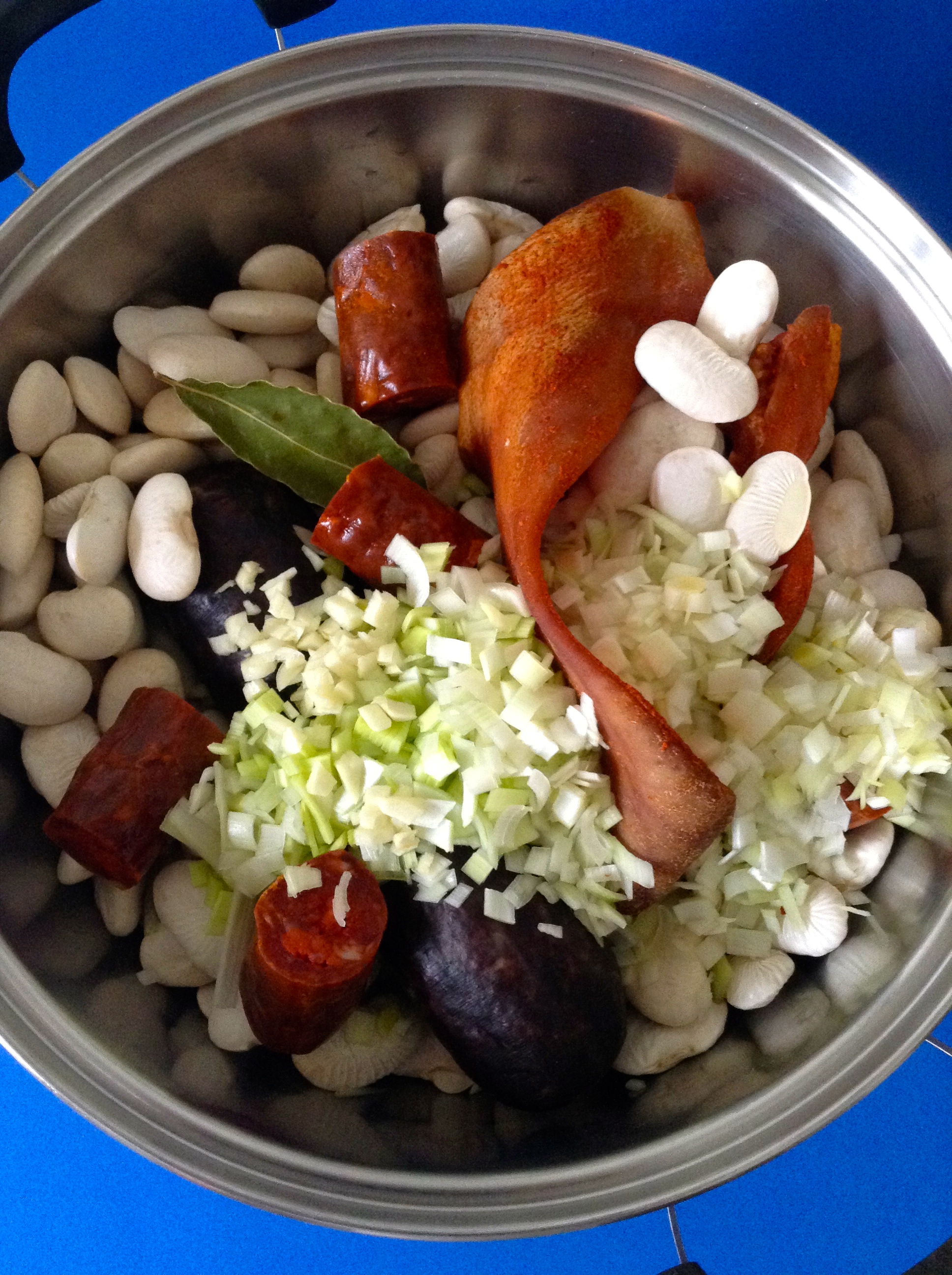 Pasado este tiempo los lavo y los pongo en una cazuela junto con el puerro picado, el laurel y la carne (si la morcilla está muy fresca, la echaré más tarde, con el rehogado de cebolla y ajo).