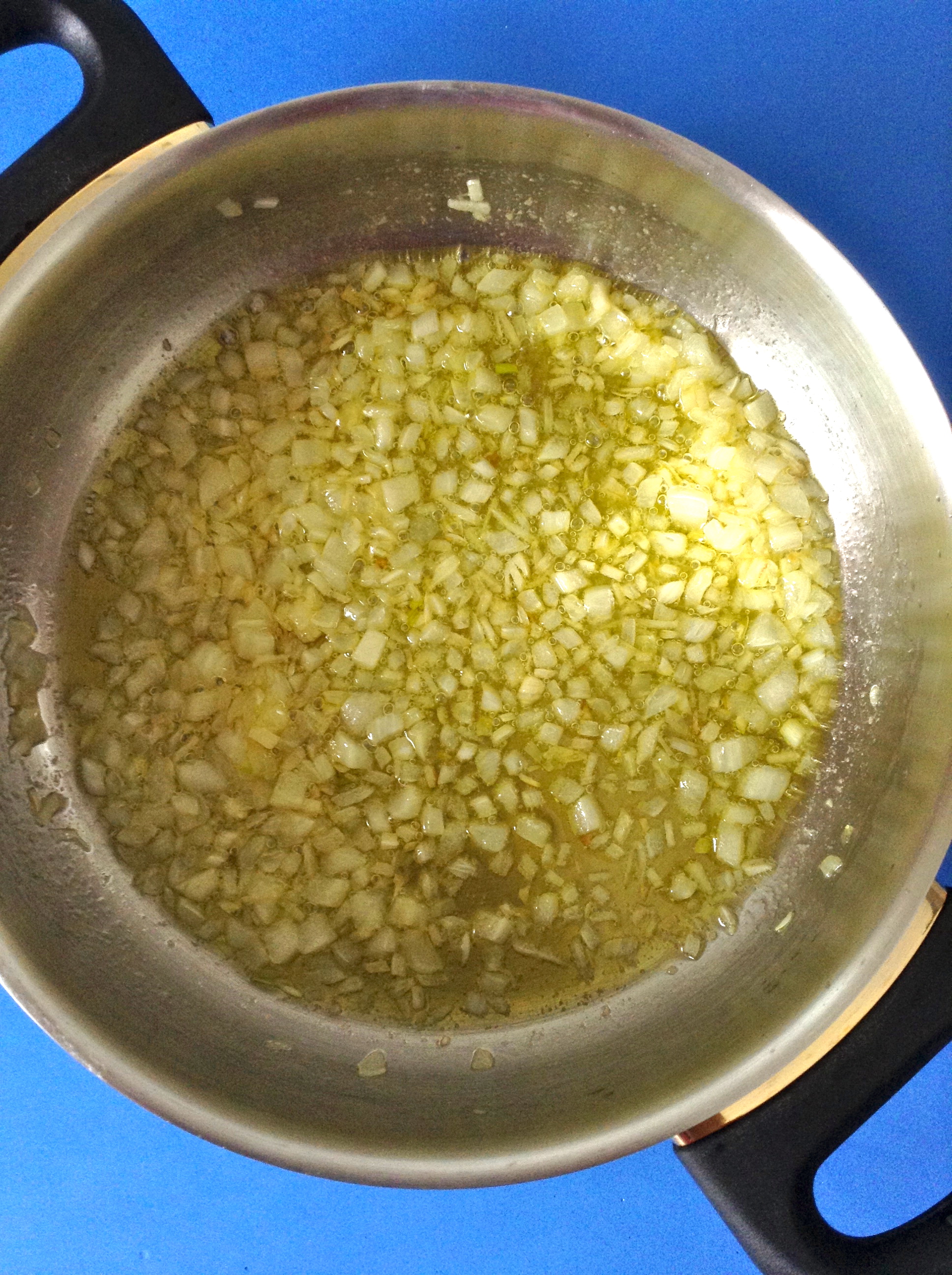 Pico y rehogo la cebolla y el ajo en una cazuela con aceite de oliva a fuego medio.