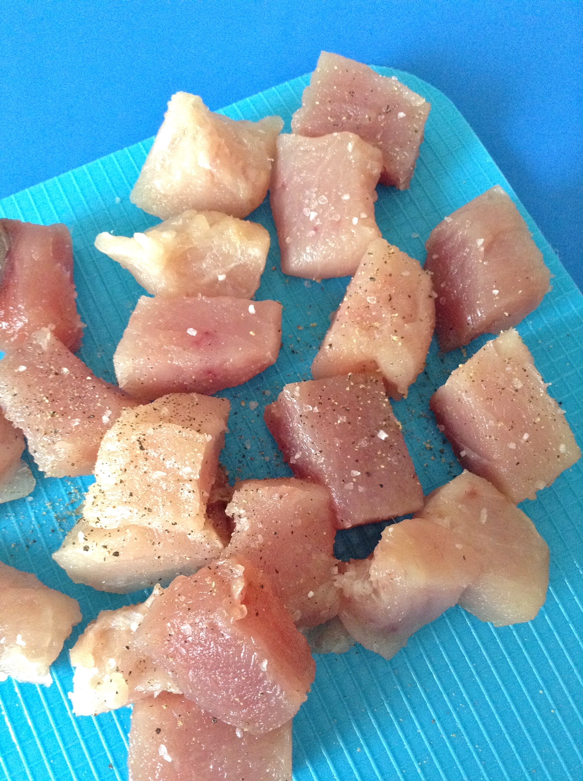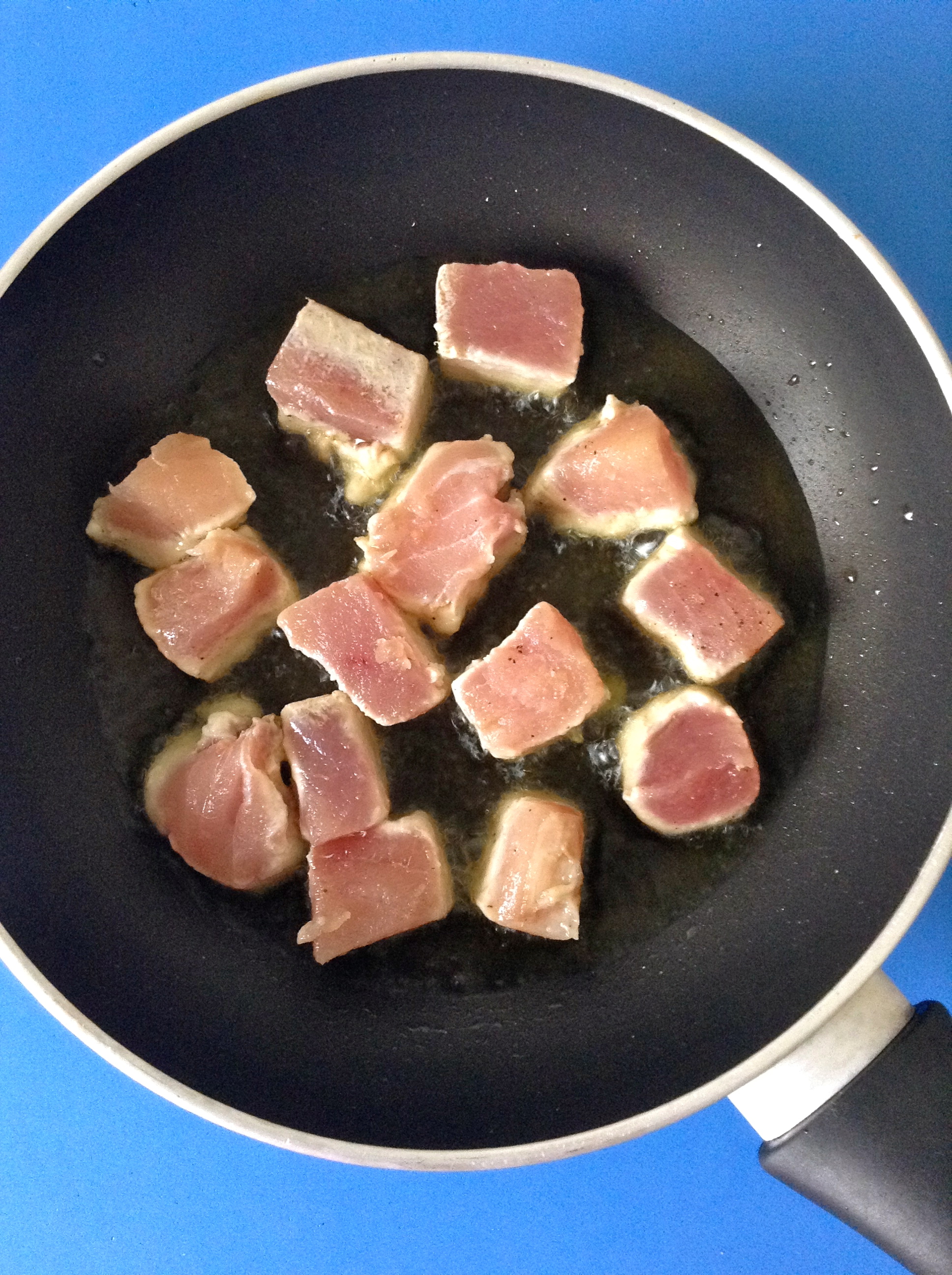 Mientras, troceo, salpimiento y sello el bonito.
