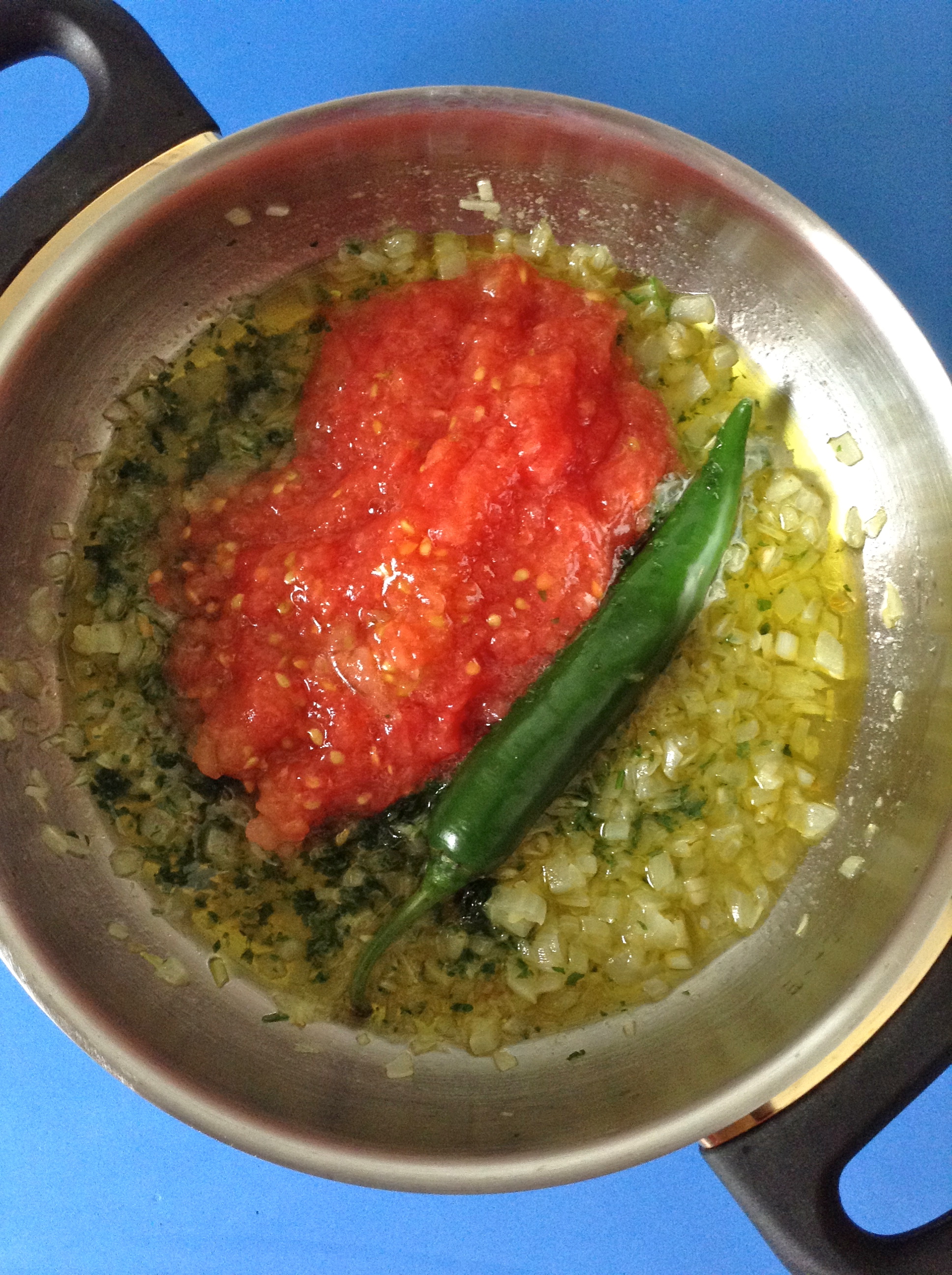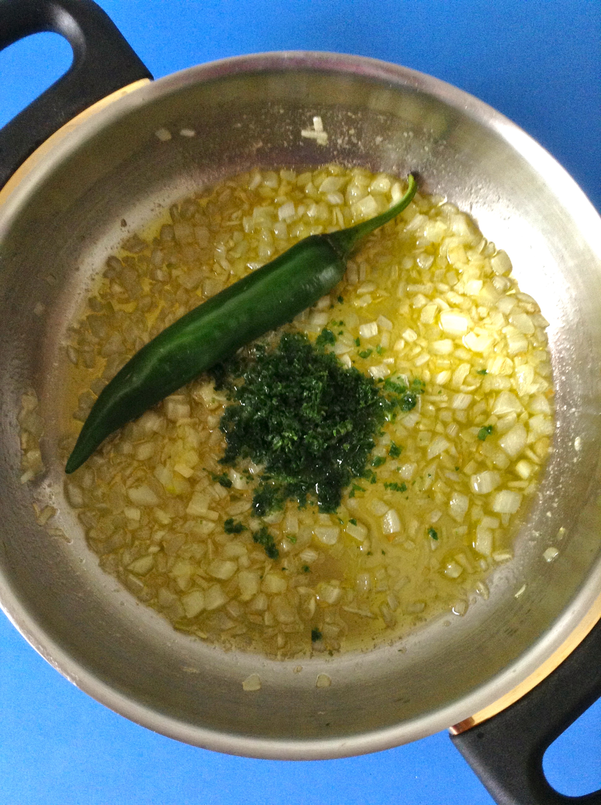 Cuando las verduras están pochadas, añado el perejil y la guindilla.