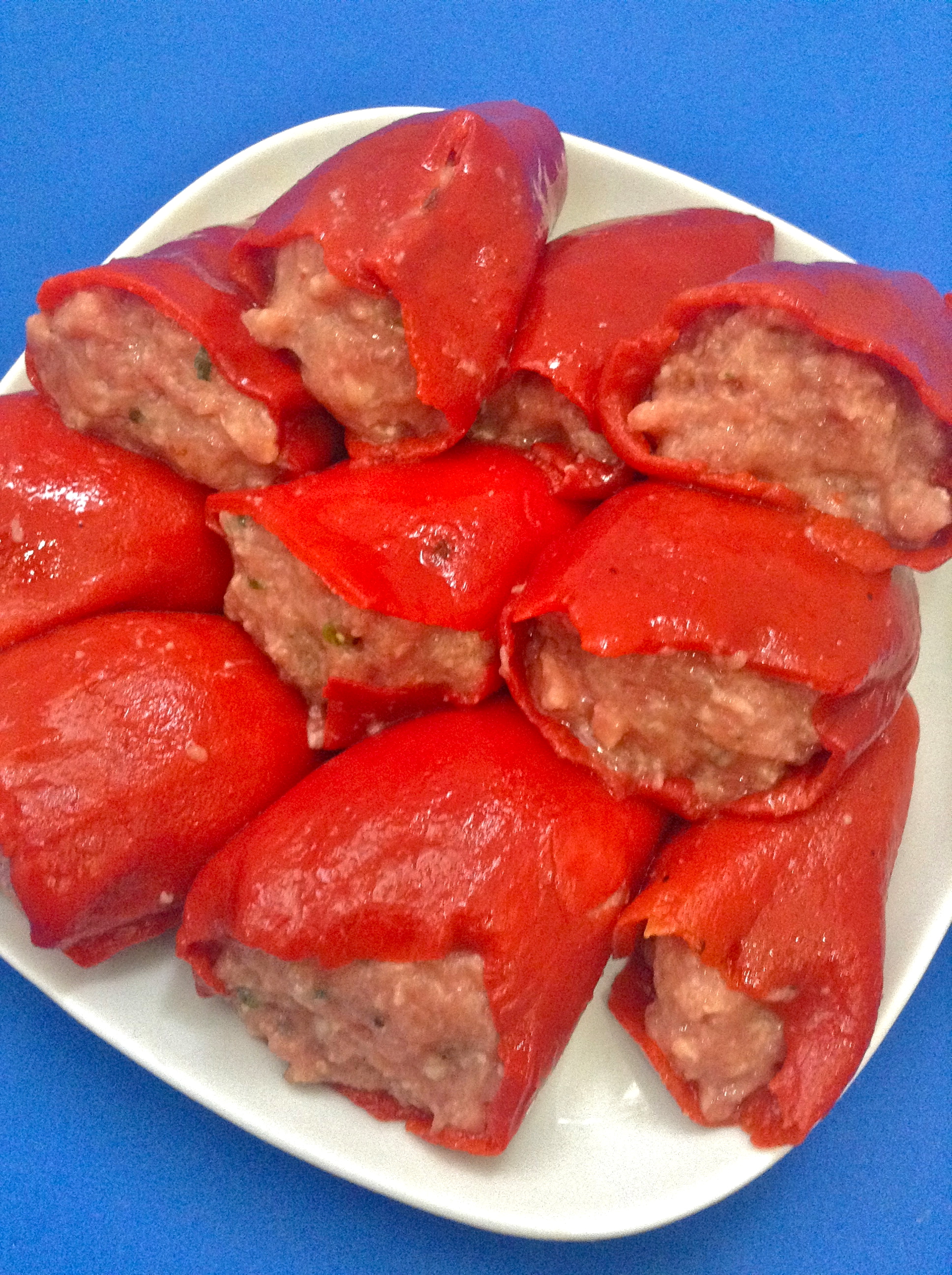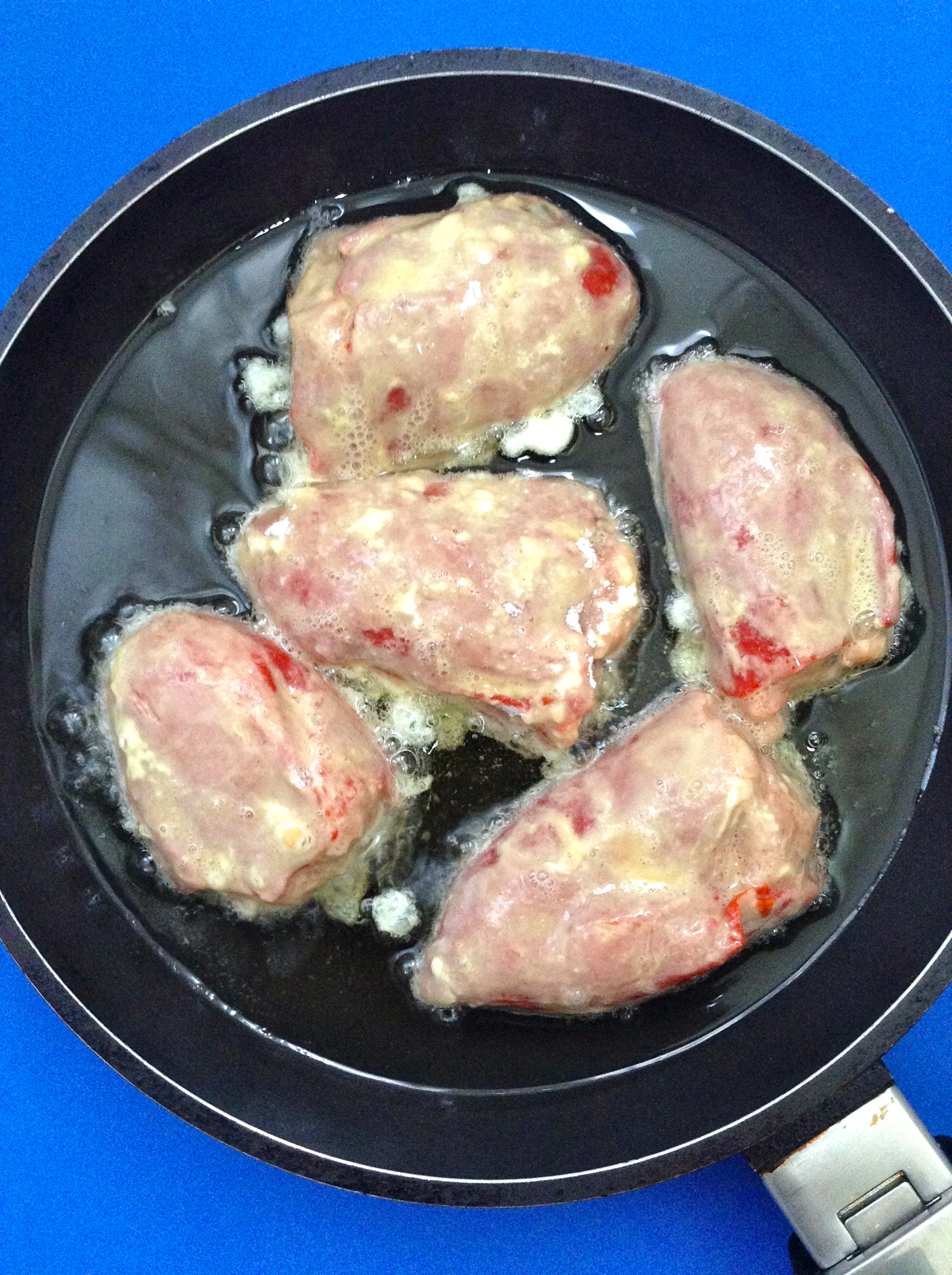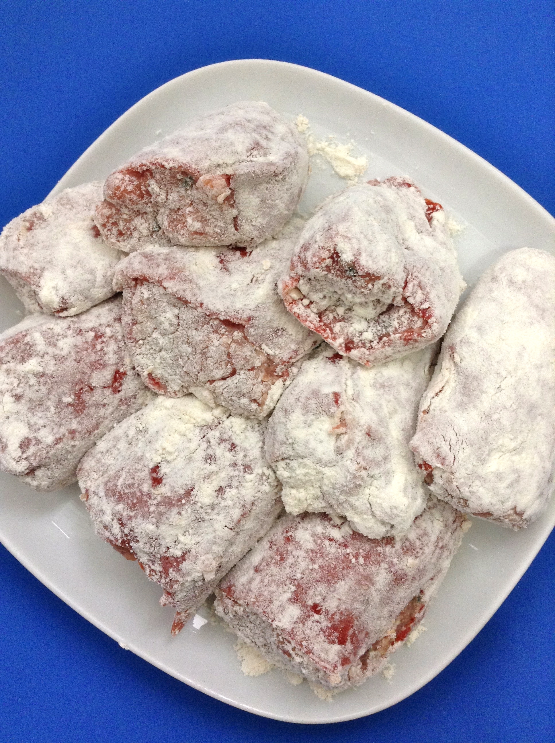 Relleno los pimientos del piquillo y los rebozo pasándolos primero por harina y luego por huevo batido.