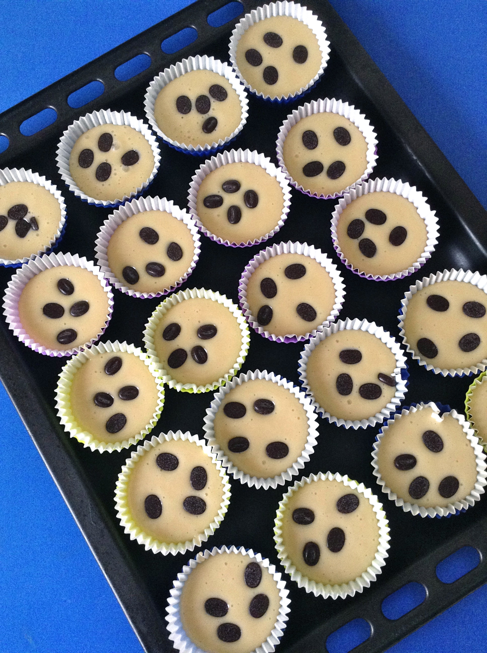 Coloco los moldes en la bandeja y pongo unas pepitas de chocolate en cada uno, presionando ligeramente en algunas pepitas para que luego con la cocción queden dentro de la magdalena.