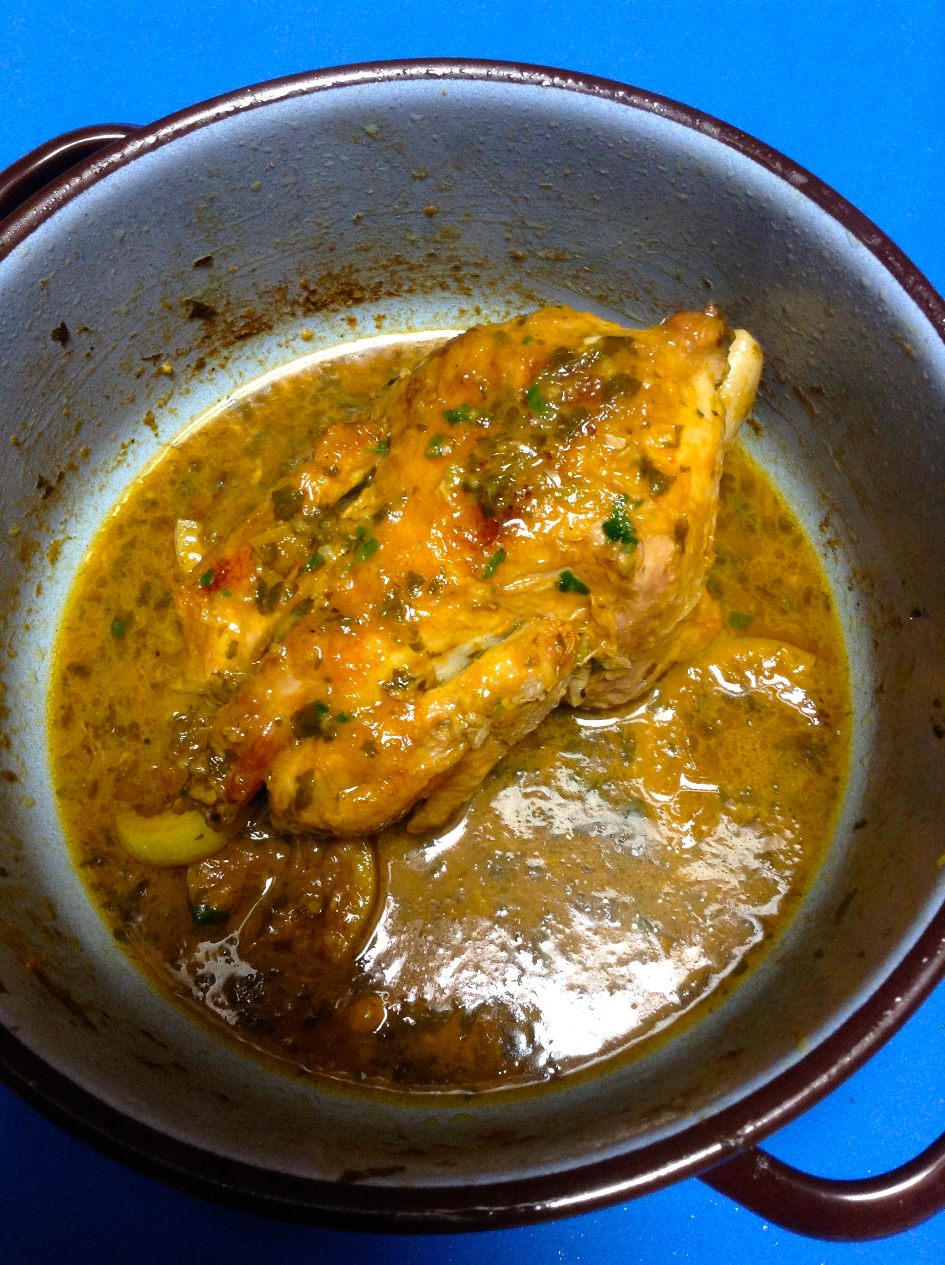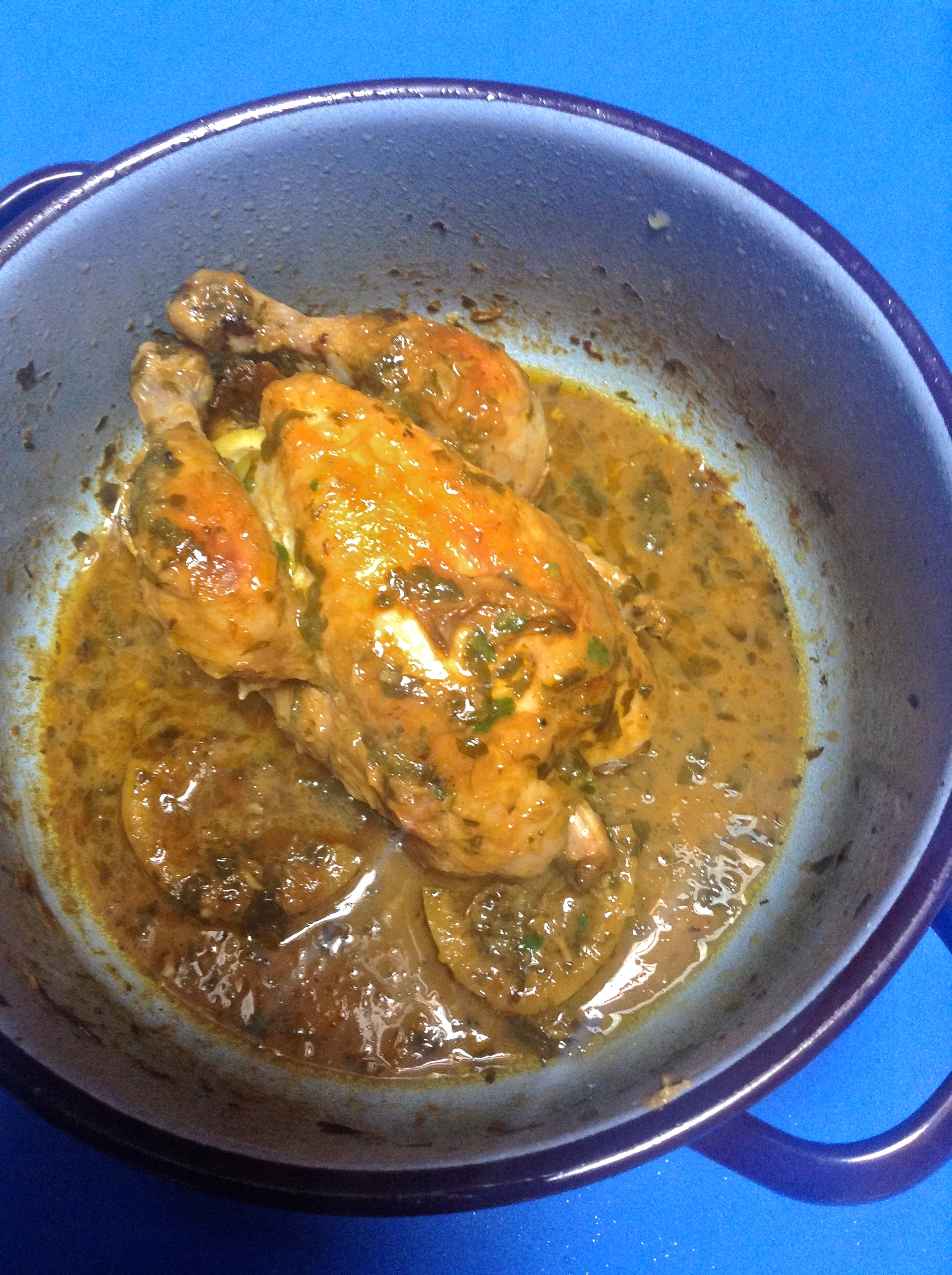 Cuando ya está bien dorado (tarda más o menos una media hora en dorarse bien), bajo el fuego de la cazuela al mínimo y vierto el majado y el limón. Le doy una vuelta y tapo la cazuela. Lo dejo asándose media hora más.