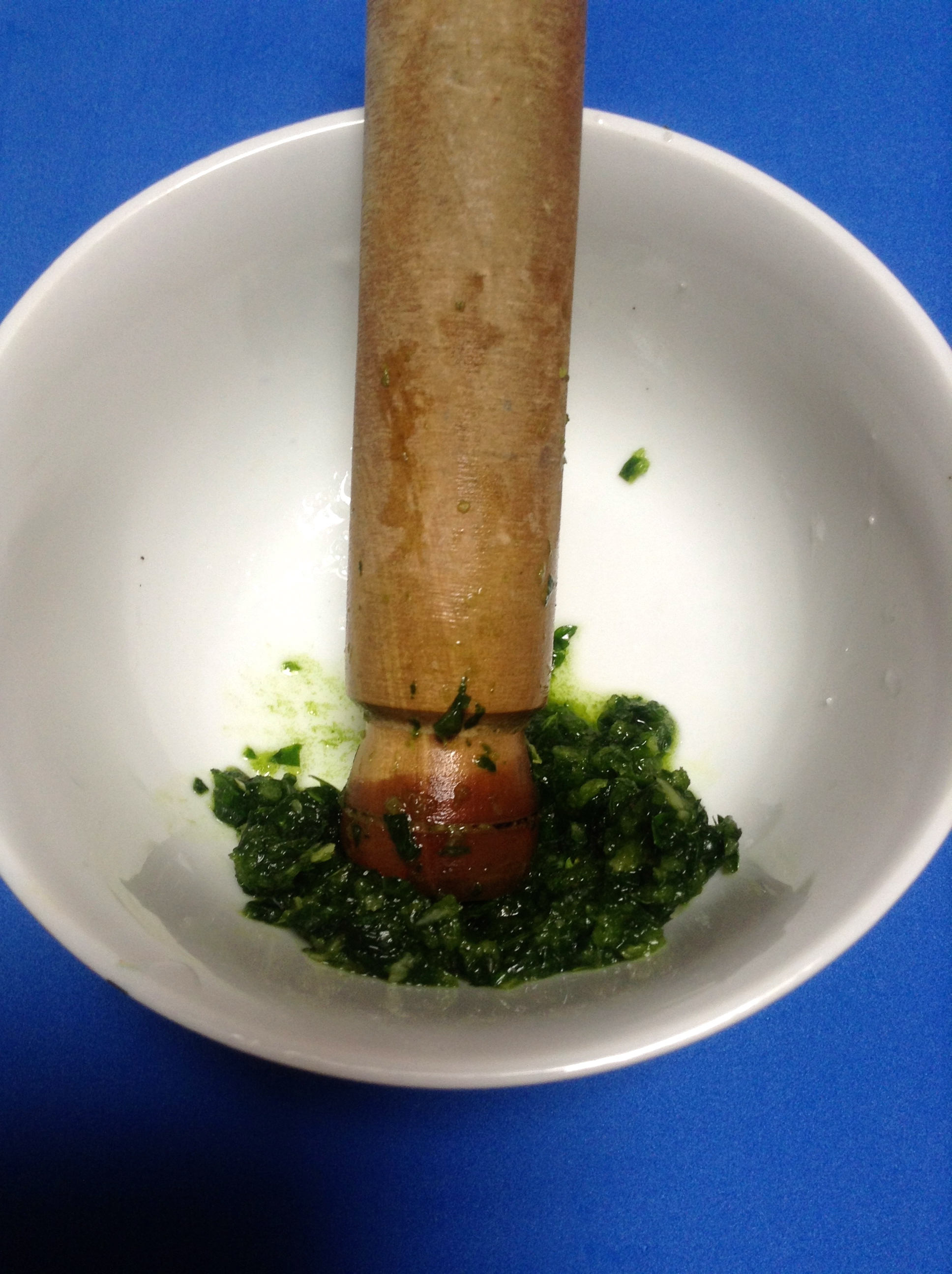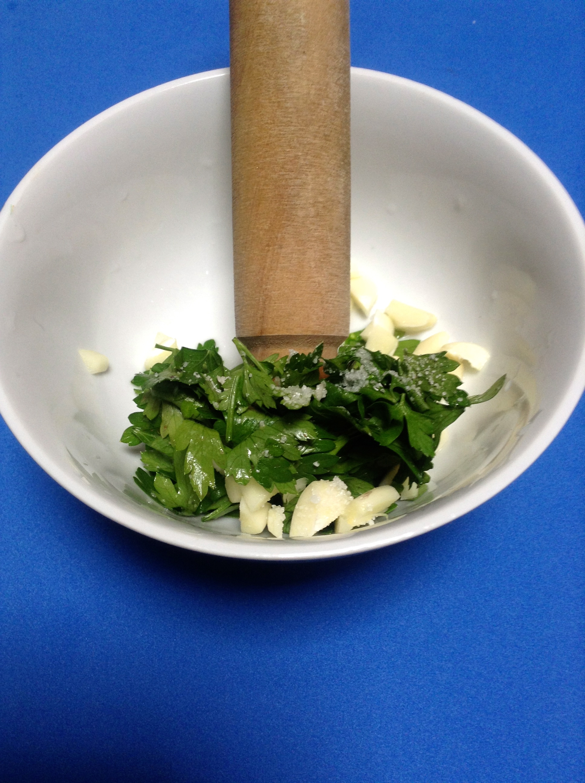 Mientras, majo el ajo y el perejil con un poco de sal. Añado un poco del caldo al majado.
