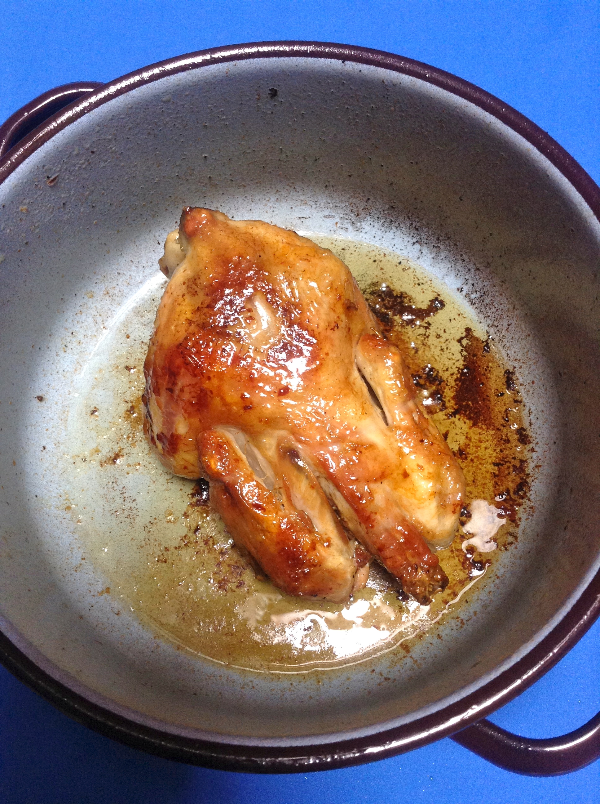 Durante esta media hora voy echando poco a poco lo que queda del caldo. De vez en cuando, con una cuchara, riego el pollo con el caldo para que quede jugoso.