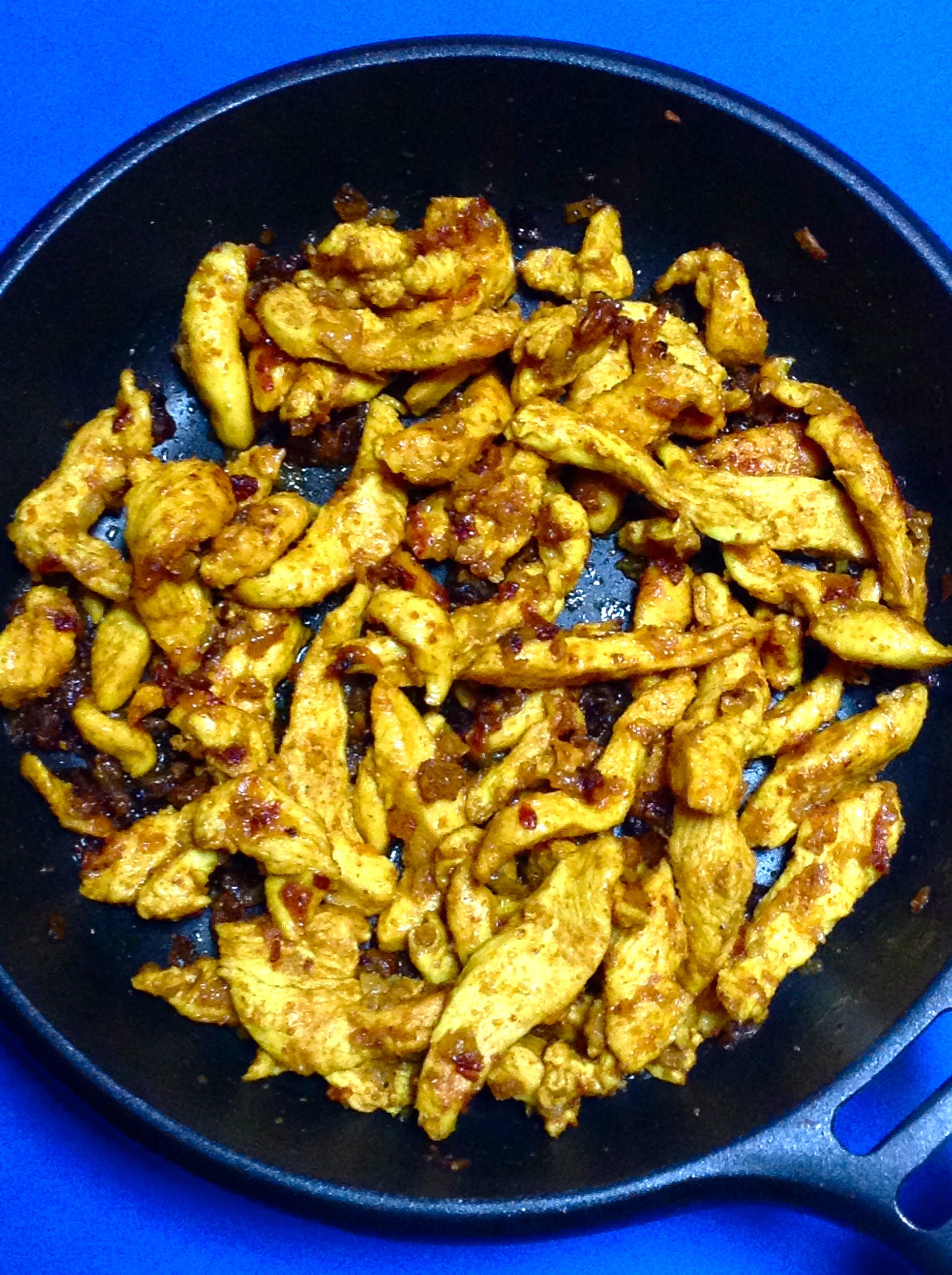 Le doy una vuelta y añado el pollo. Lo rehogo unos 5 minutos a fuego medio, removiendo de vez en cuando.