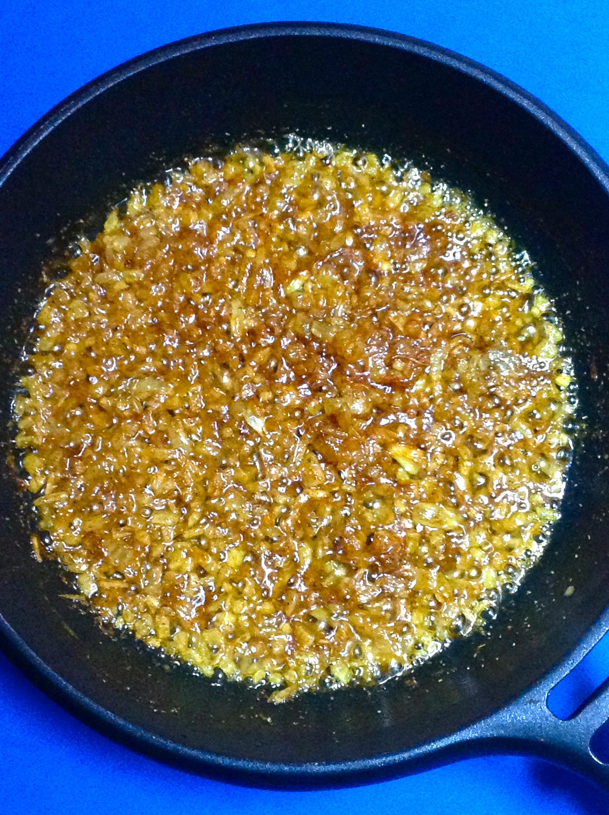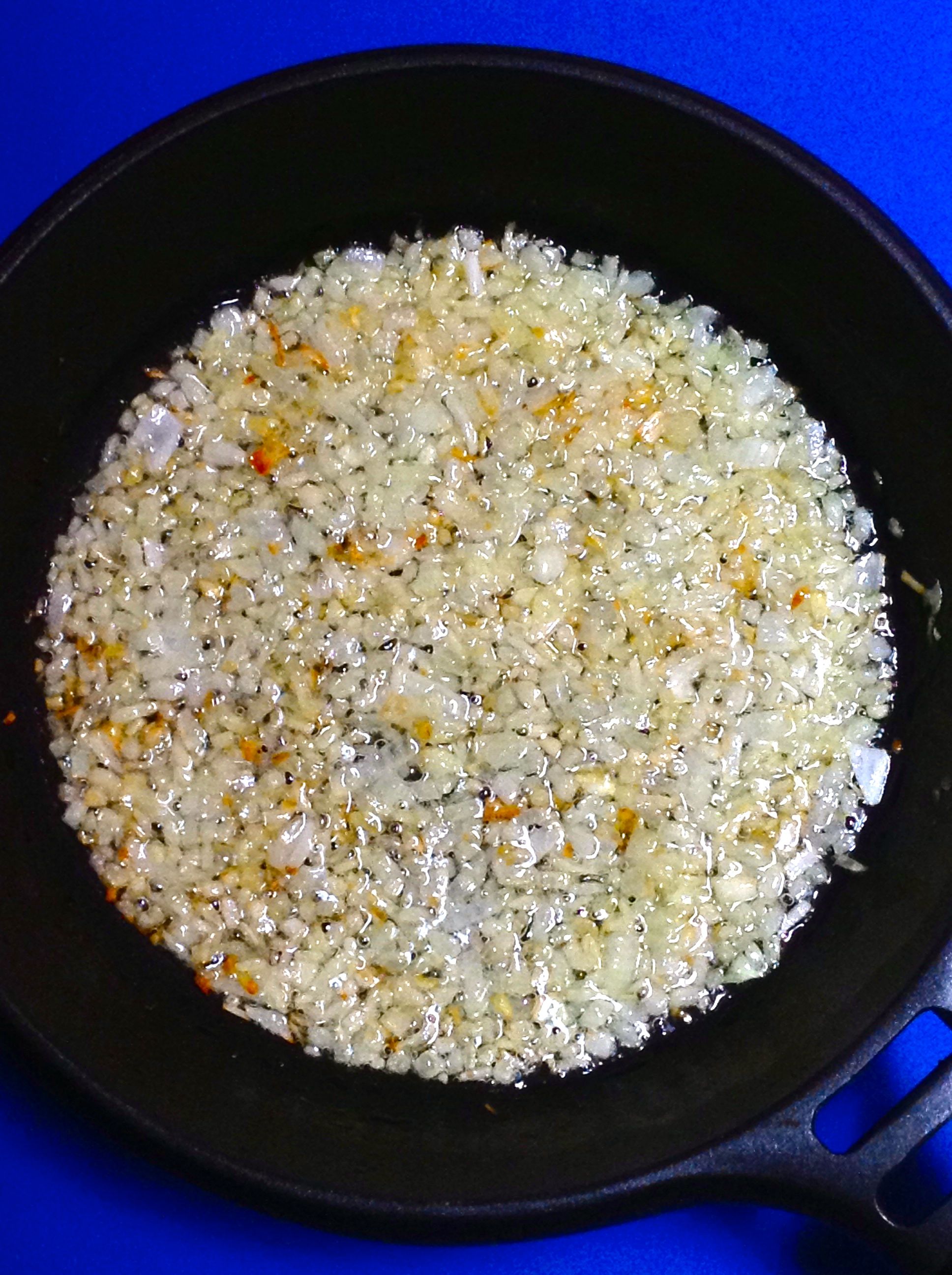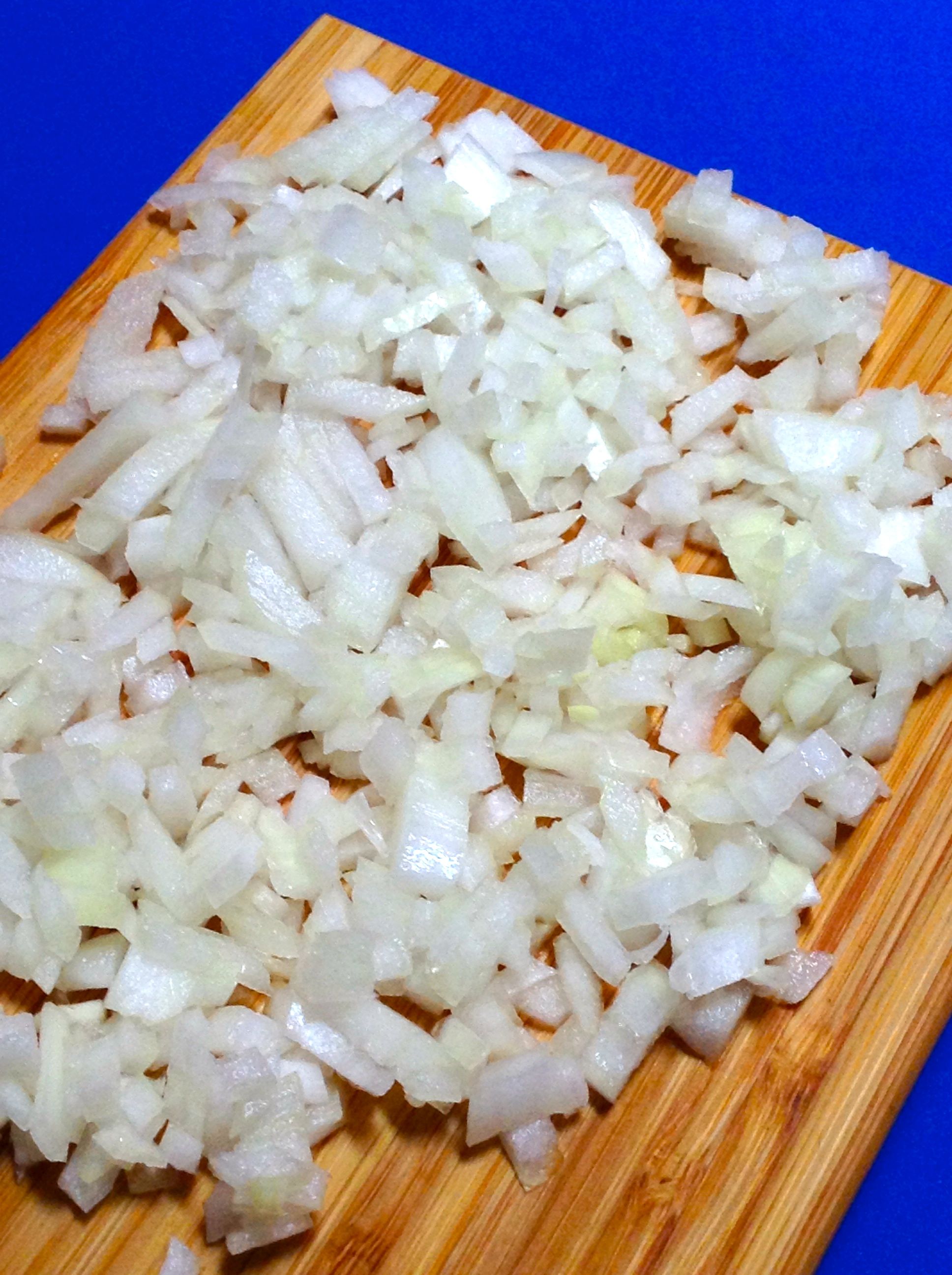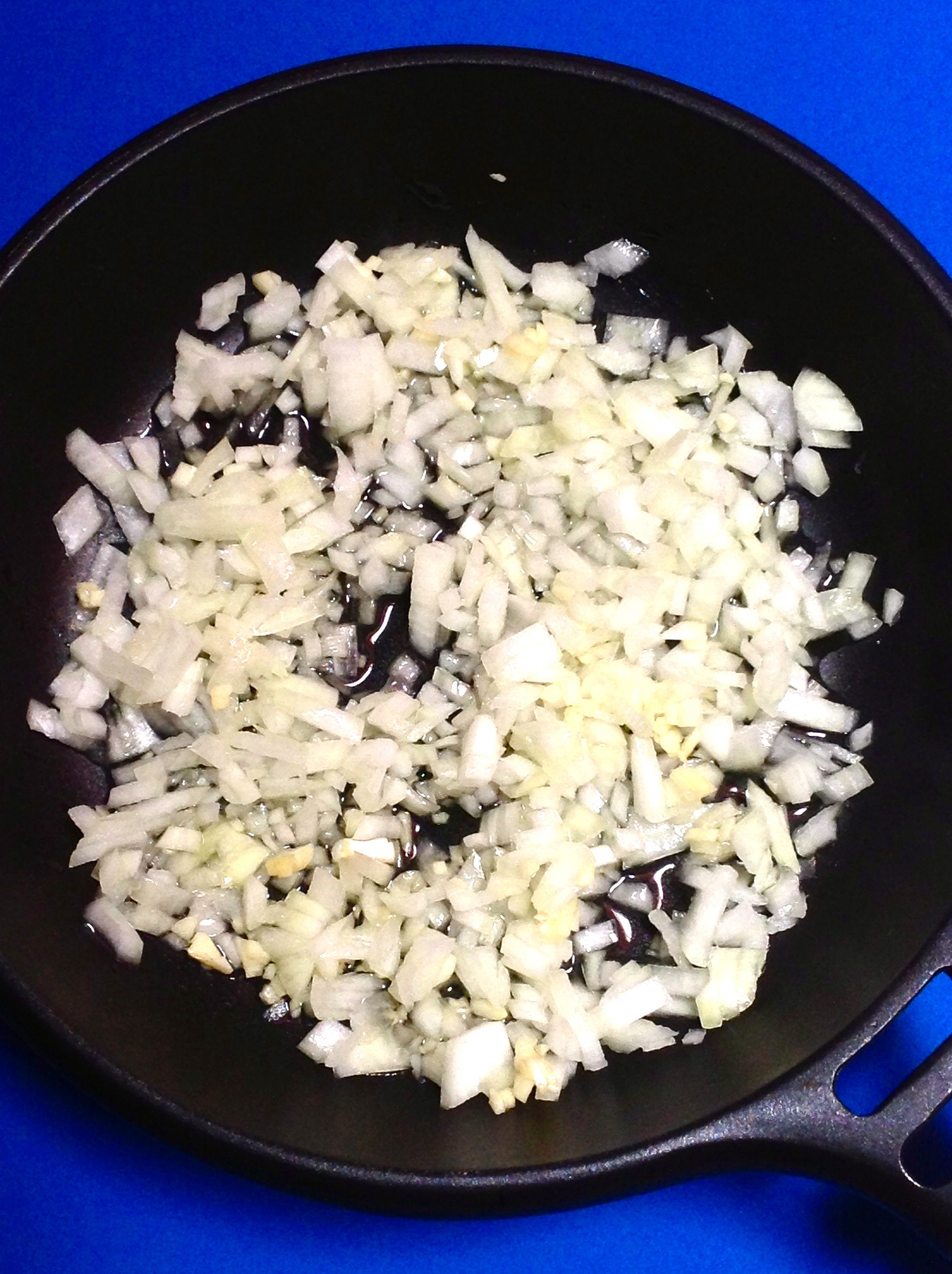 Pico muy fino las cebollas y los ajos, y los rehogo en una sartén con aceite.