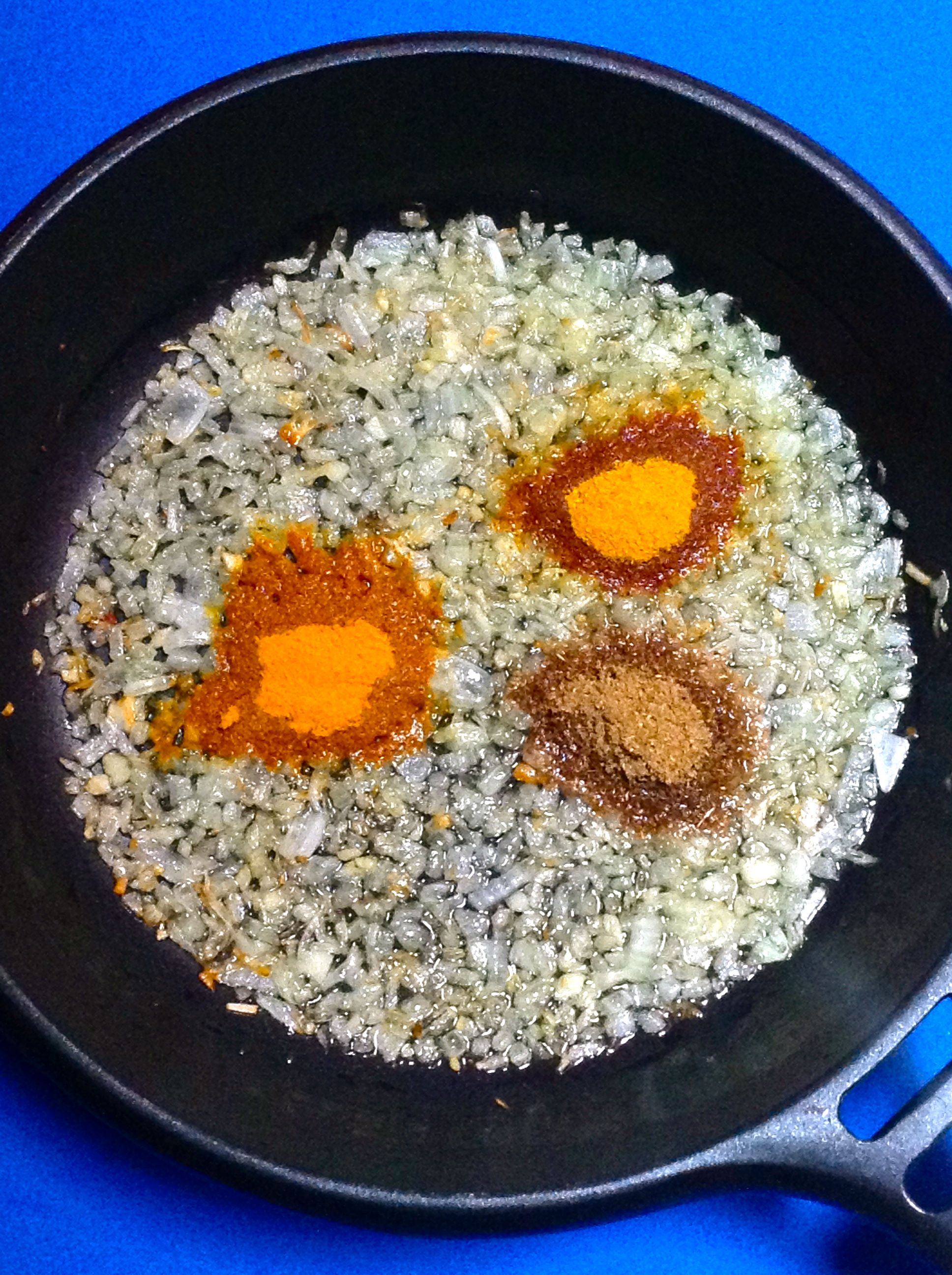 Cuando las verduras empiezan a pocharse, añado las especias.