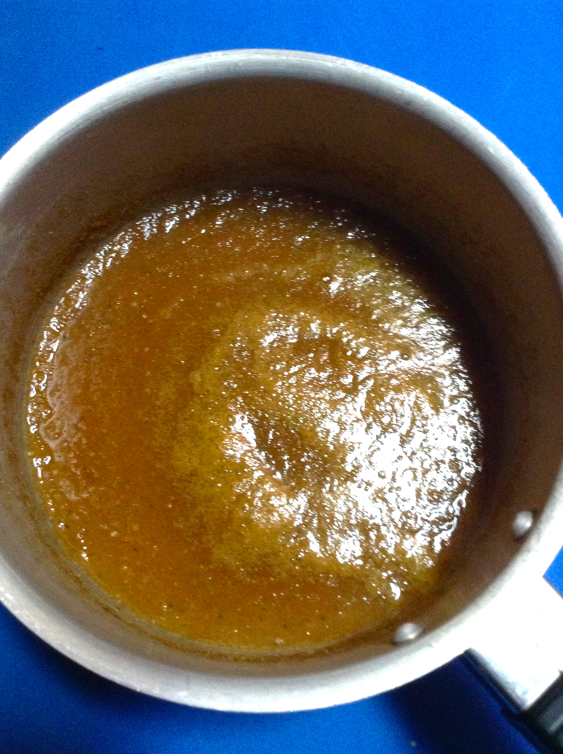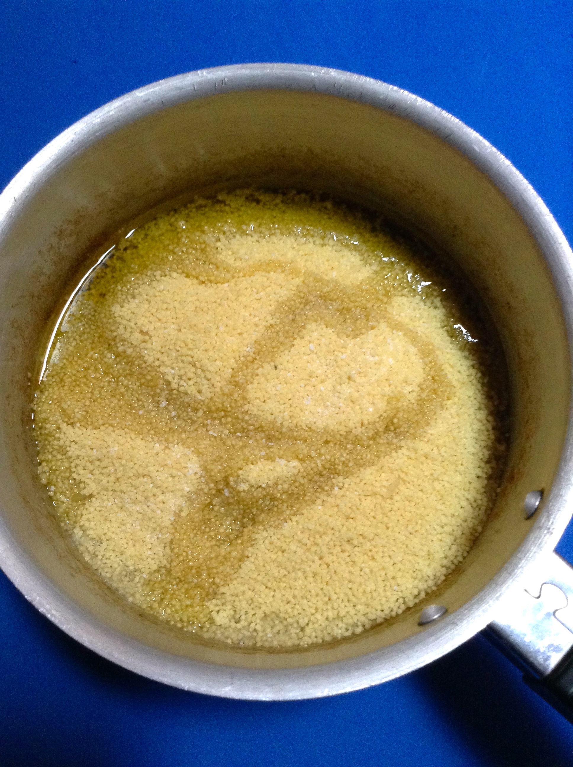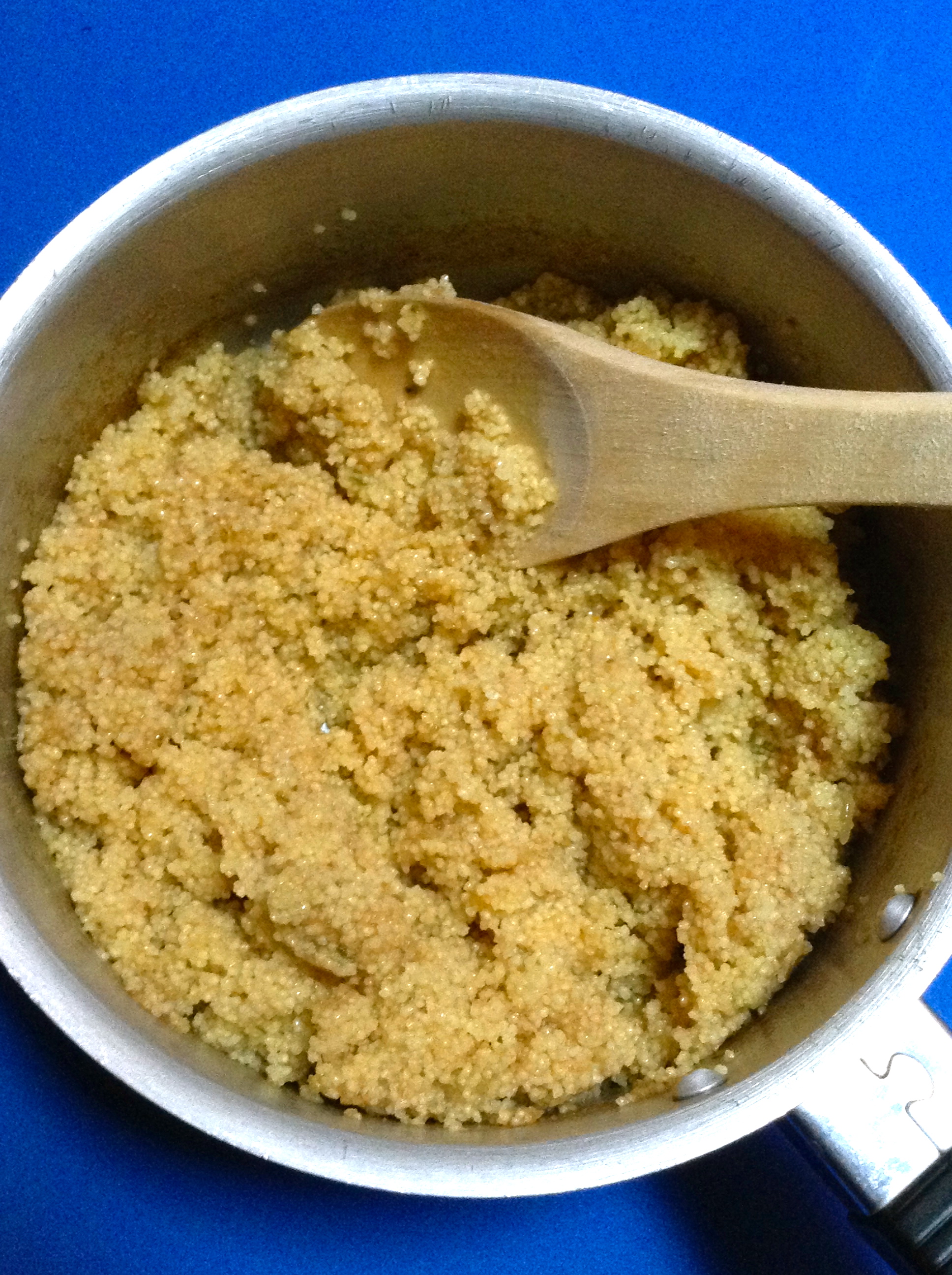 Pongo a fuego medio este zumo, y cuando está caliente, lo retiro del fuego y añado los 2 vasos de cous cous. Lo dejo reposar un par de minutos.