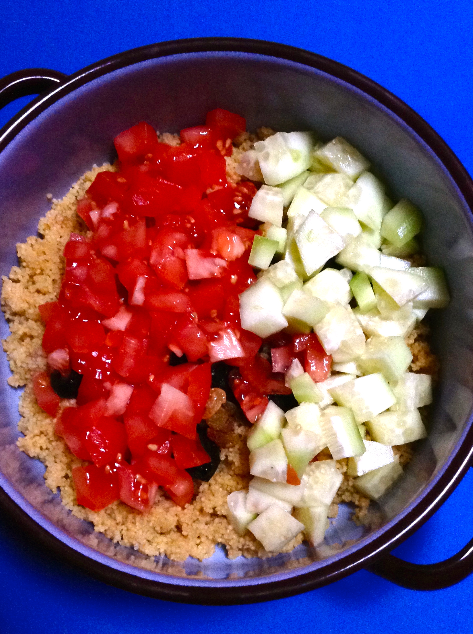 Pico los otros 2 tomates, el pepino y la cebolla, y los añado al cous cous.