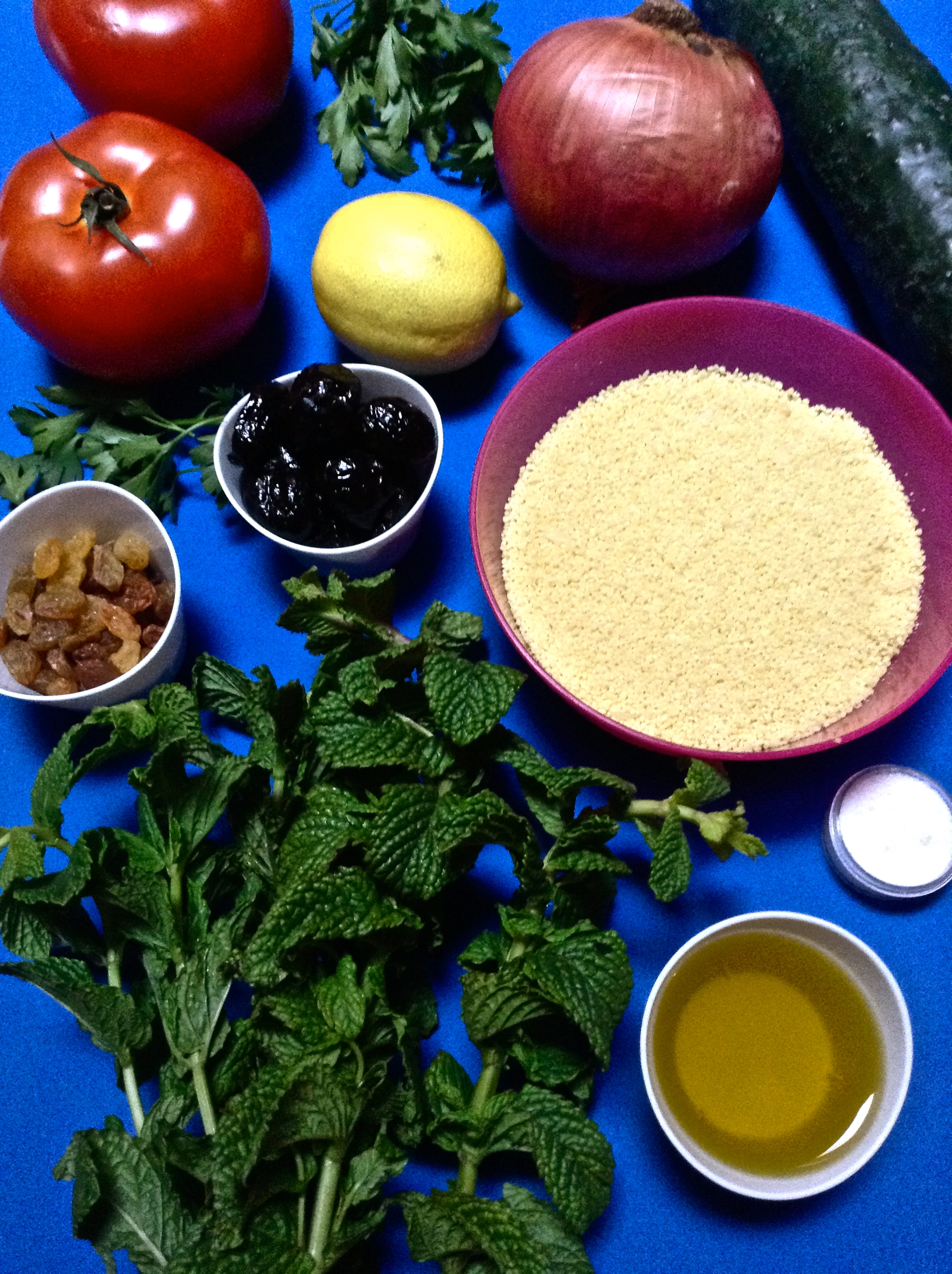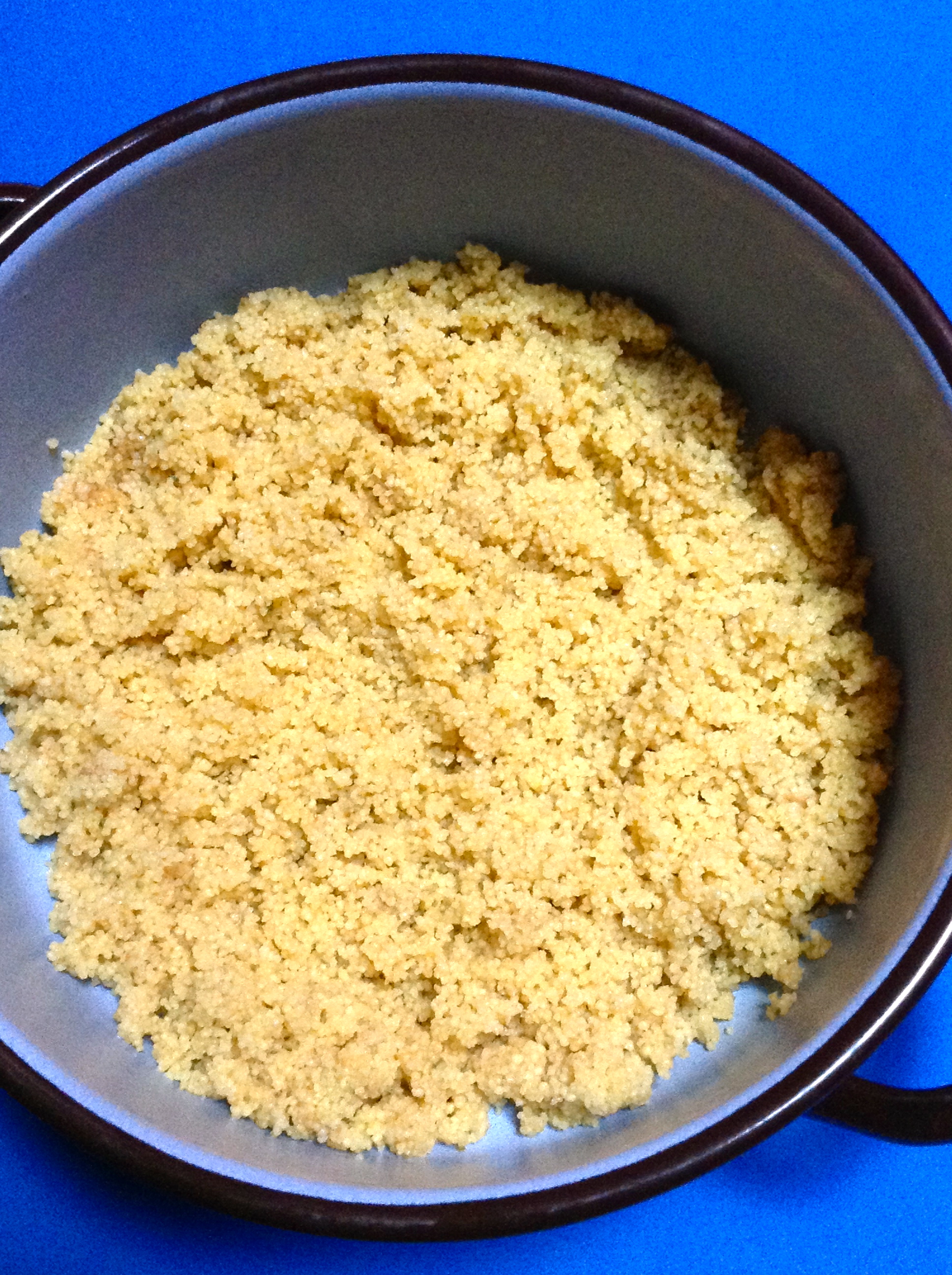 Echo una pizca de sal, unas 8 cucharadas de aceite de oliva y el zumo de medio limón. Lo remuevo bien para que los granos de cous cous no queden apelmazados y lo dejo reposar en otro recipiente.