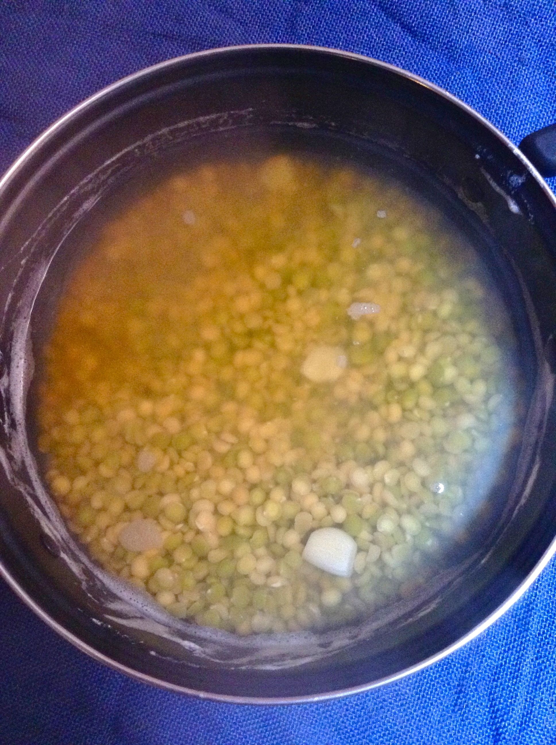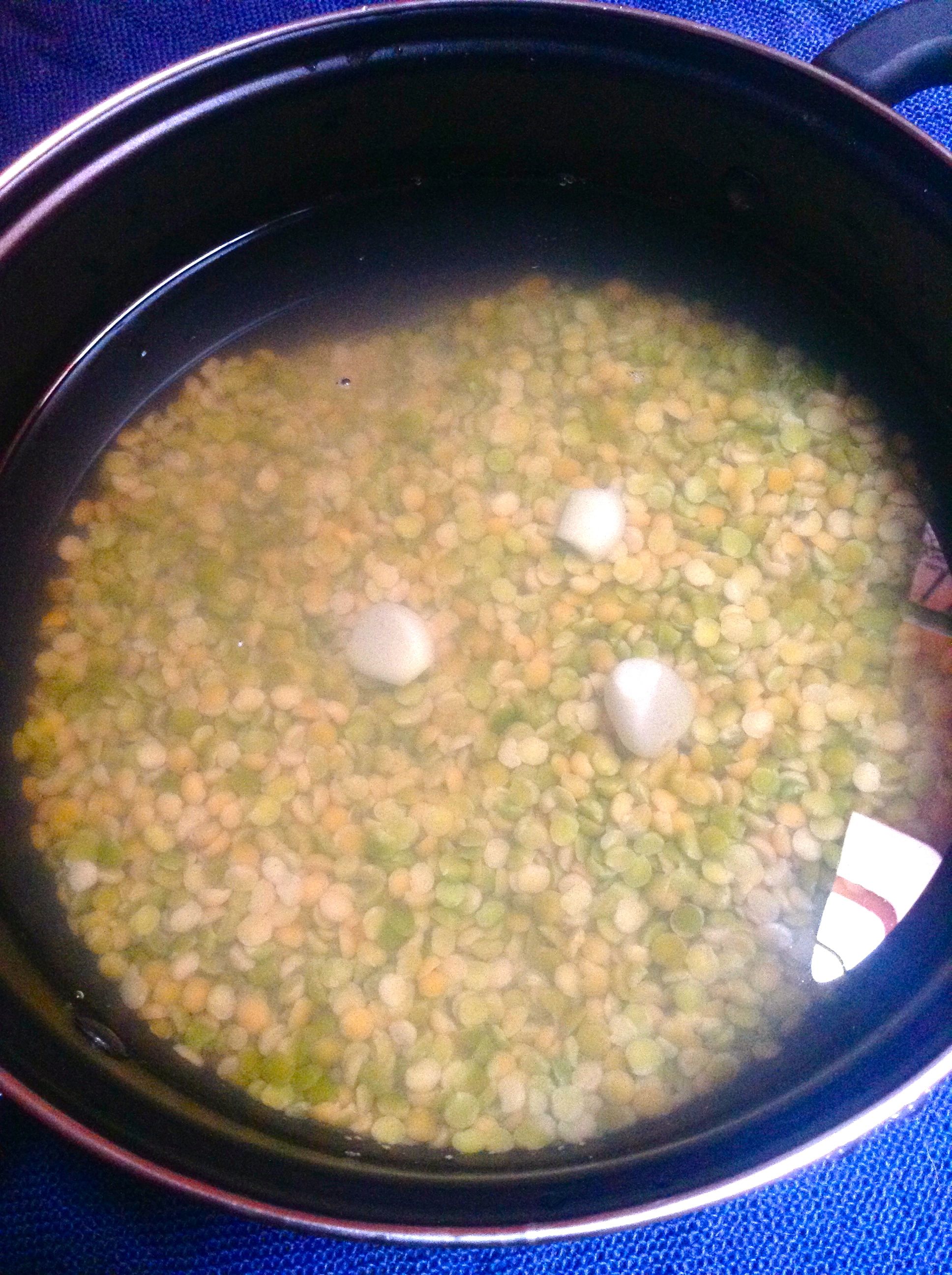Pongo los guisantes y los ajos en una cazuela con tres litros de agua y un pizca de sal. La tapo y la llevo a fuego medio-bajo hasta que los guisantes están blandos (unas 3 ó 4 horas). Voy quitando la espuma y añadiendo un poco más de agua si es necesario.