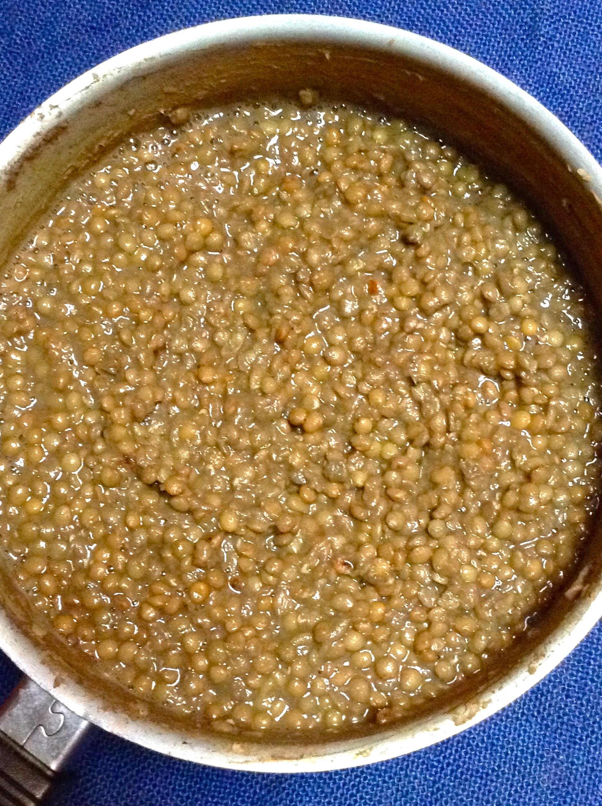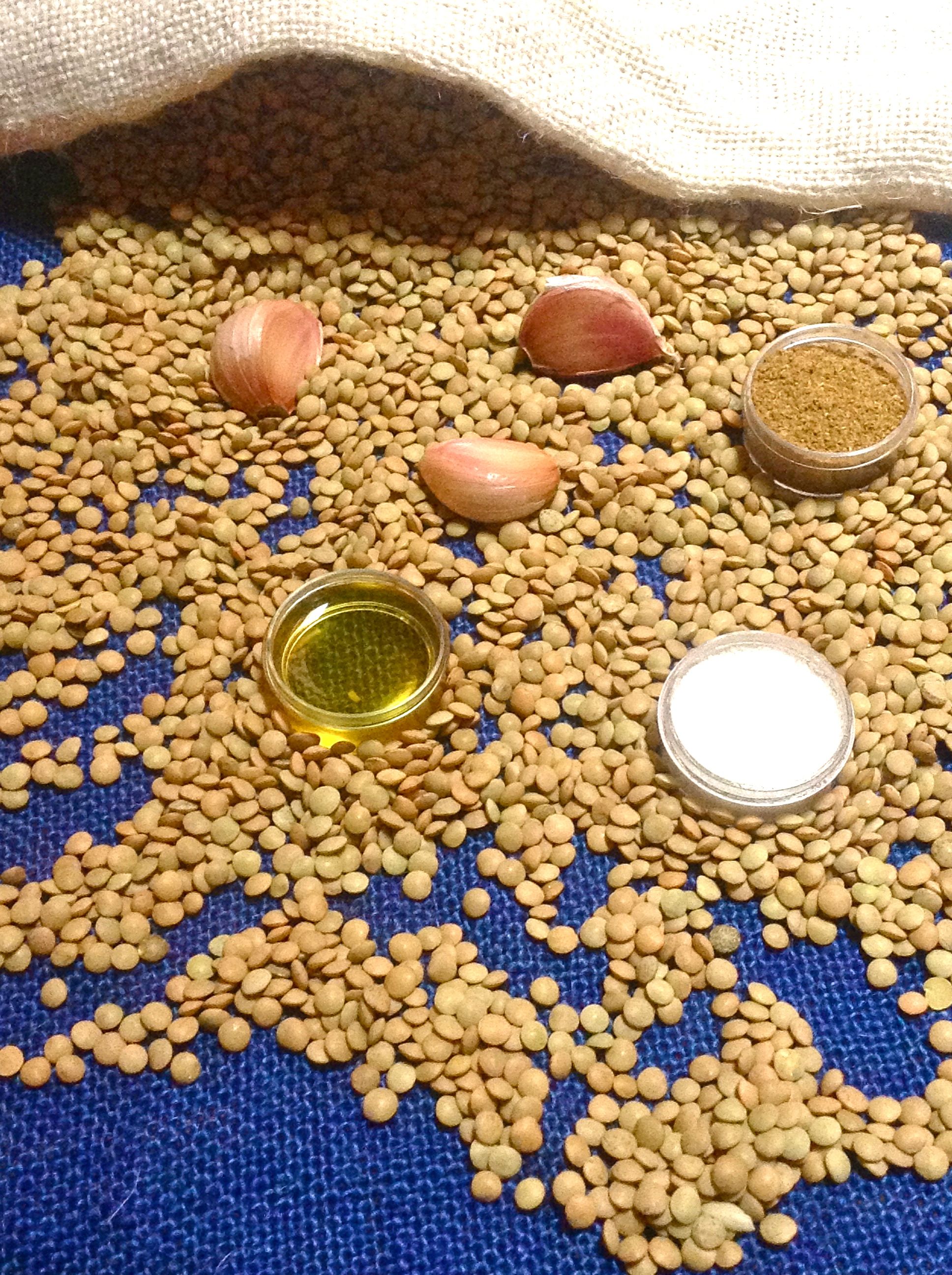 Pongo las lentejas y los ajos en una cazuela con dos litros de agua y un pizca de sal. La tapo y la llevo a fuego medio-bajo hasta que las lentejas están blandas (1 ó 2 horas). Voy quitando la espuma y añadiendo un poco más de agua si es necesario.