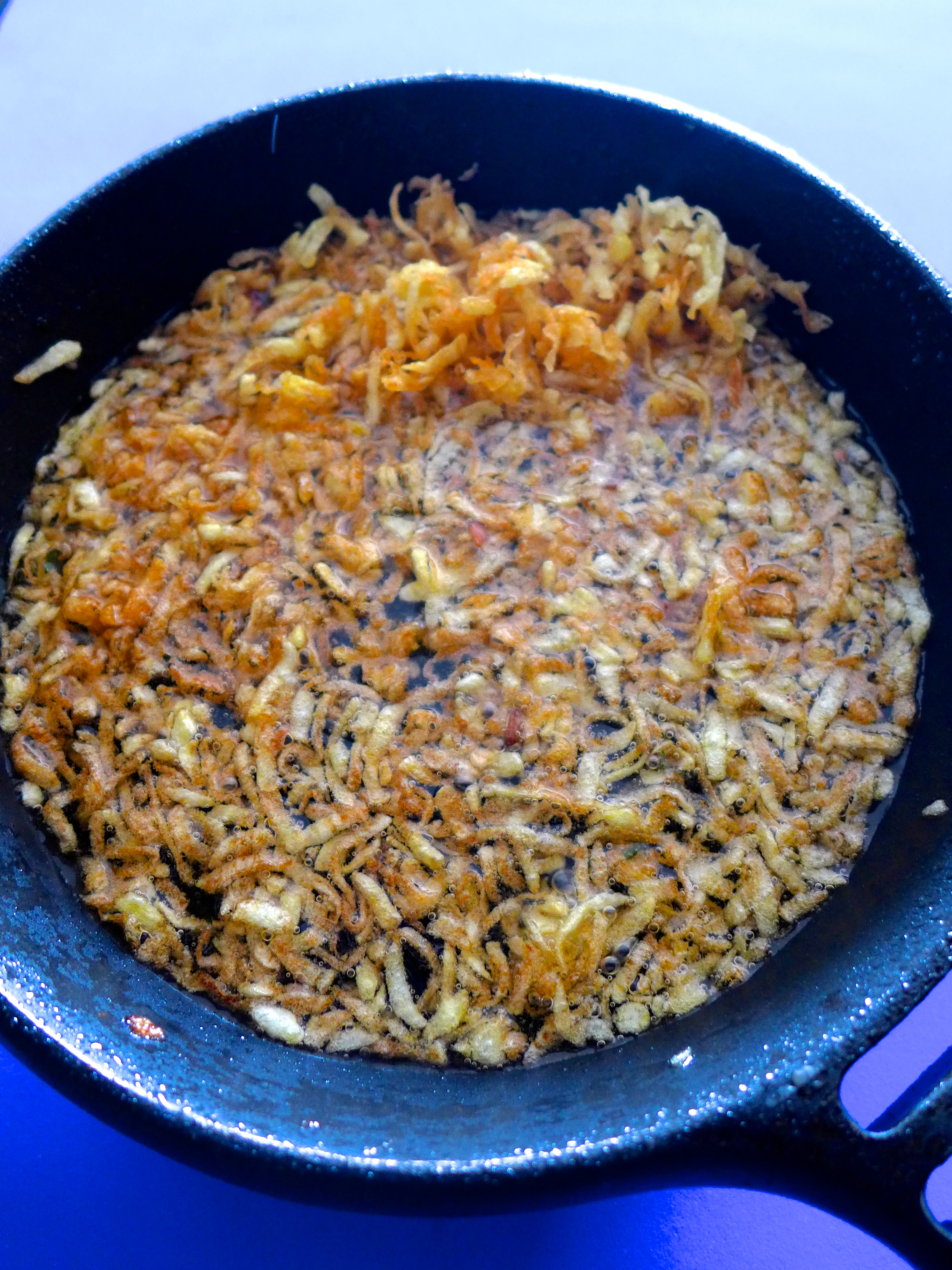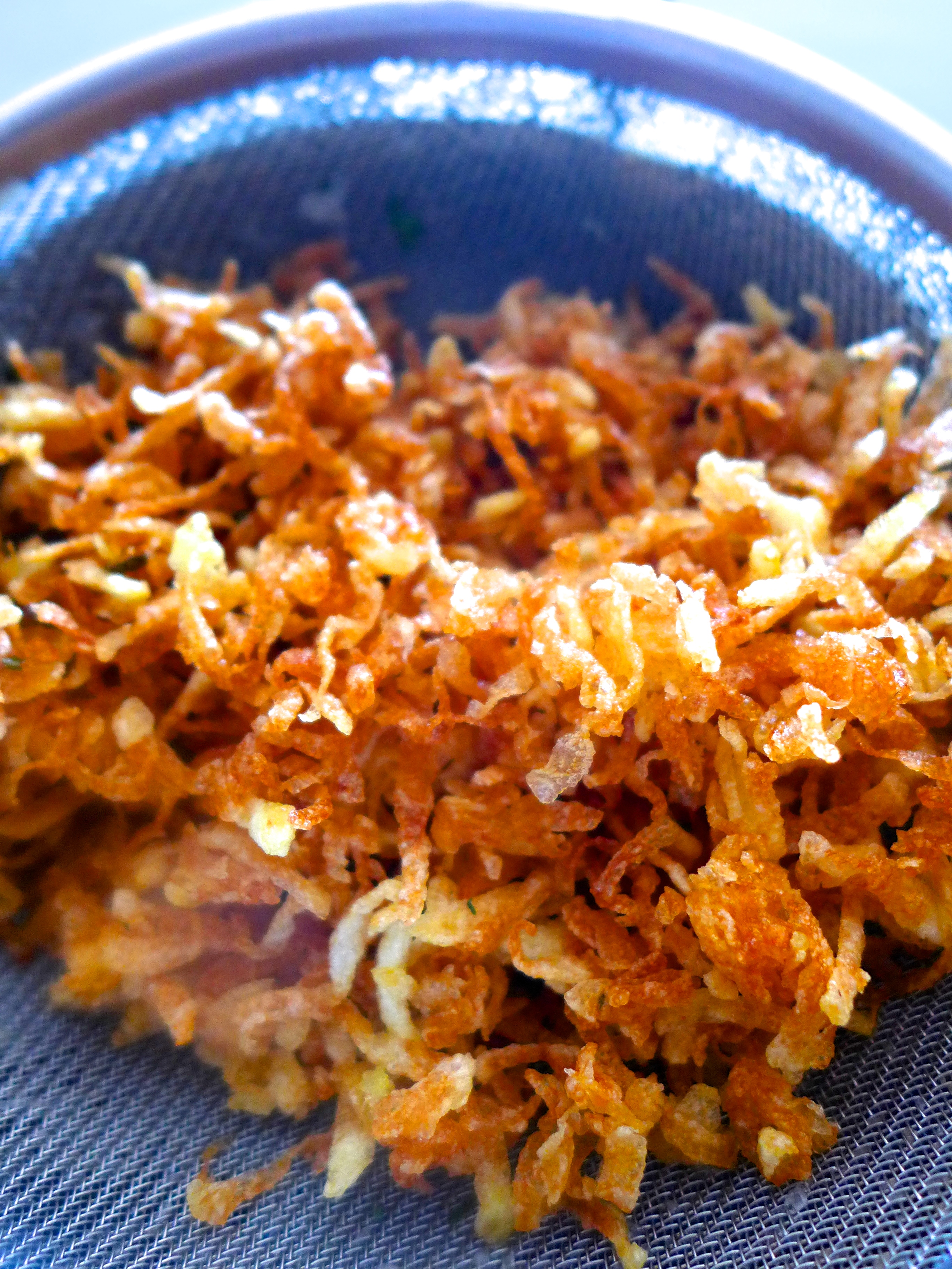 En la misma sartén, frío las patatas pajas en abundante aceite de oliva a fuego alto. Cuando están doradas, las escurro.
