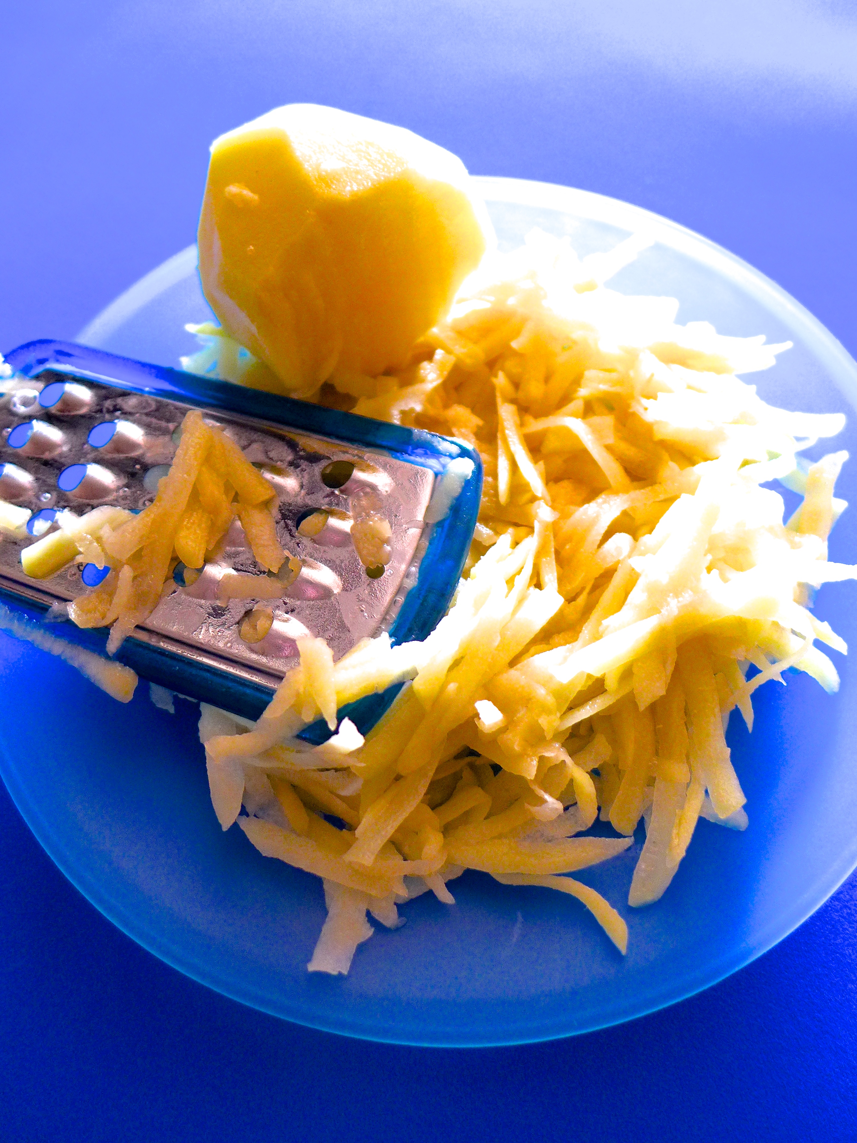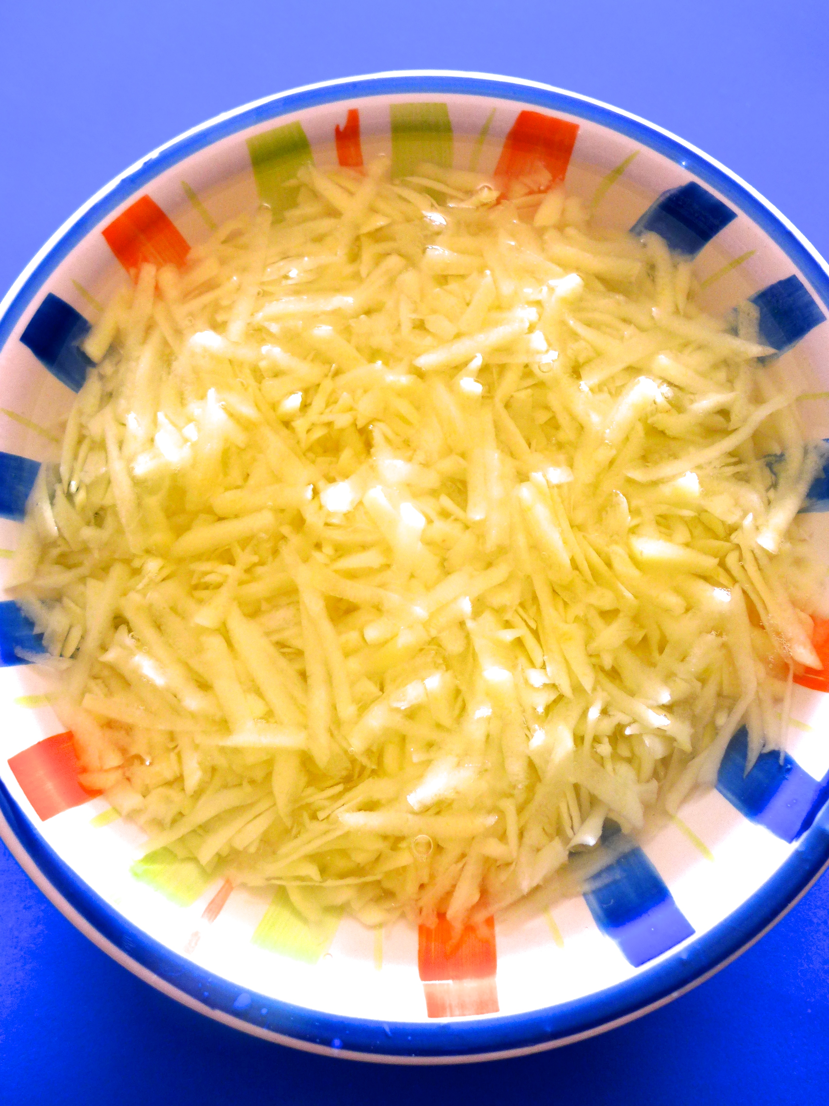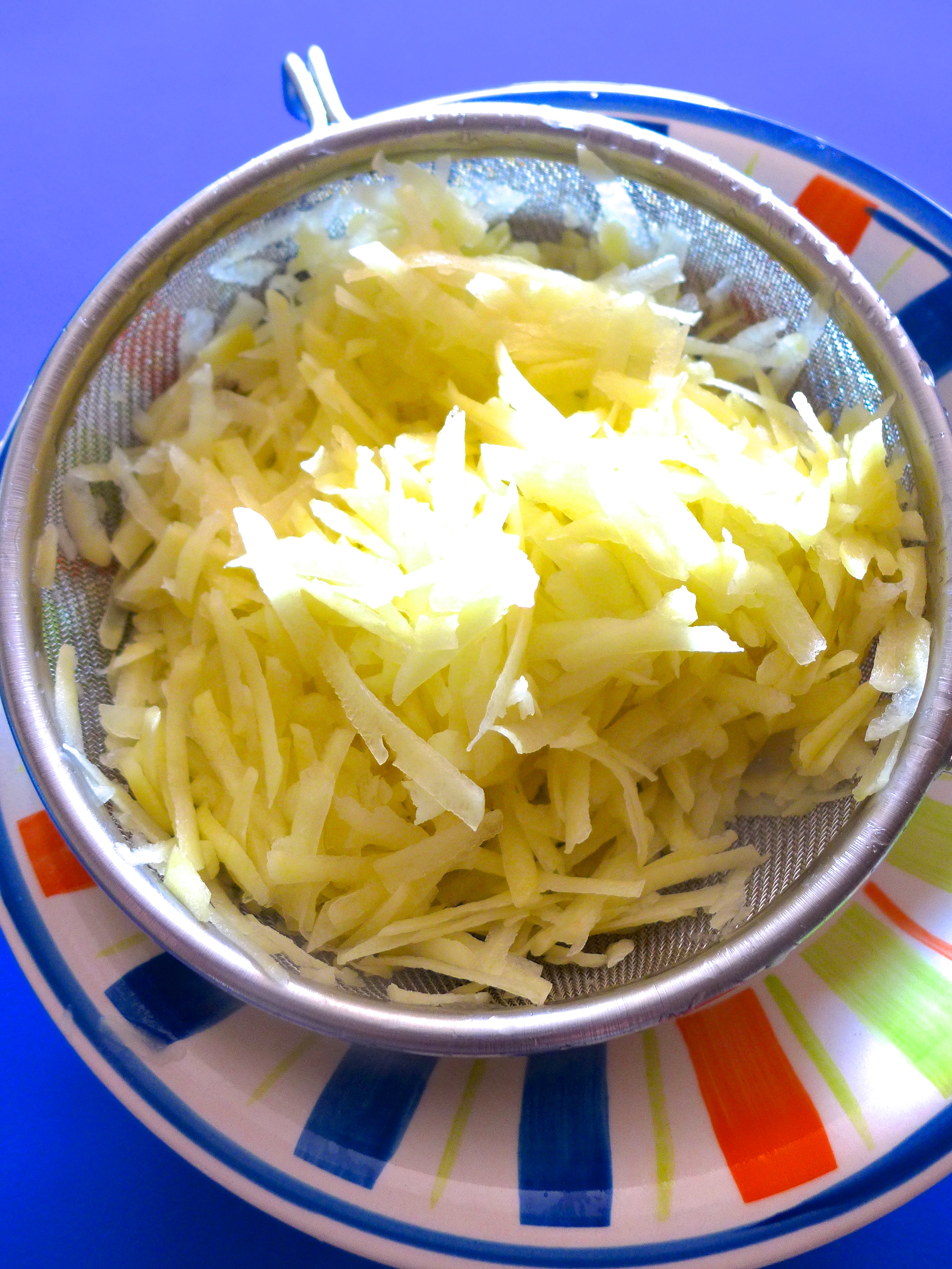 Mientras, pelo y rallo las patatas. Las lavo hasta que el agua salga limpia. Entonces, las escurro y las dejo secando en un paño limpio.