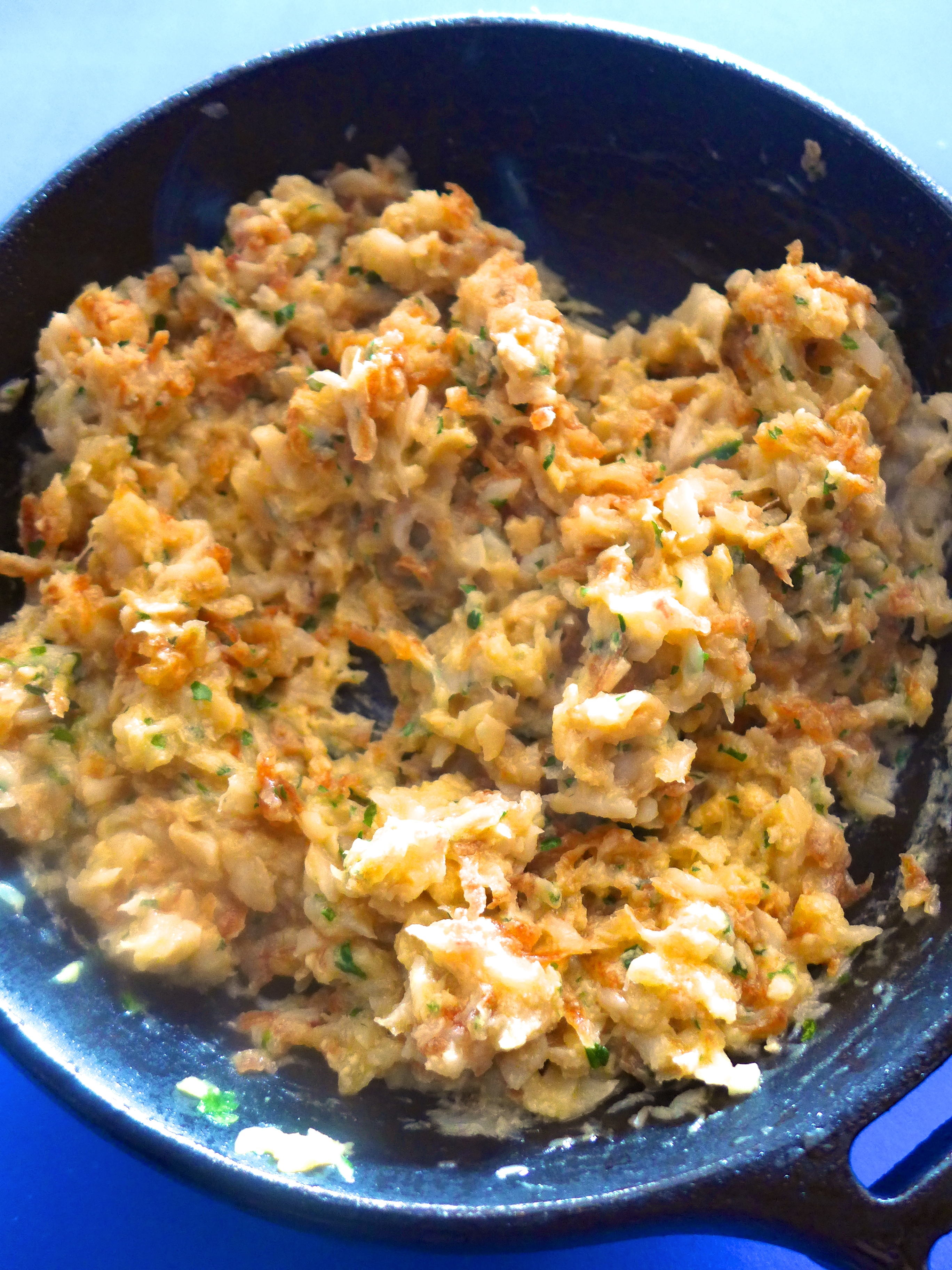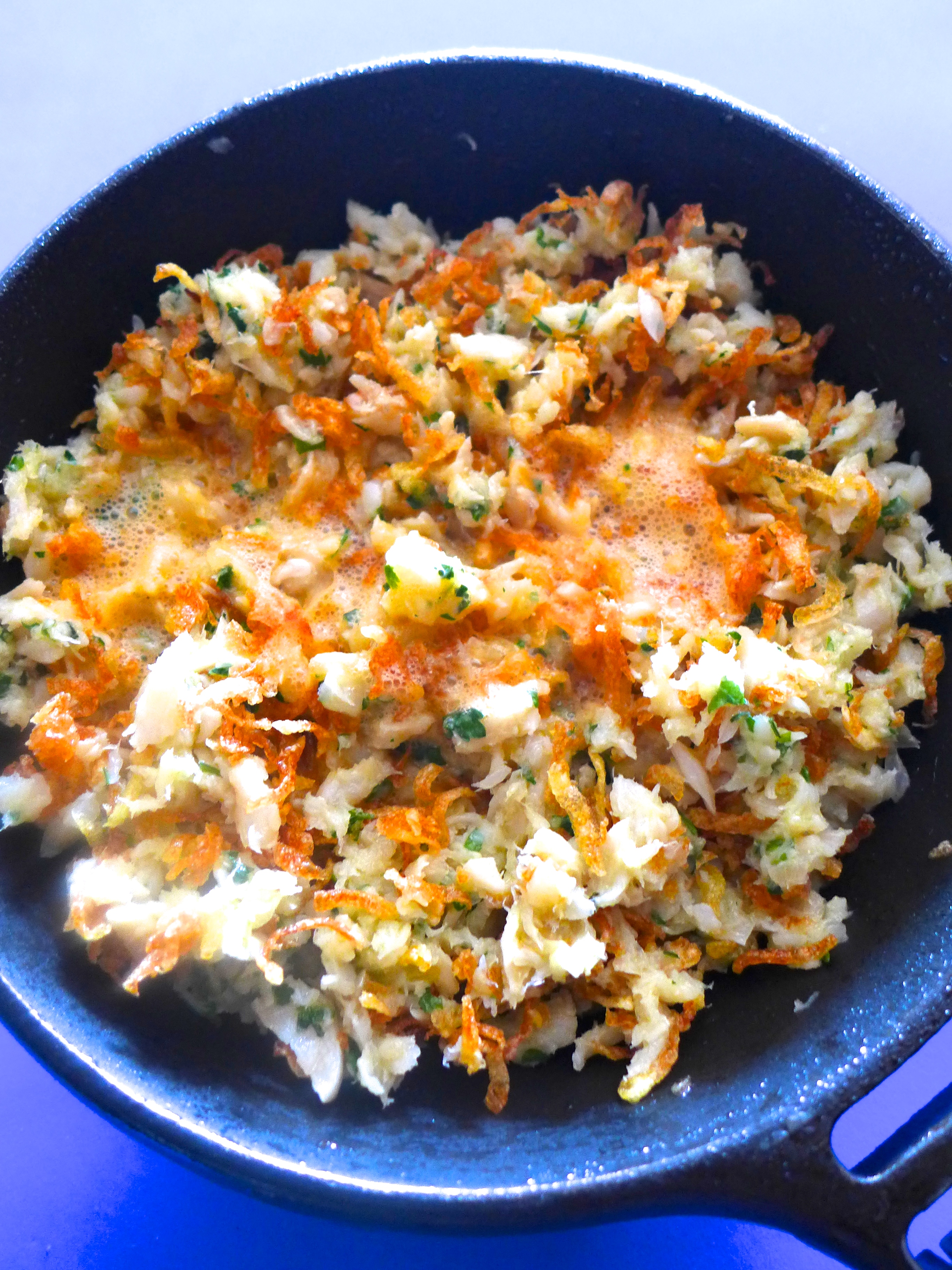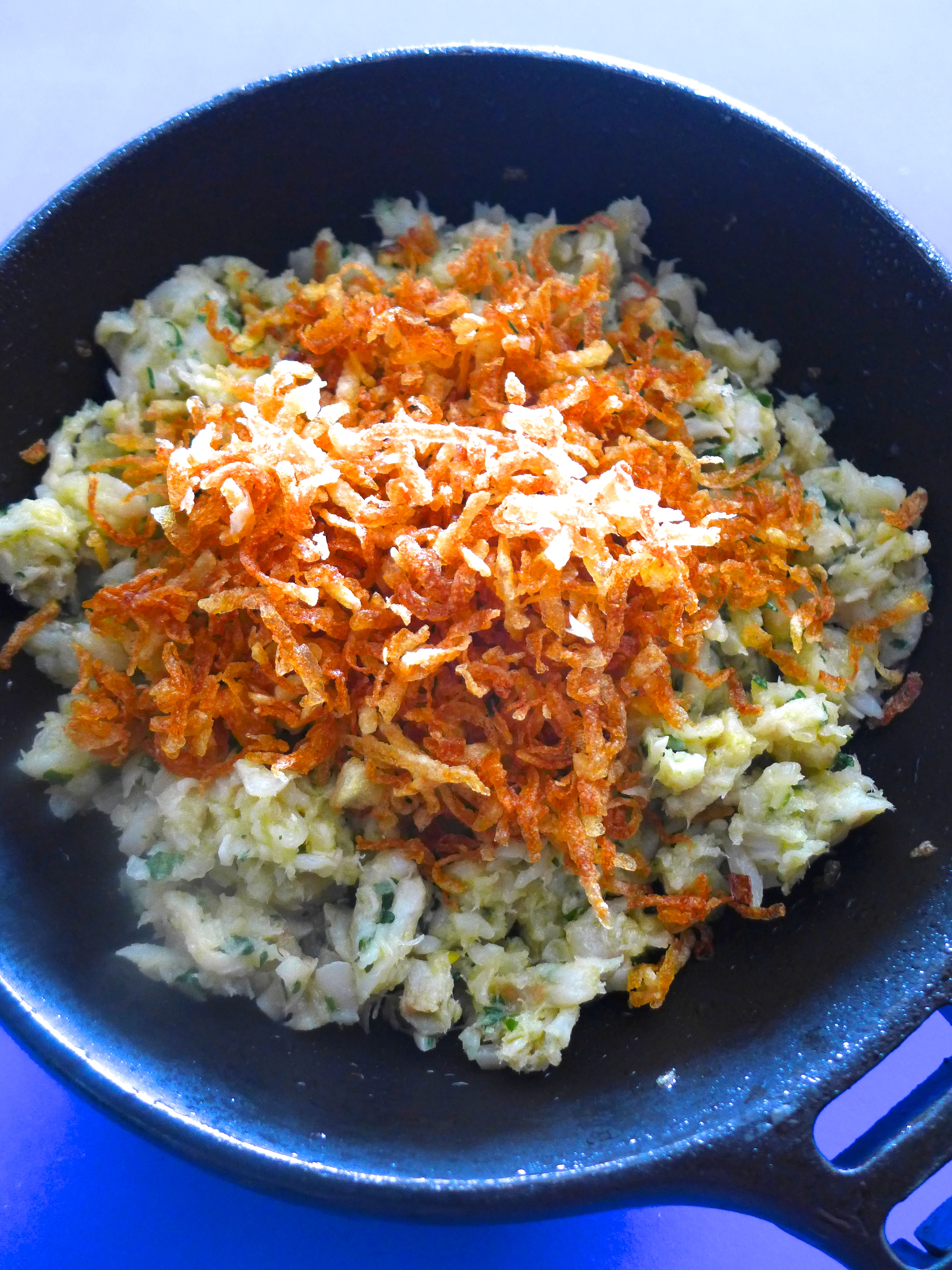 Mientras, pelo y rallo las patatas. Las lavo hasta que el agua salga limpia. Entonces, las escurro y las dejo secando en un paño limpio.