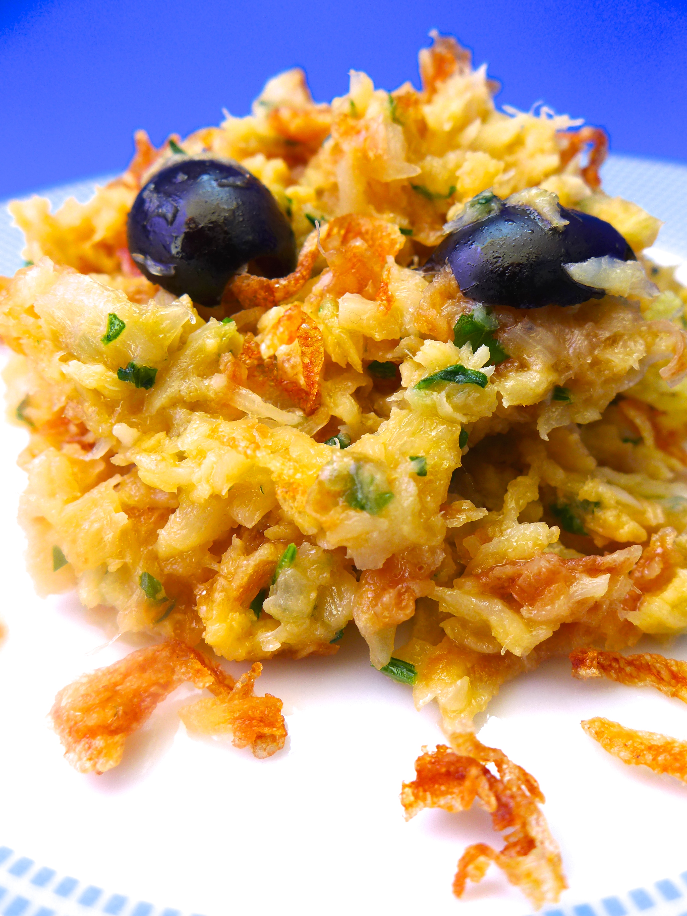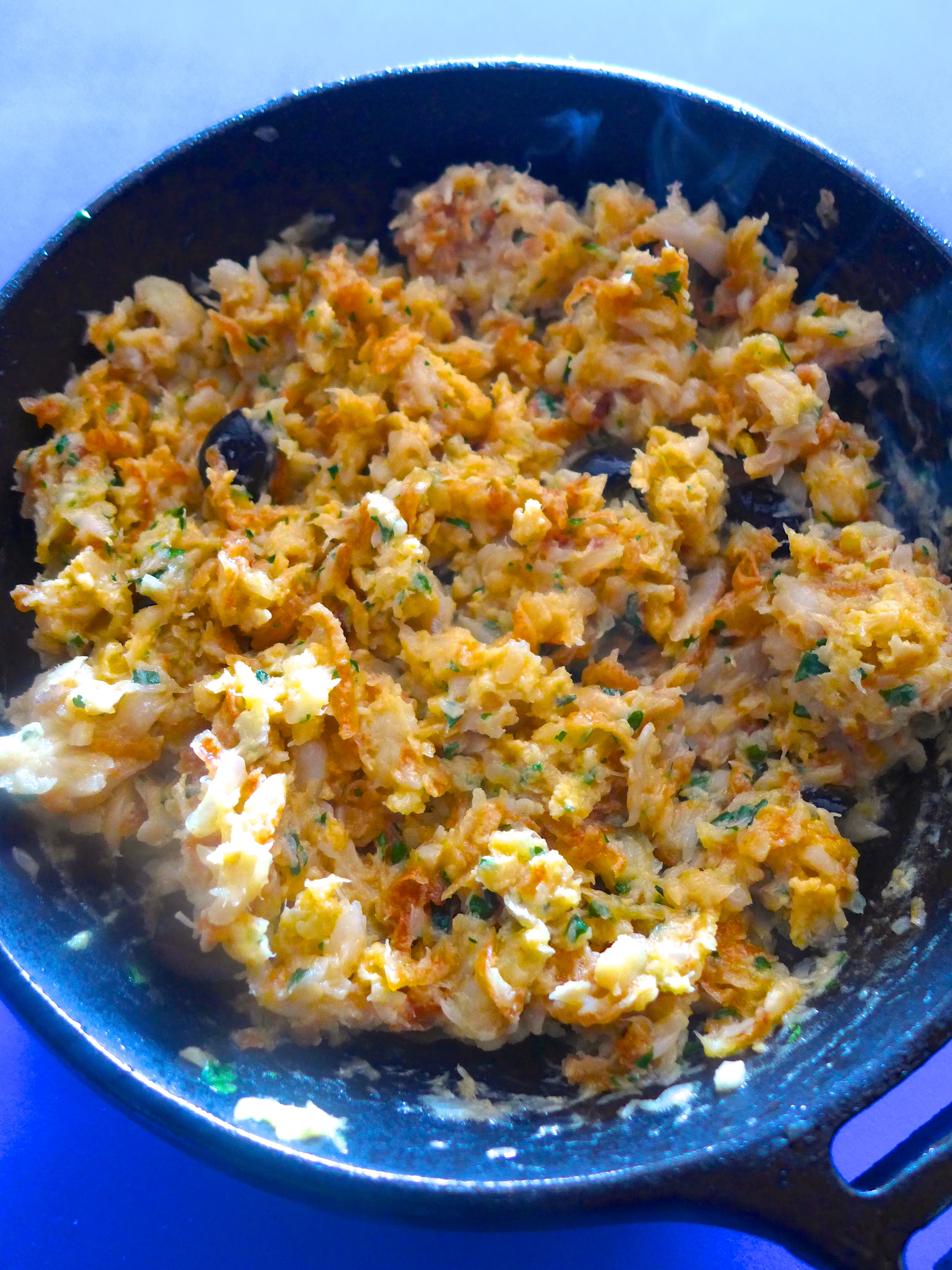 Remuevo para hacer un revuelto, añado las aceitunas y retiro del fuego antes de que se quede demasiado seco.