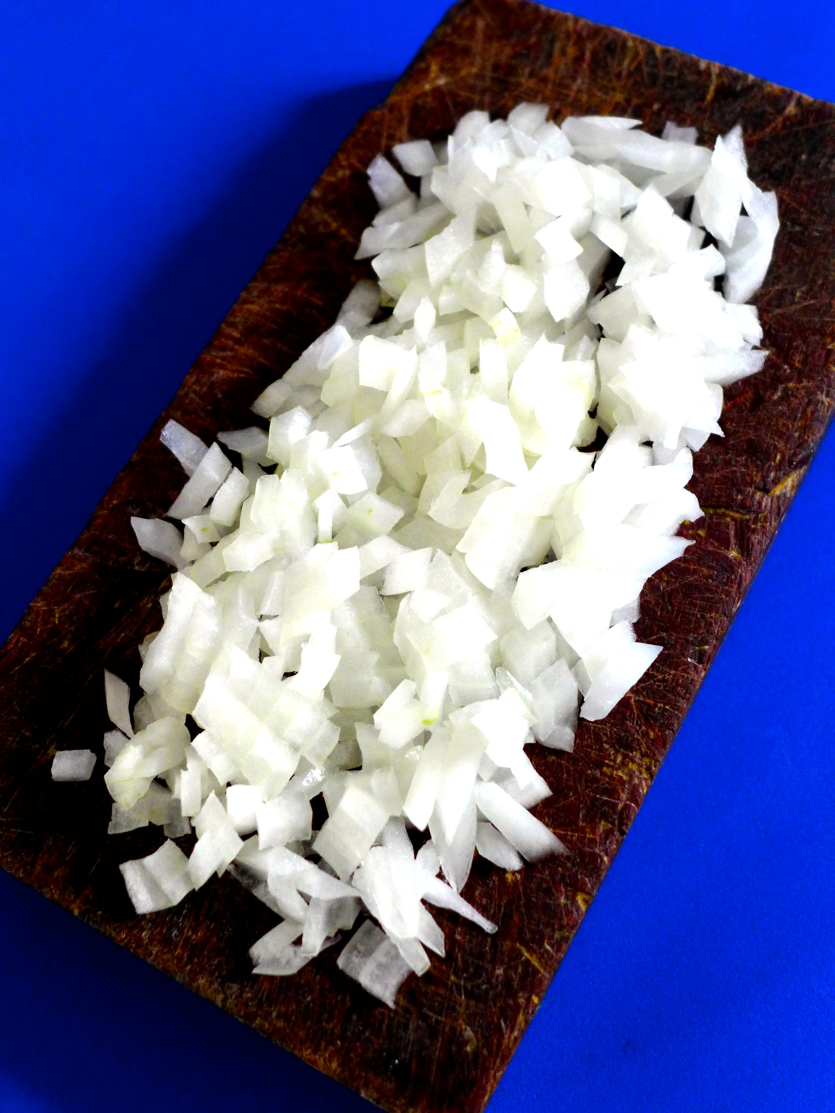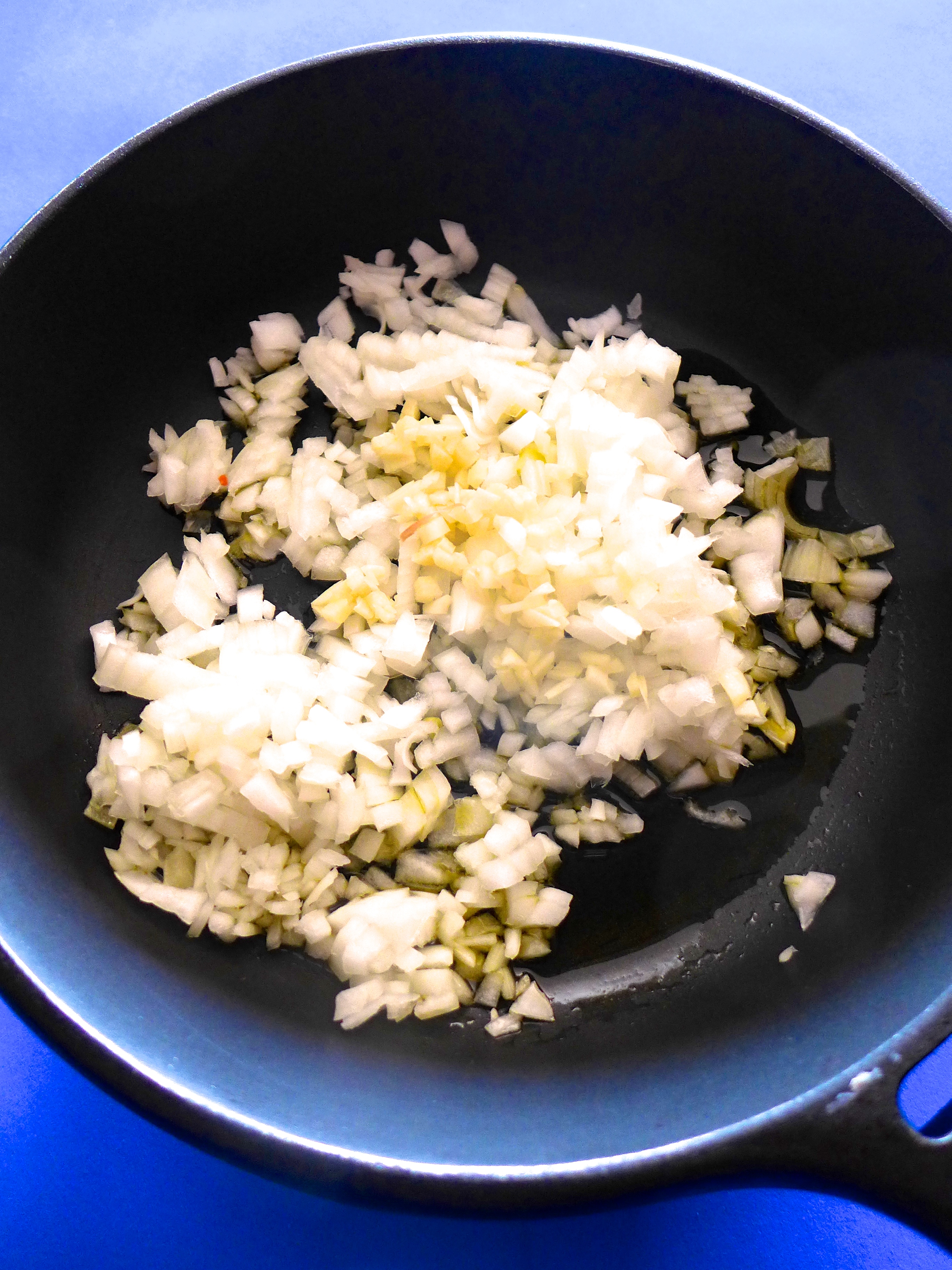Pico la cebolla y los dientes de ajo, y los rehogo en una sartén con aceite de oliva a fuego medio.