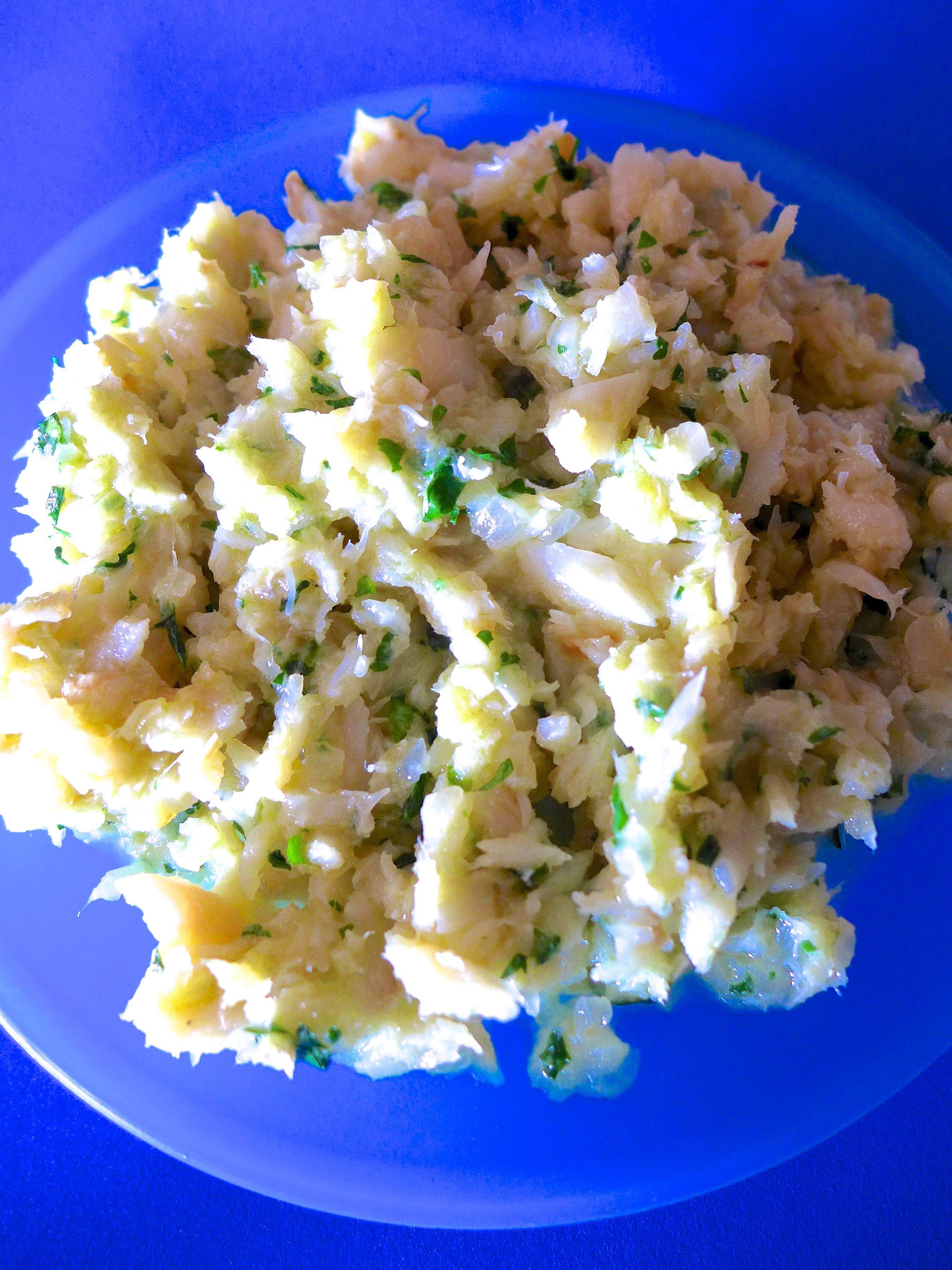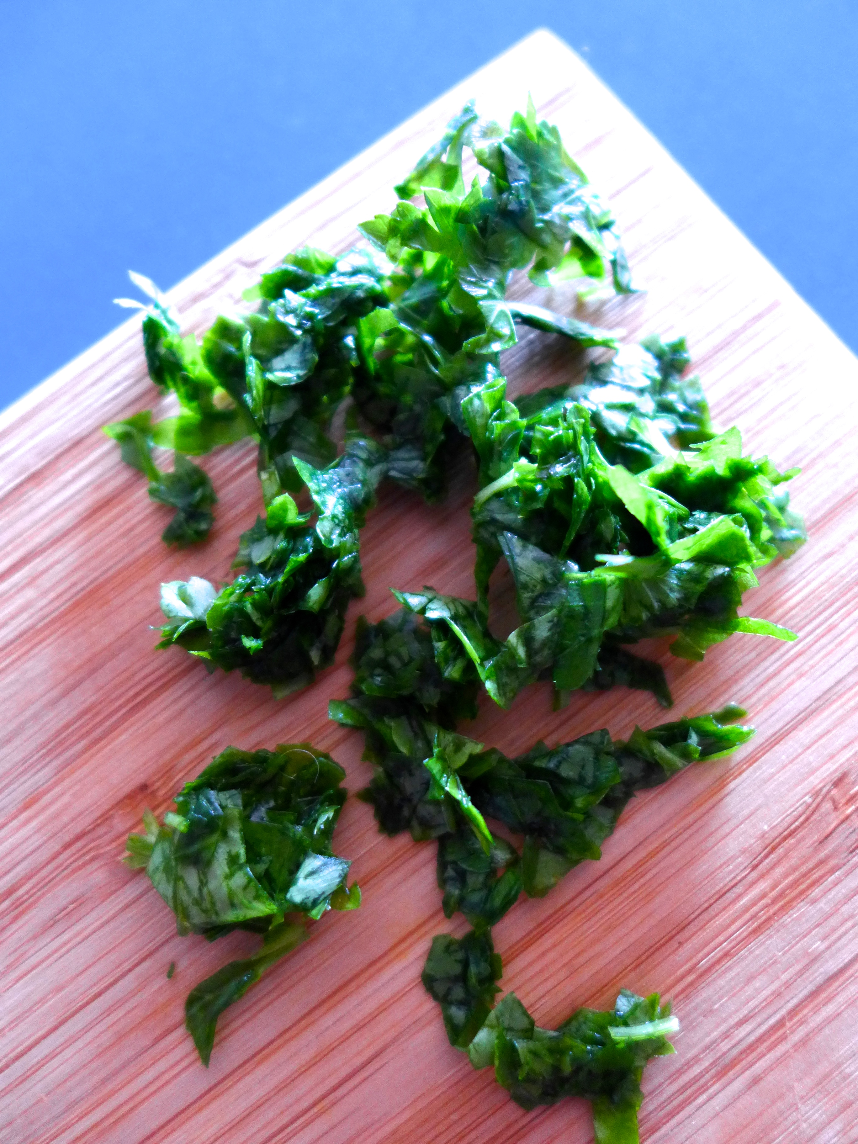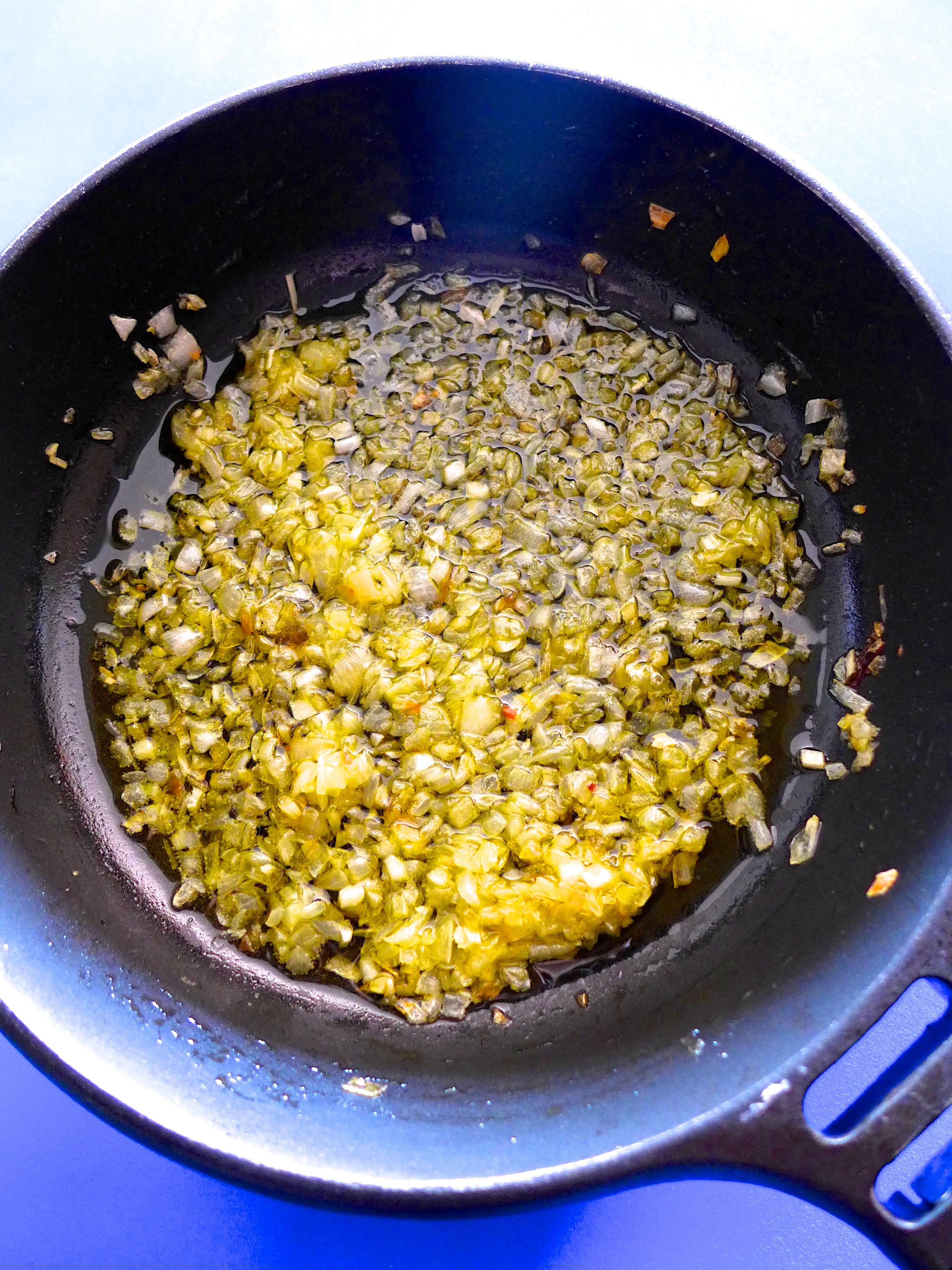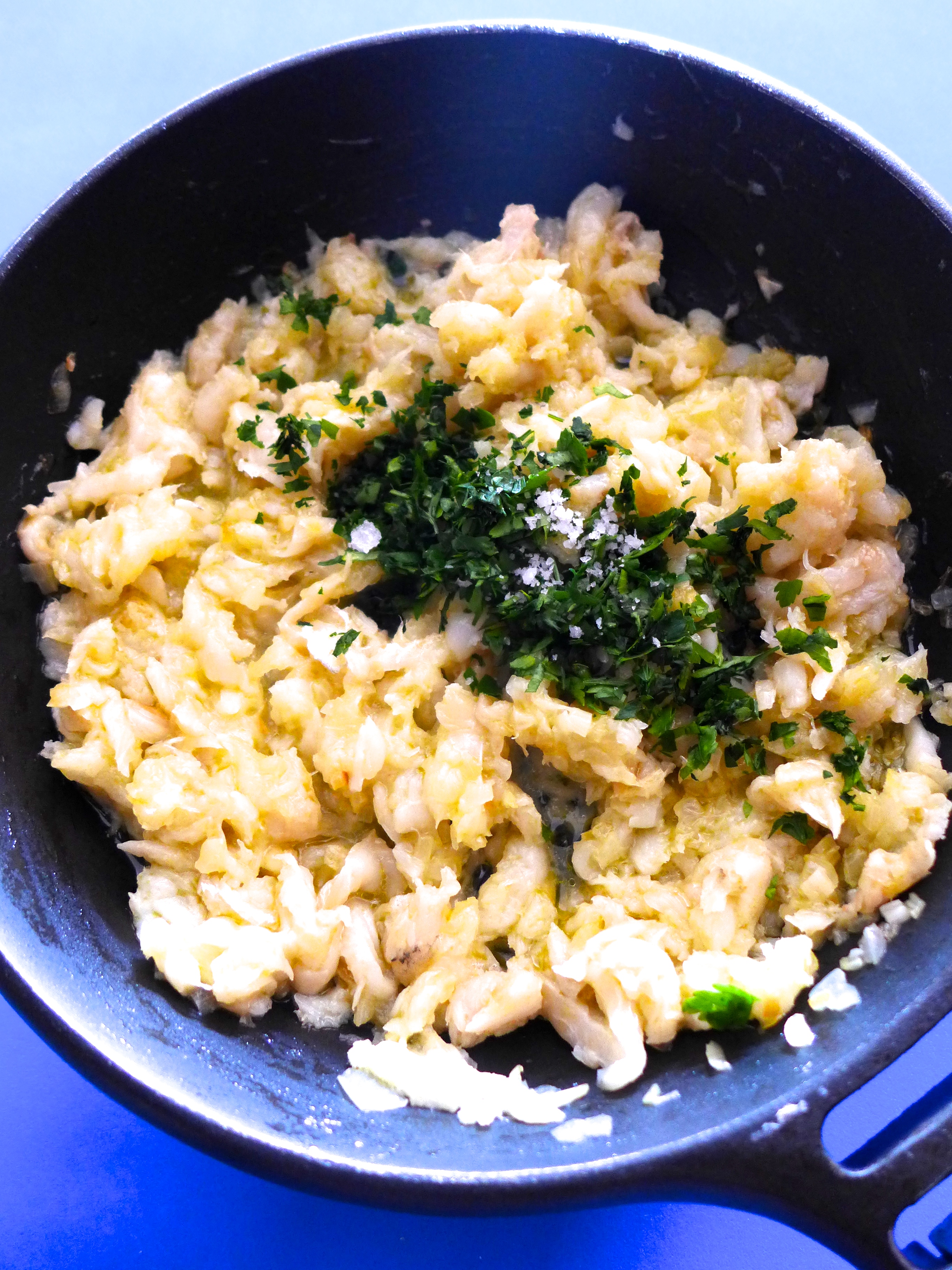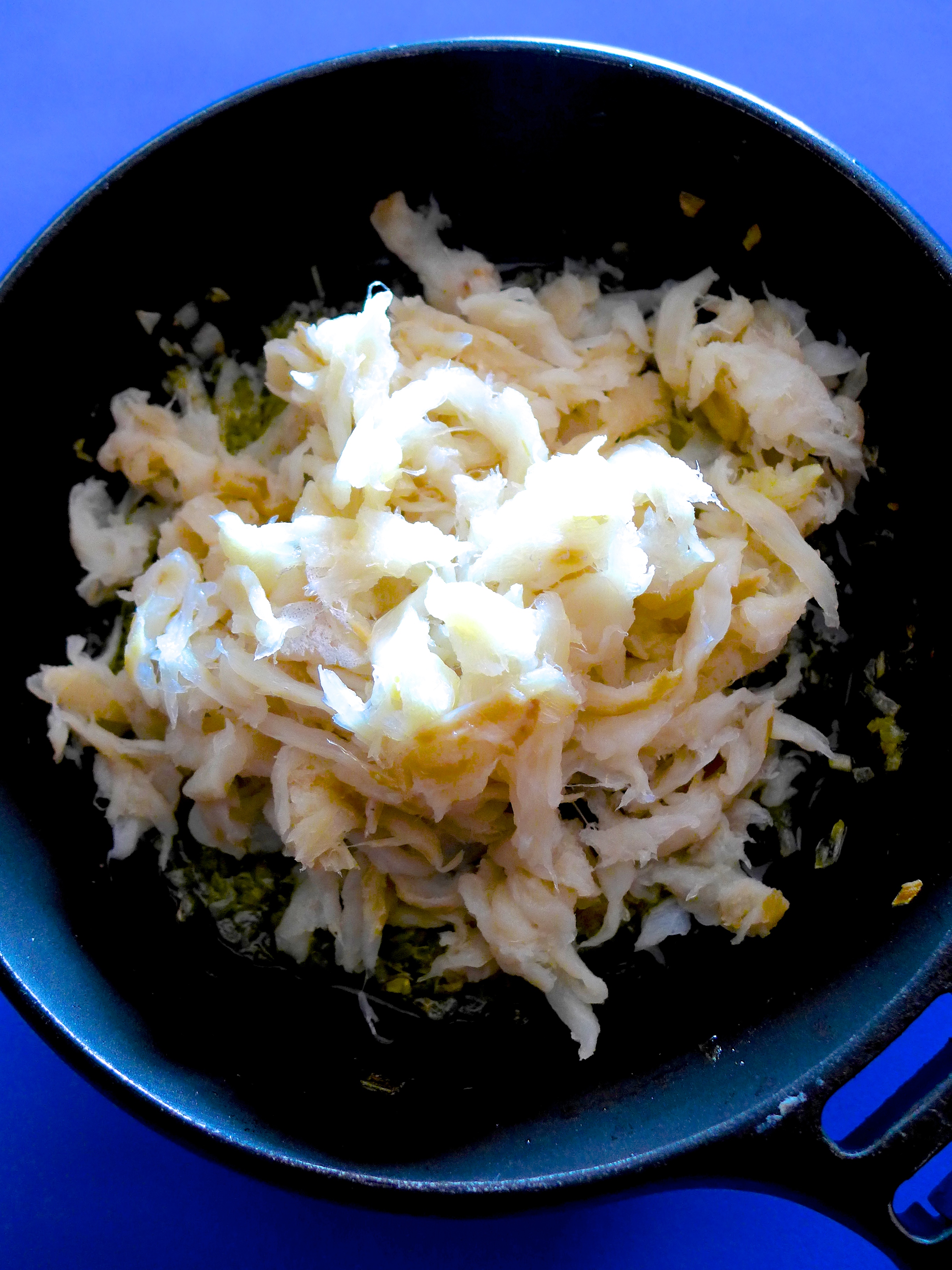 Cuando las verduras están pochadas, añado el bacalao y el perejil. Lo remuevo durante un par de minutos y lo retiro del fuego y de la sartén.