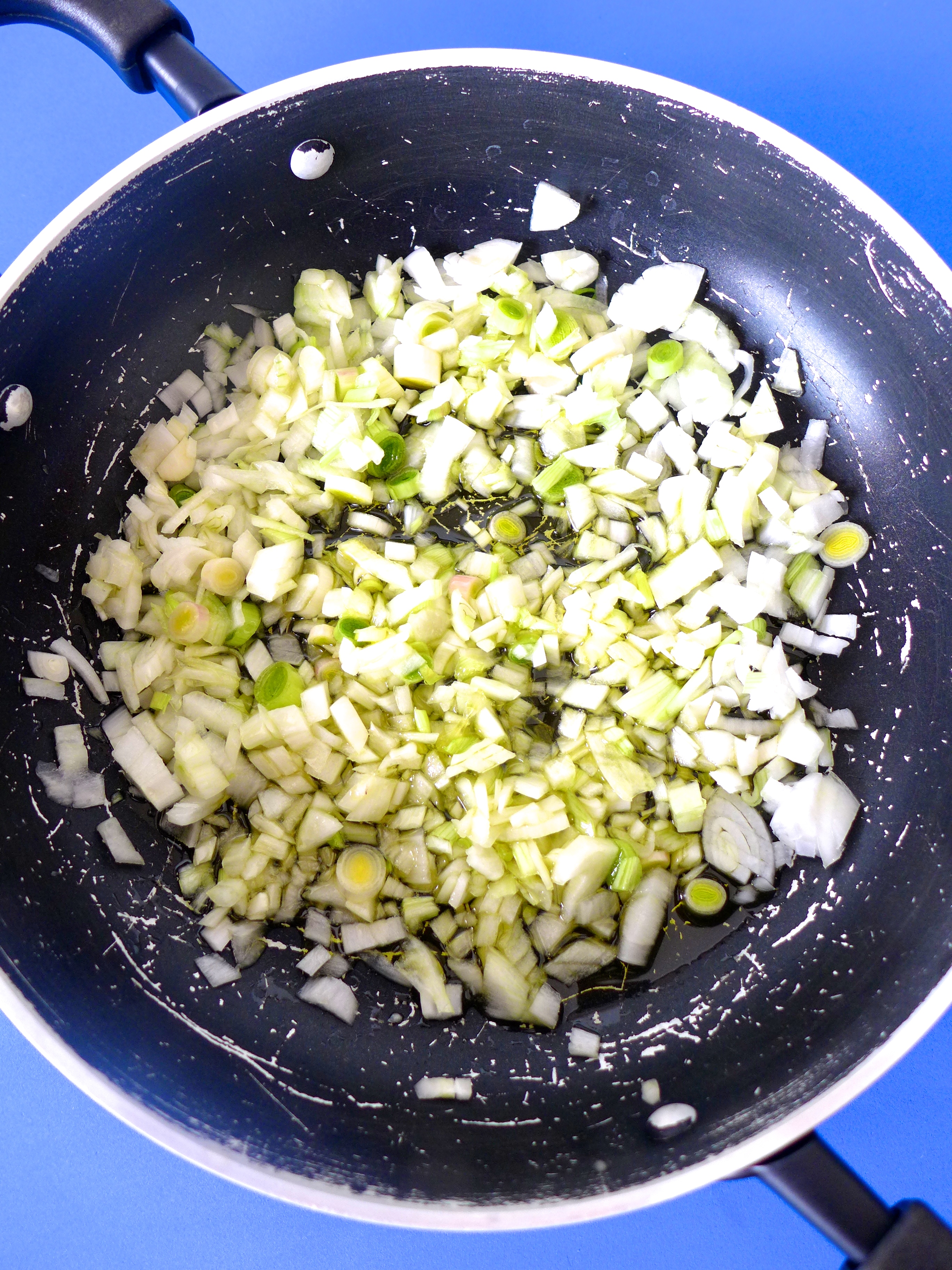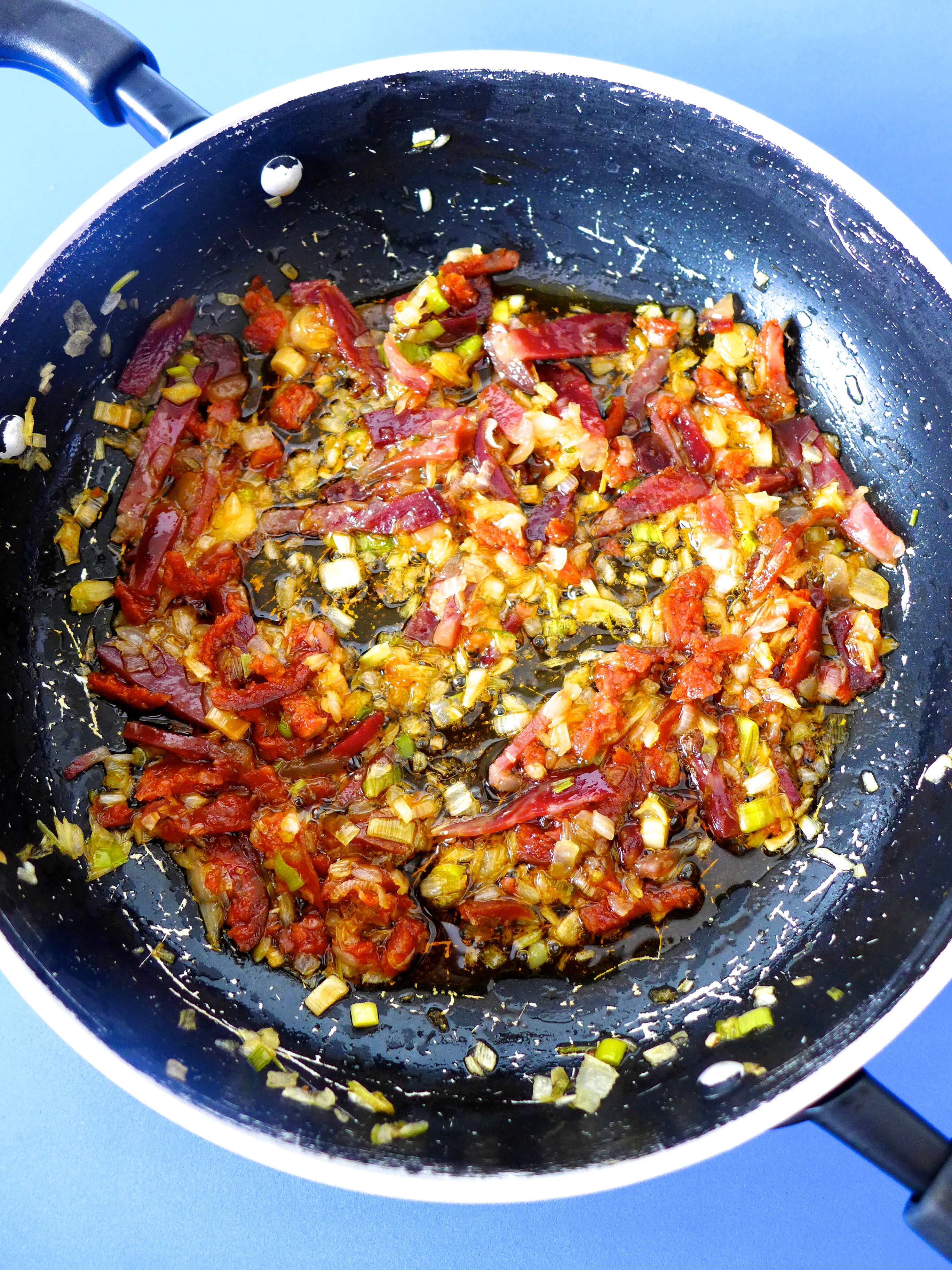 Rehogo la cebolla y el ajo y, cuando empieza a dorarse, añado el chorizo y el jamón.