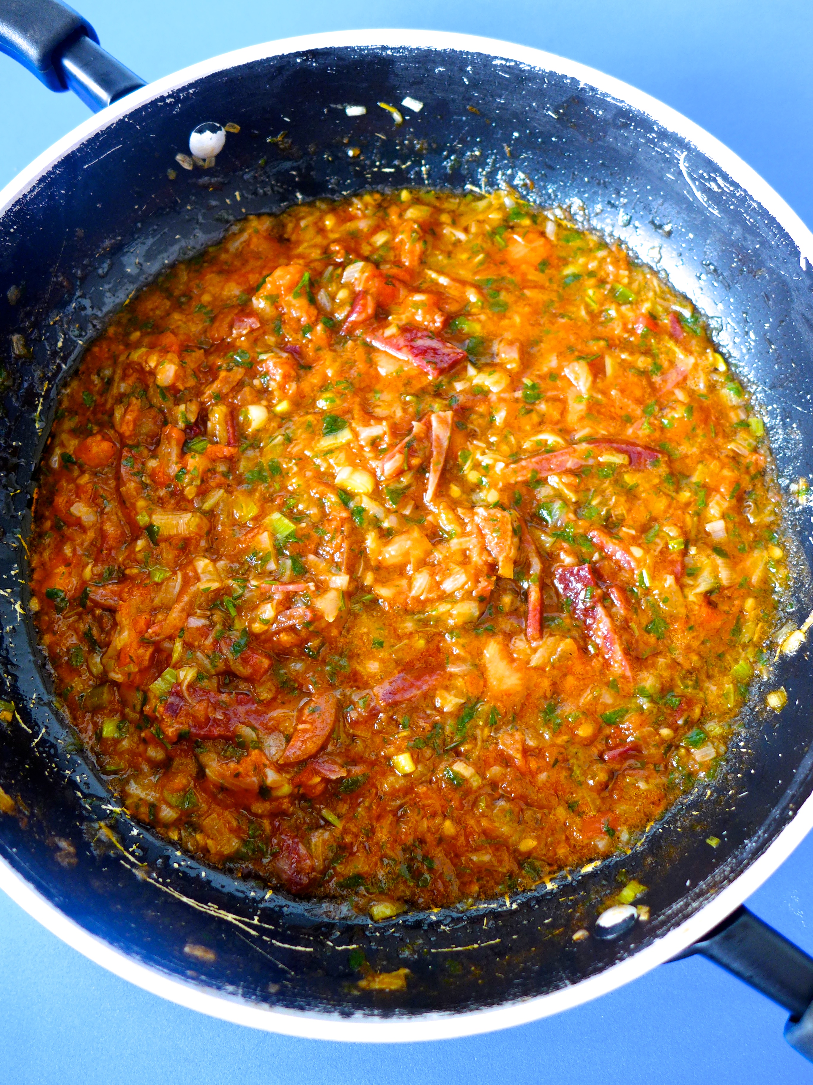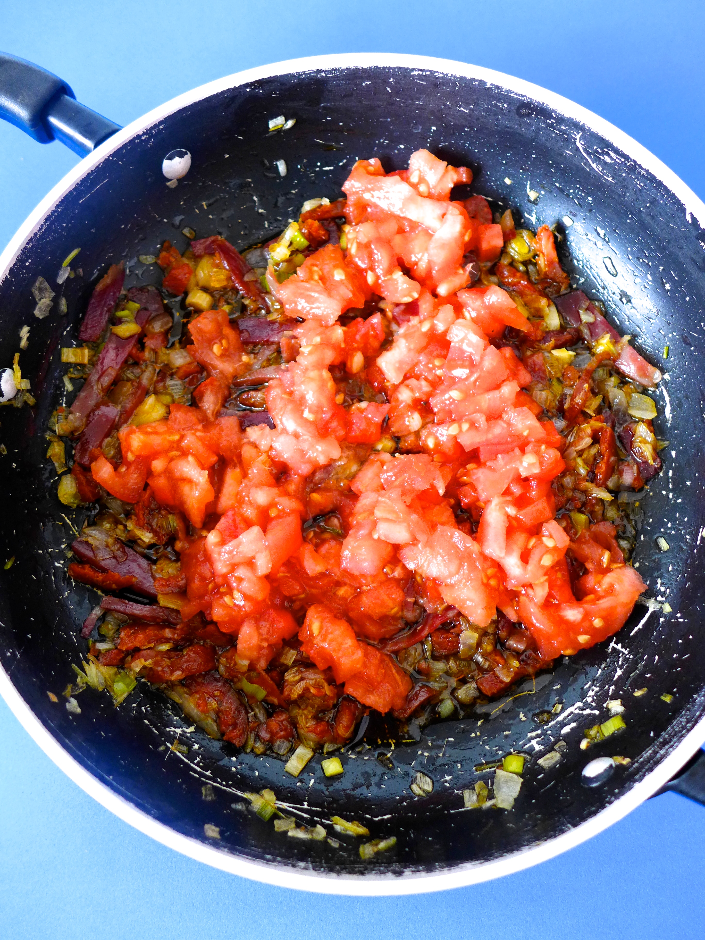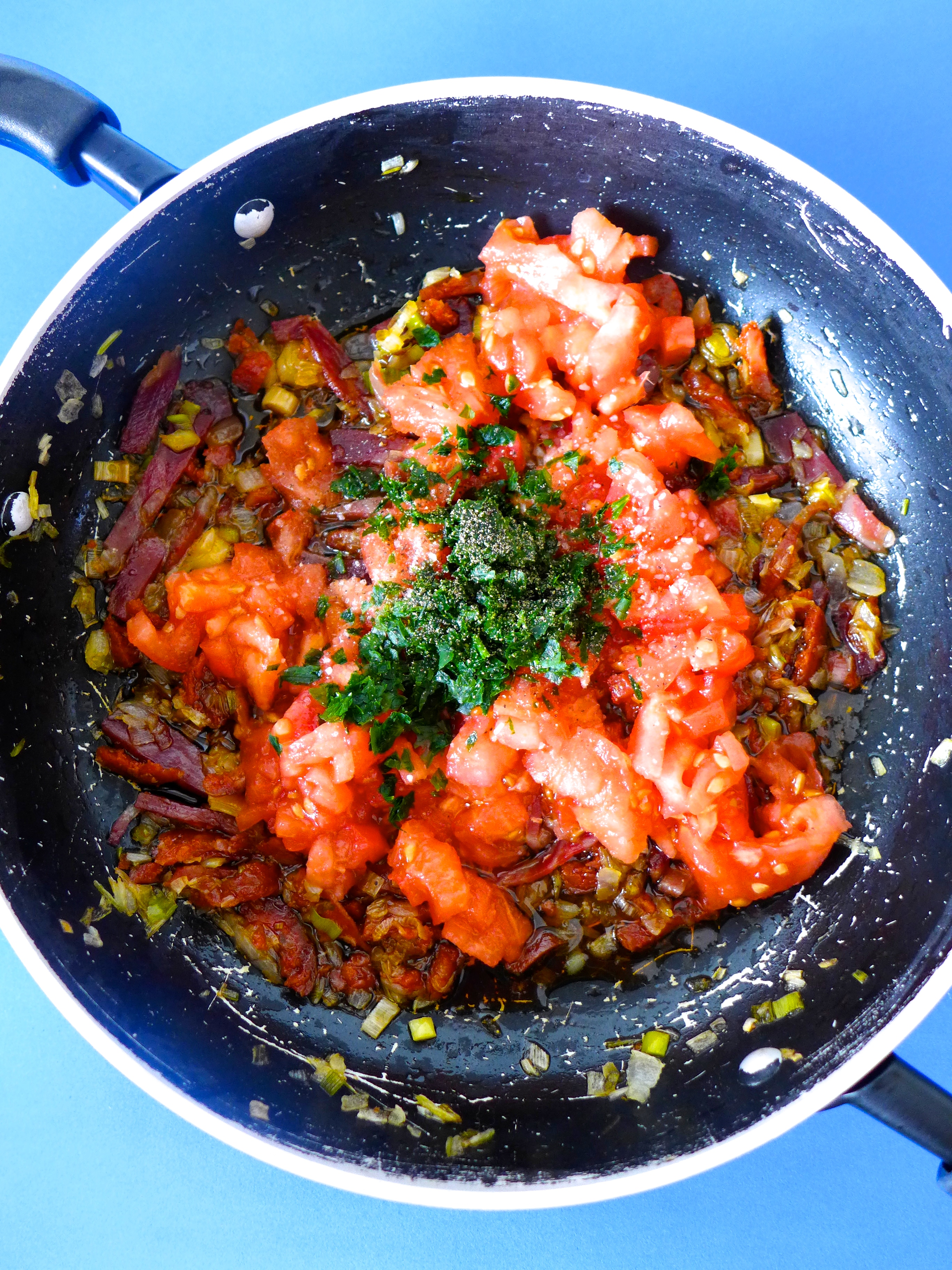 Remuevo un par de minutos y añado el tomate, el perejil, la sal y la pimienta. Lo dejo cociendo unos 10 minutos más, hasta que el tomate se haya ablandado.