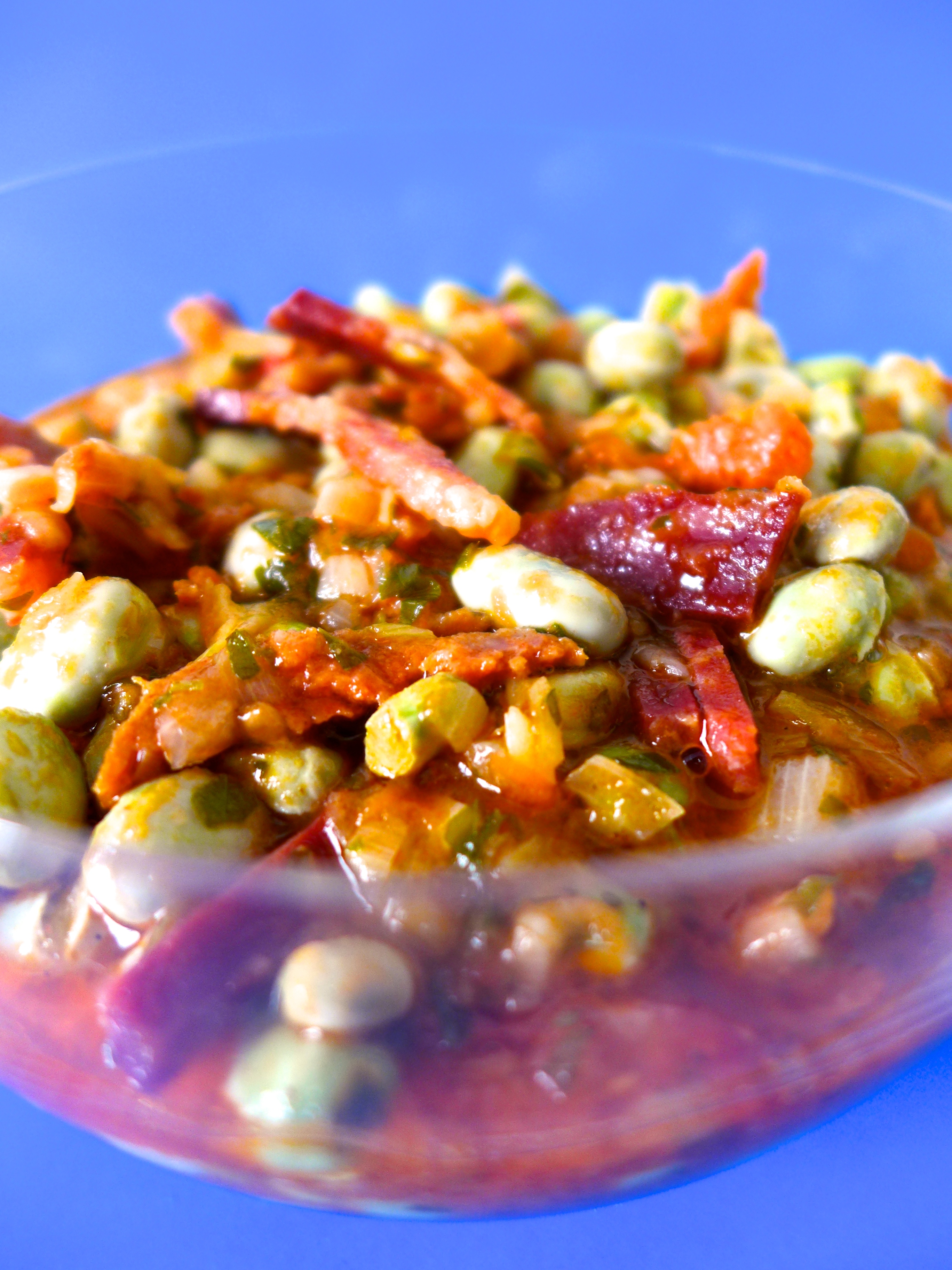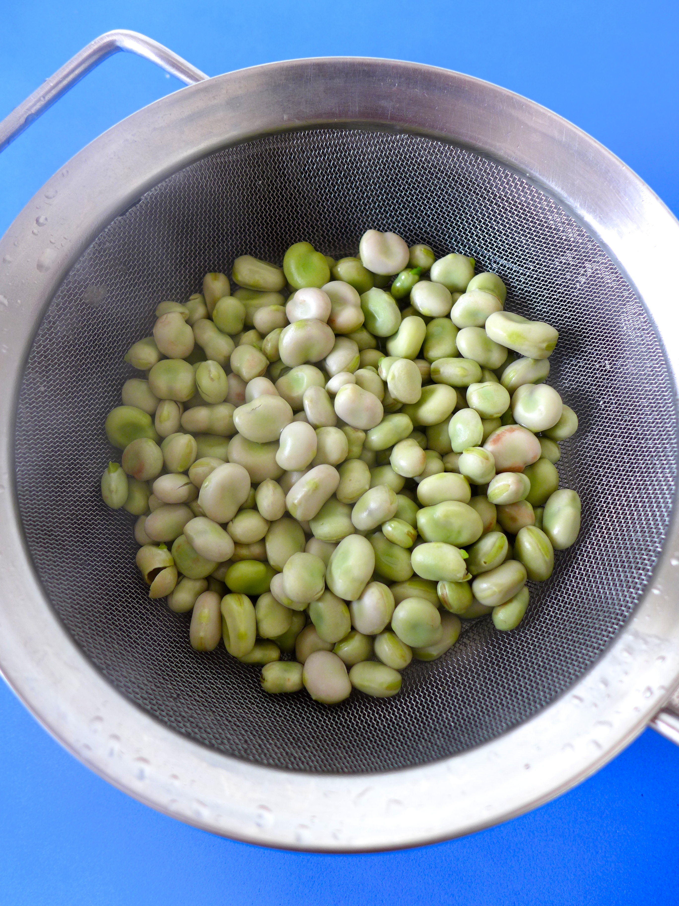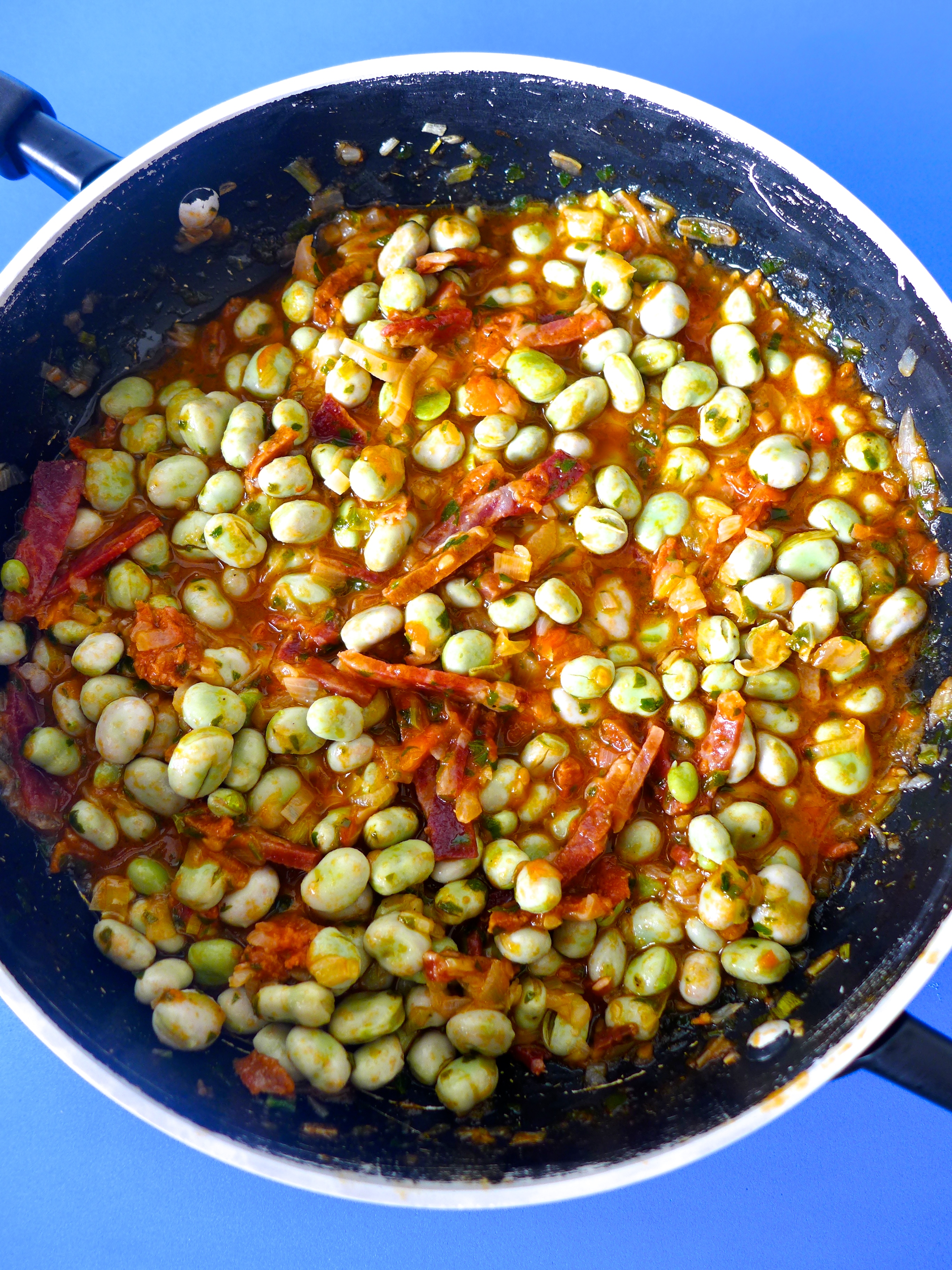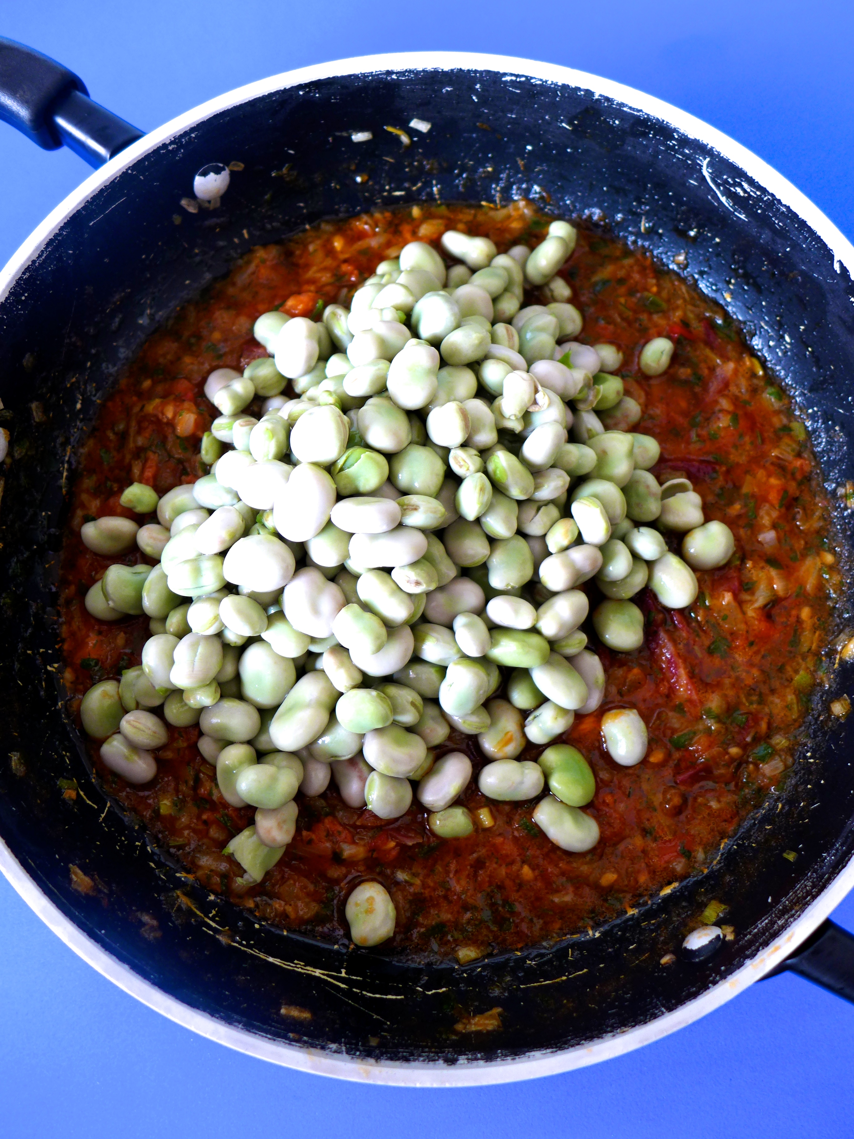 Cuando las habitas están blandas, las escurro y las añado a la salsa. Las dejo cociendo otros 5 minutos.