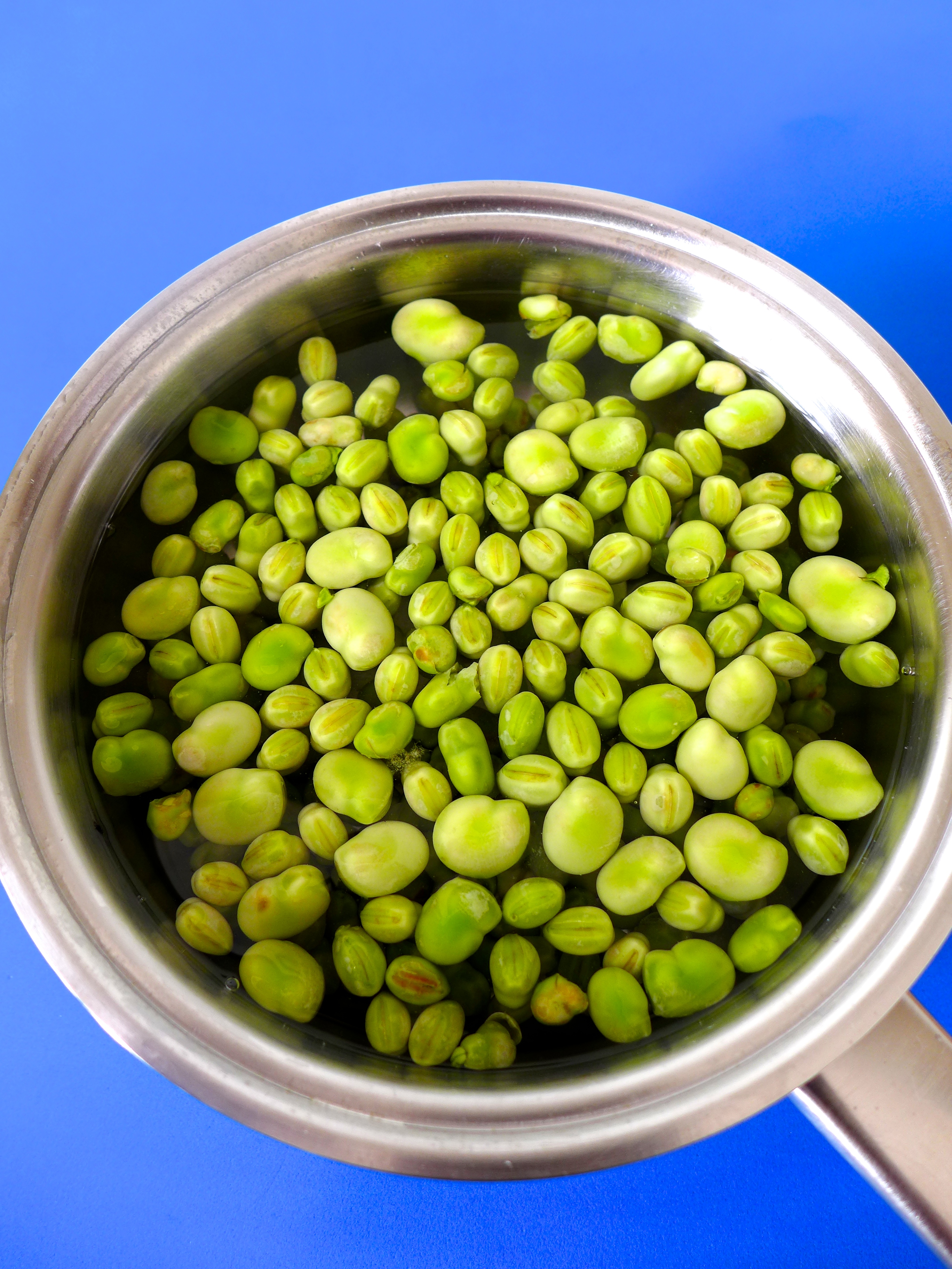 Pongo al fuego agua con un poco de sal. Cuando rompe a hervir, echo las habitas y las dejo cocer a fuego medio-bajo hasta que se ablandan (una media hora).