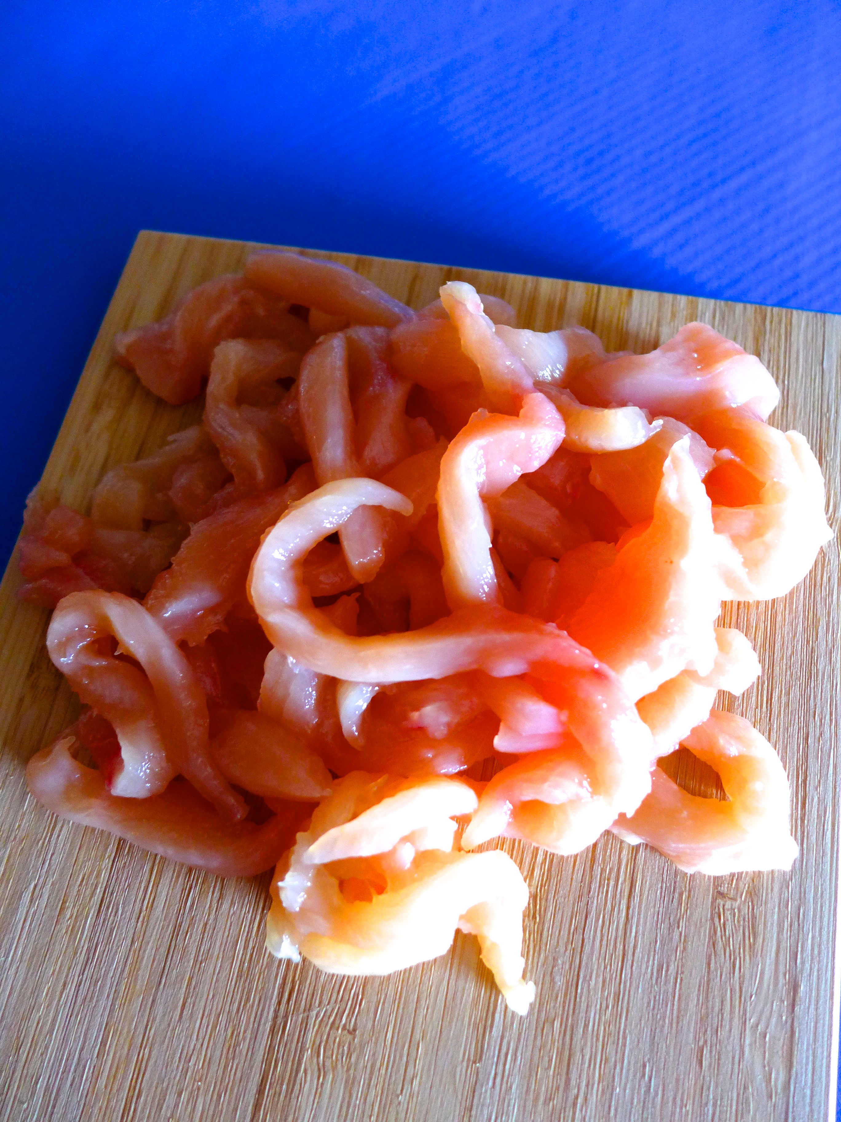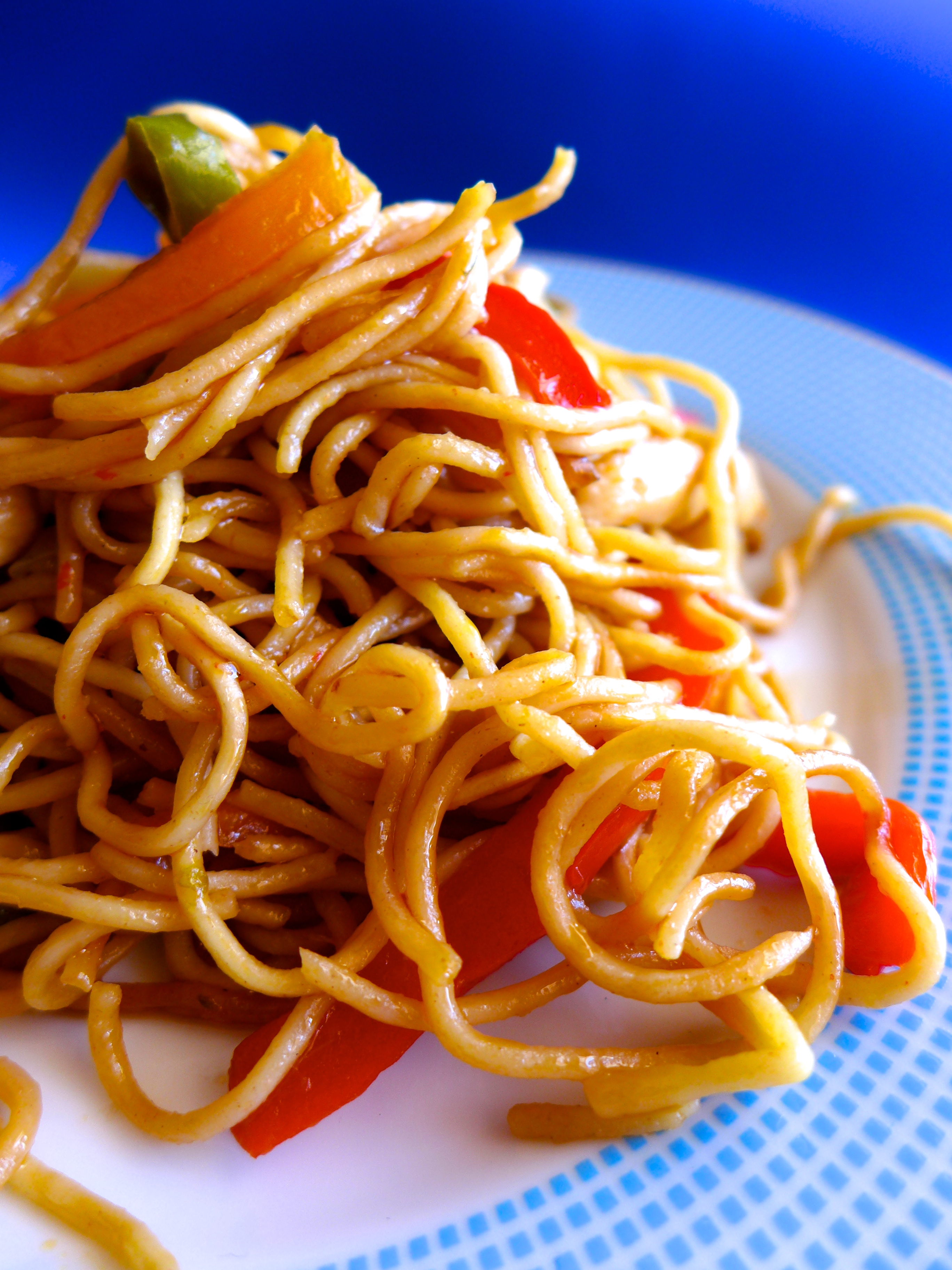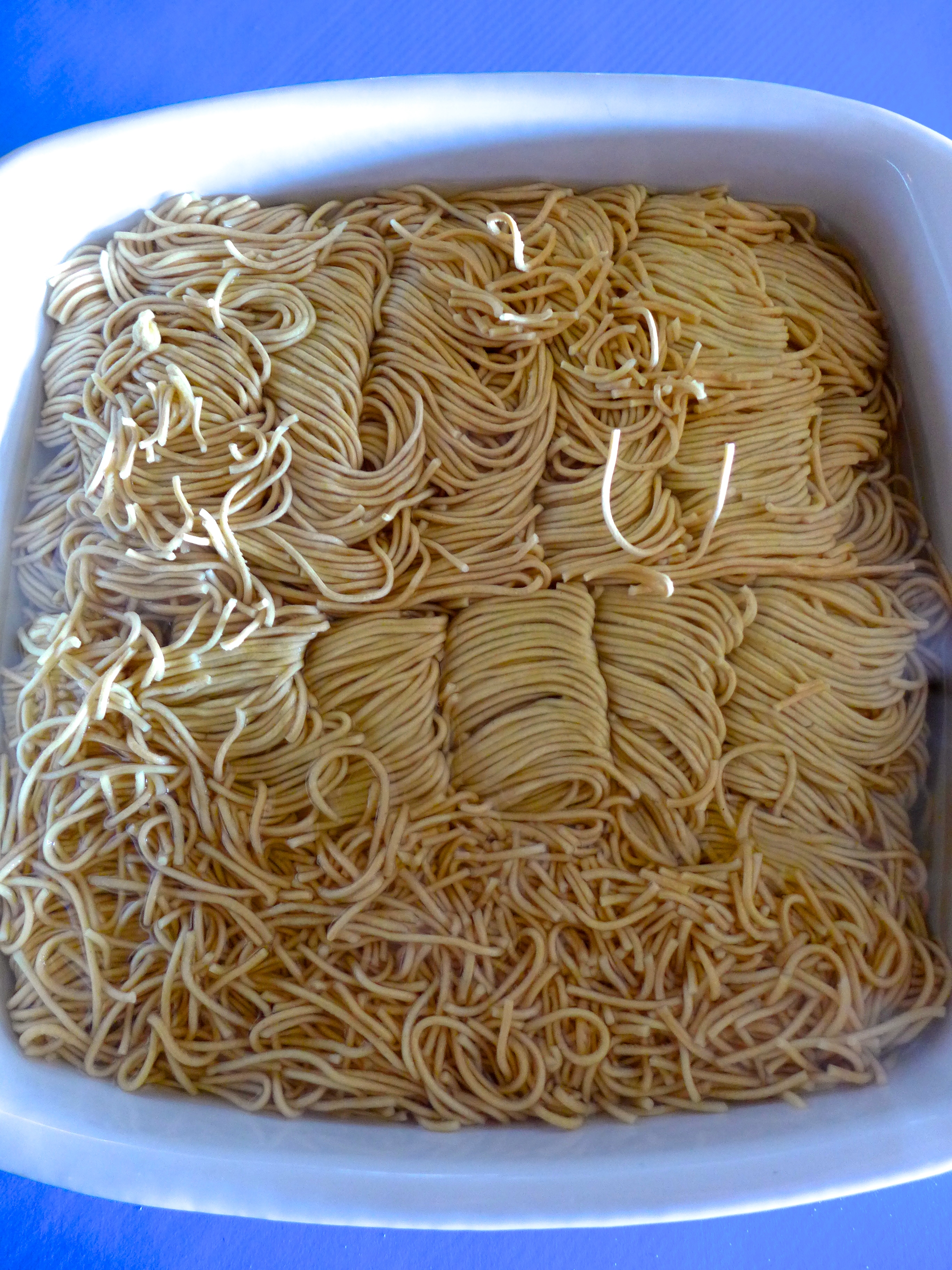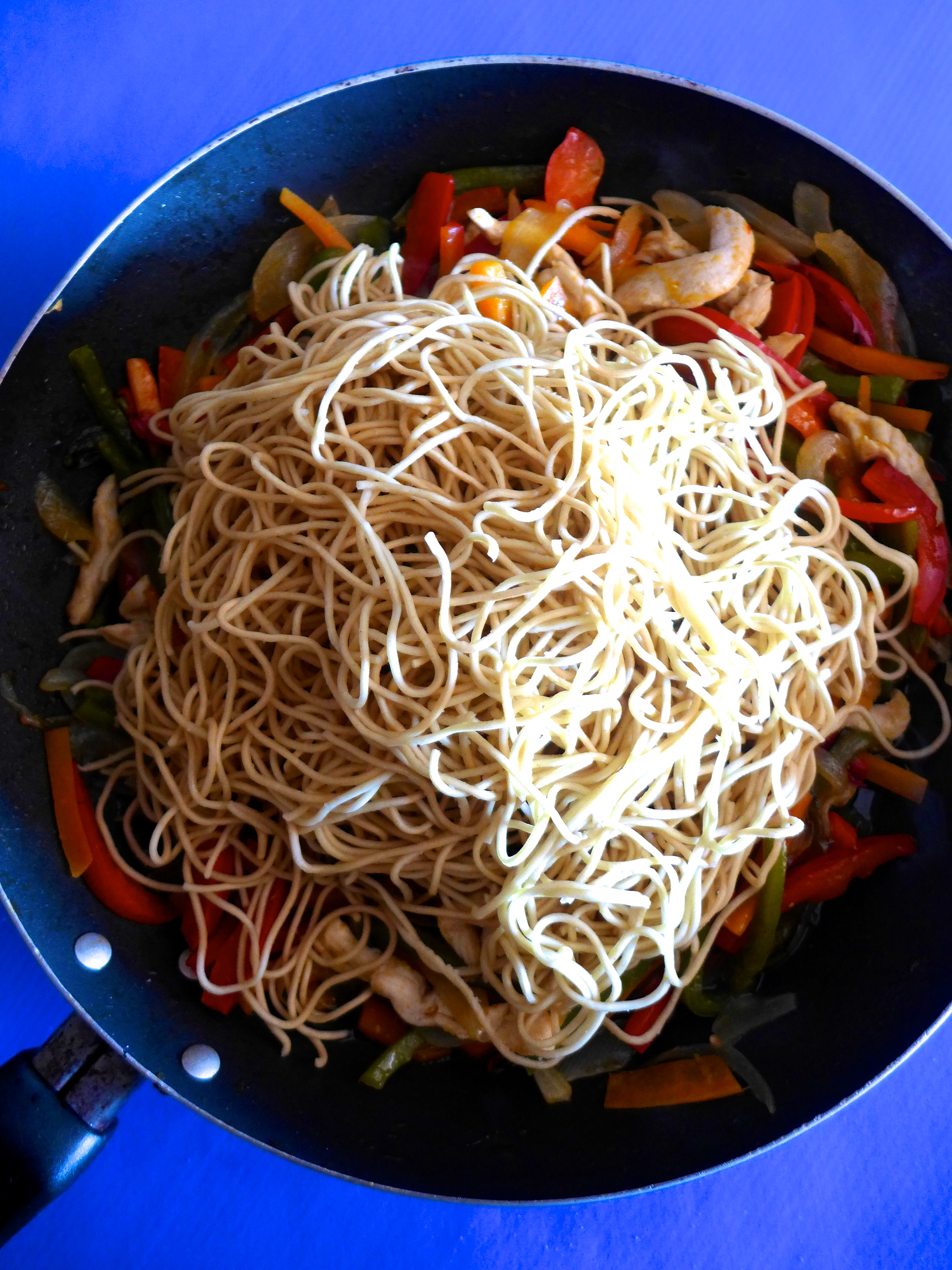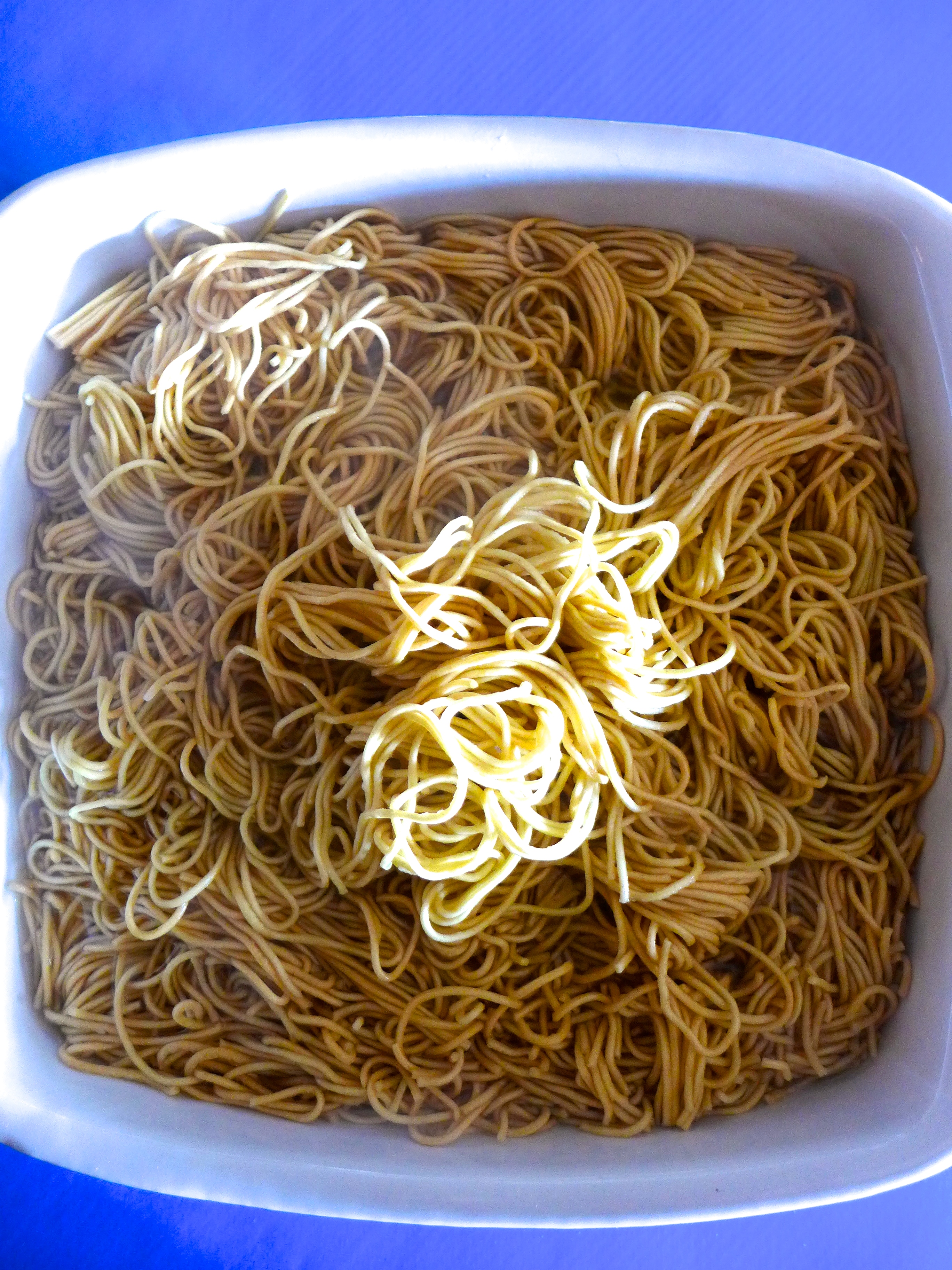 Mientras, caliento agua en una cazuela y la vierto en los noodles. Dejo que reposen un par de minutos y remuevo para que se suelten.
