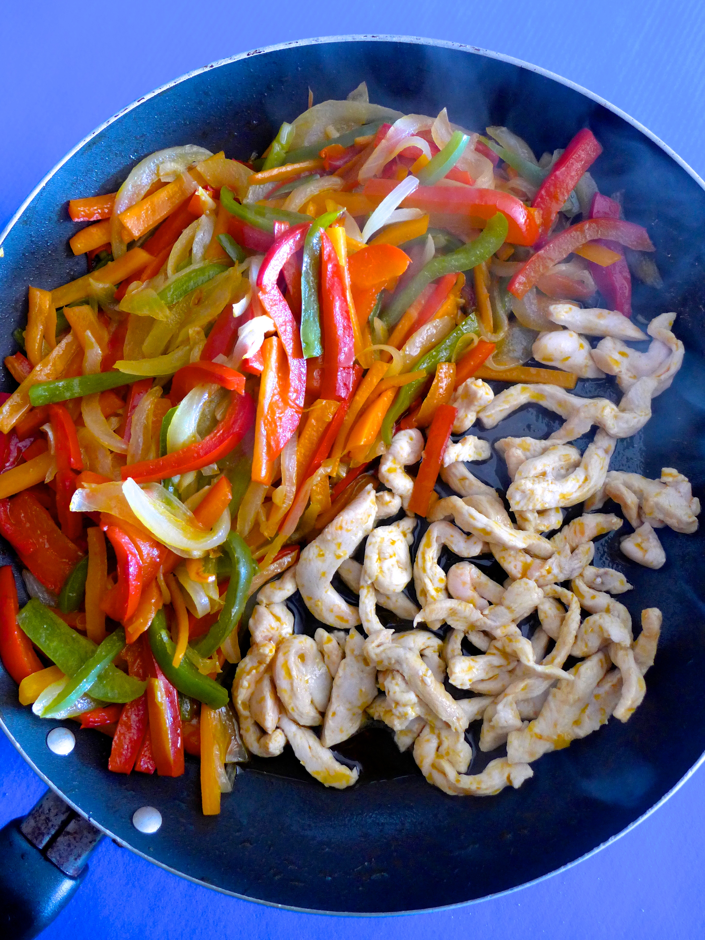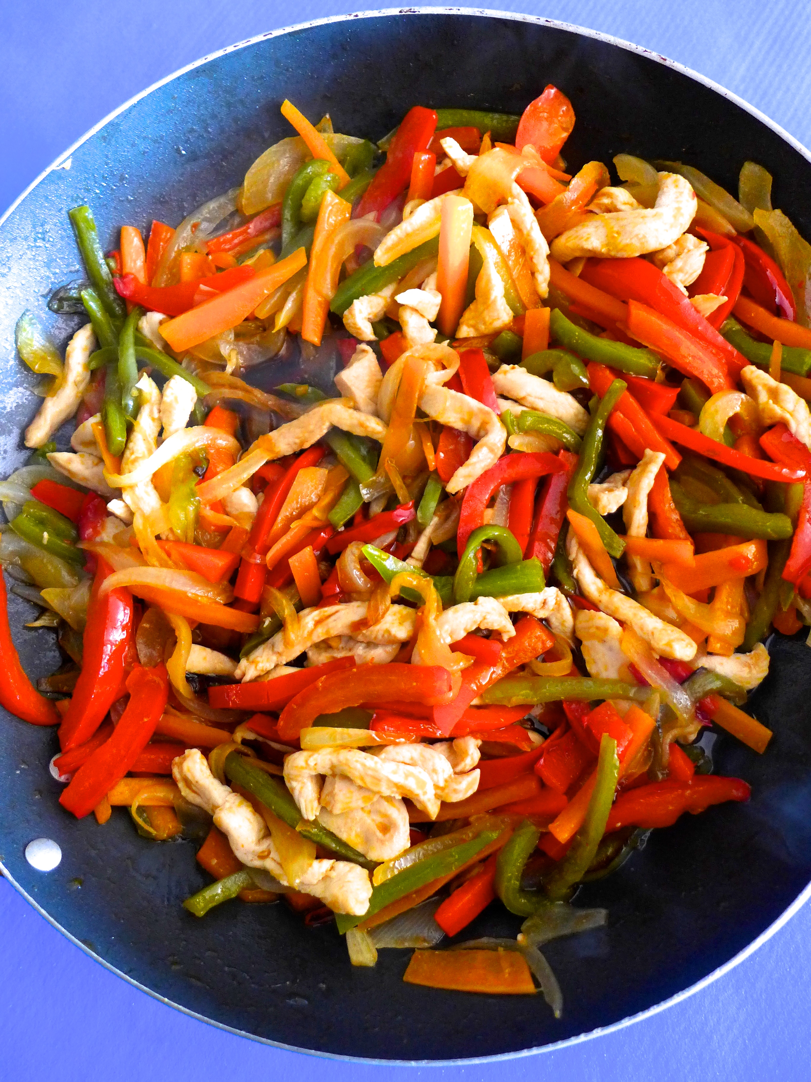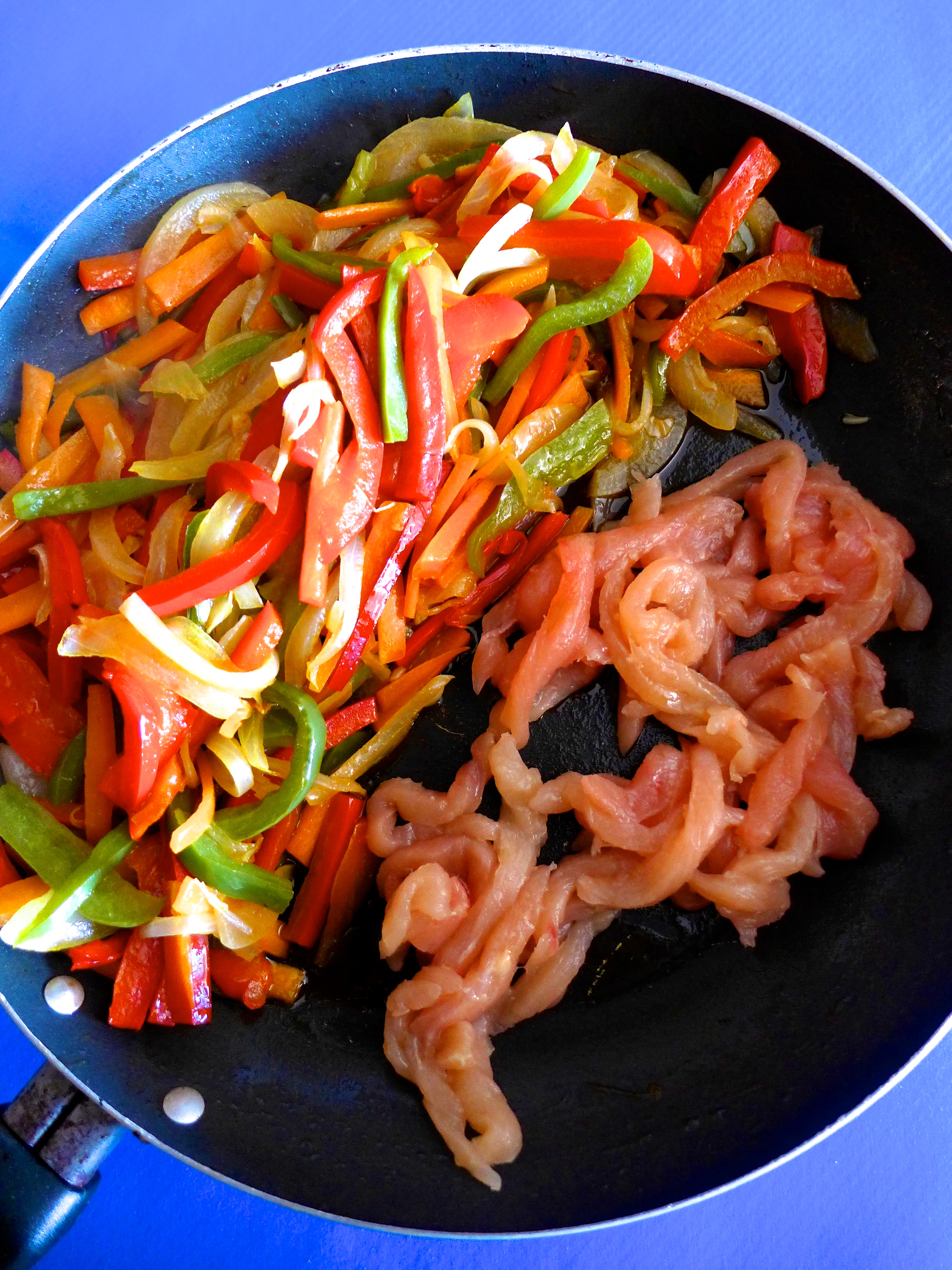 Los escurro y los vuelco en la sartén con las verduras y el pollo. Lo salteo todo junto y los sirvo bien calientes.