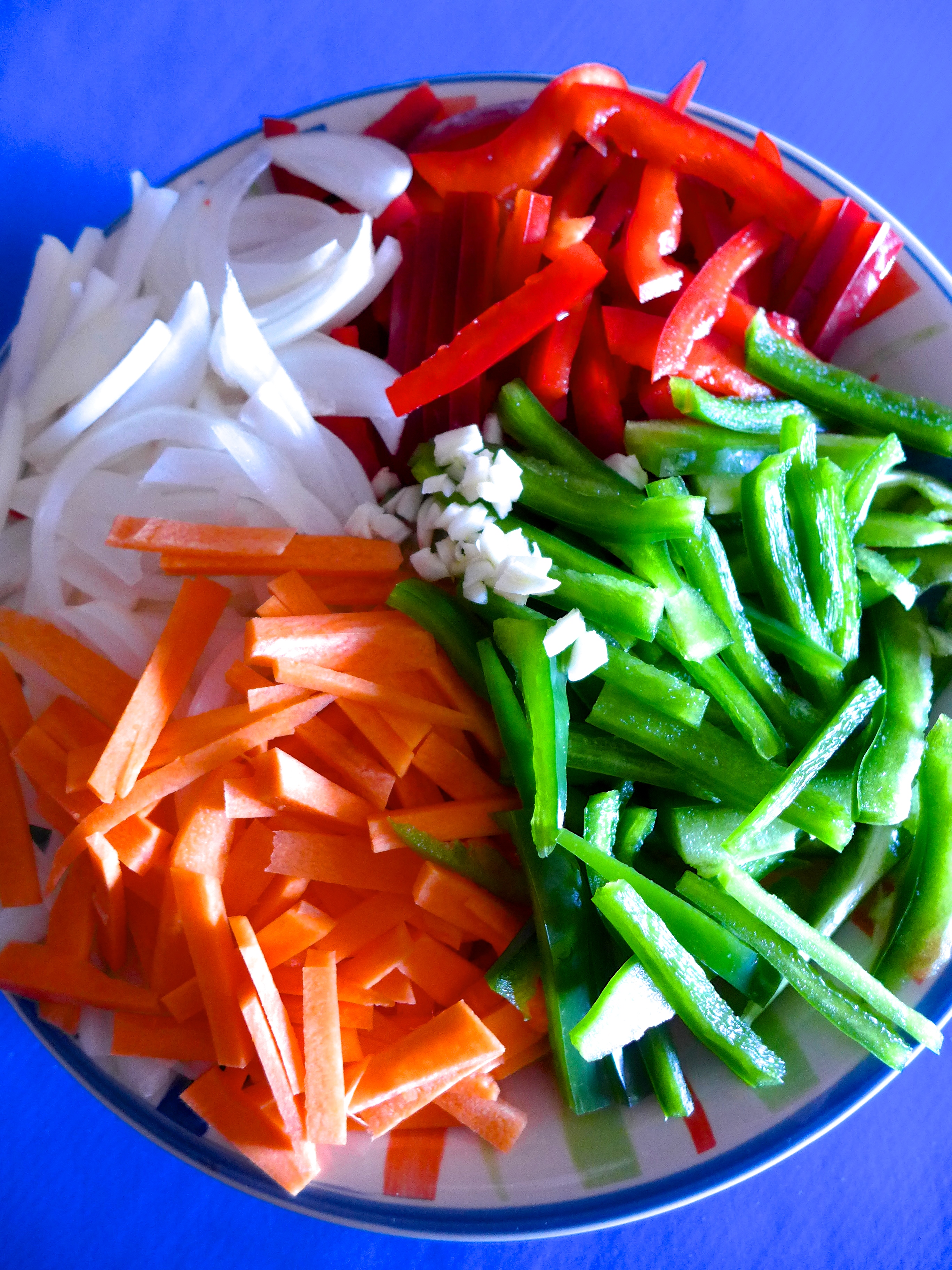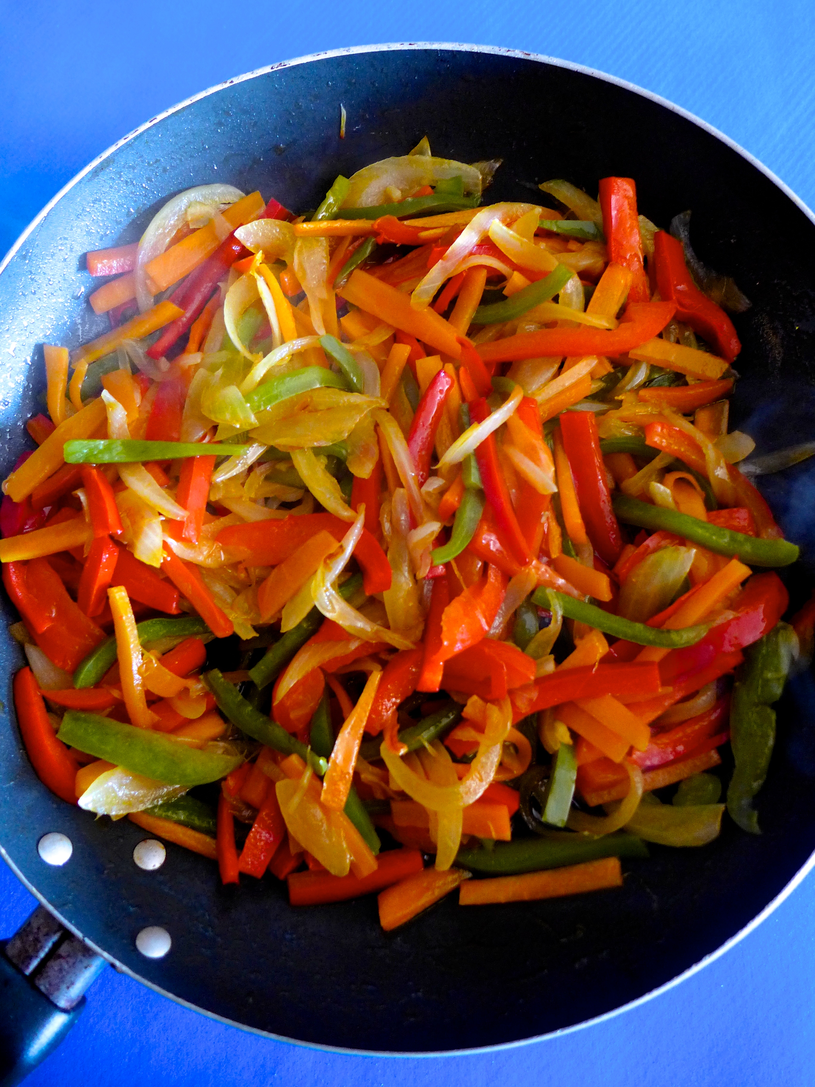 Corto todas las verduras en juliana y las salteo en una sartén con aceite de oliva a fuego medio-alto durante unos 8 minutos.