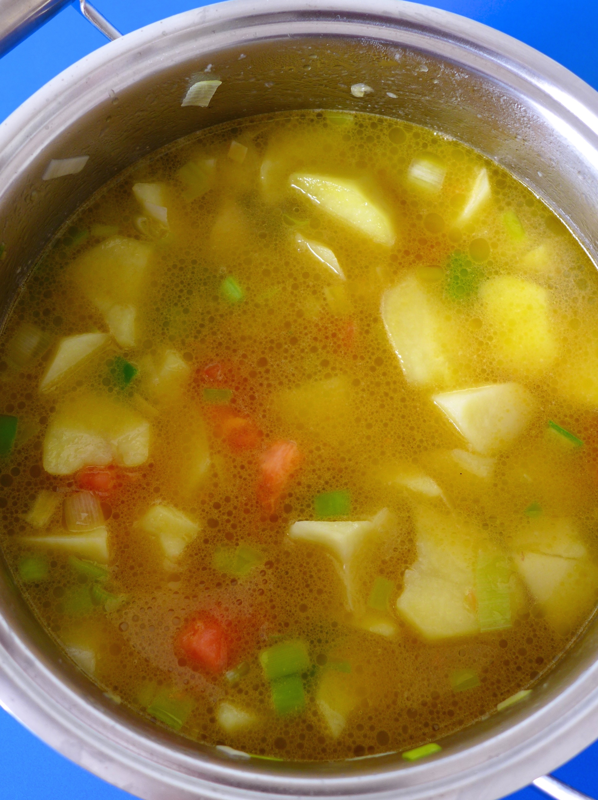 El caldo debe quedar algo espeso. Si me queda aguado, saco unos trozos de patata con un poco del caldo, los escacho y los devuelvo a la cazuela.