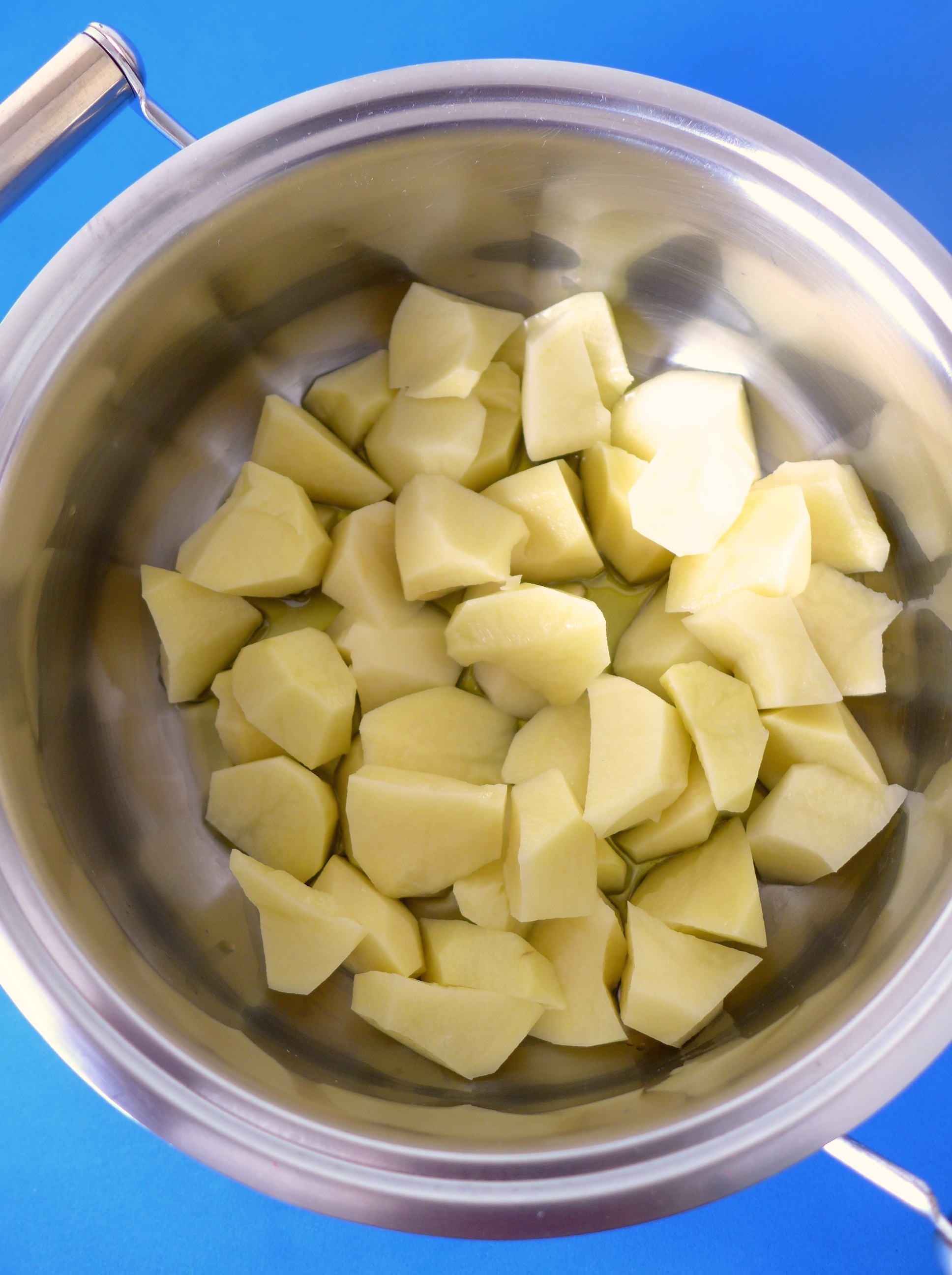 Pelo las patatas, las lavo, las parto chascándolas y las rehogo en aceite de oliva a fuego bajo.