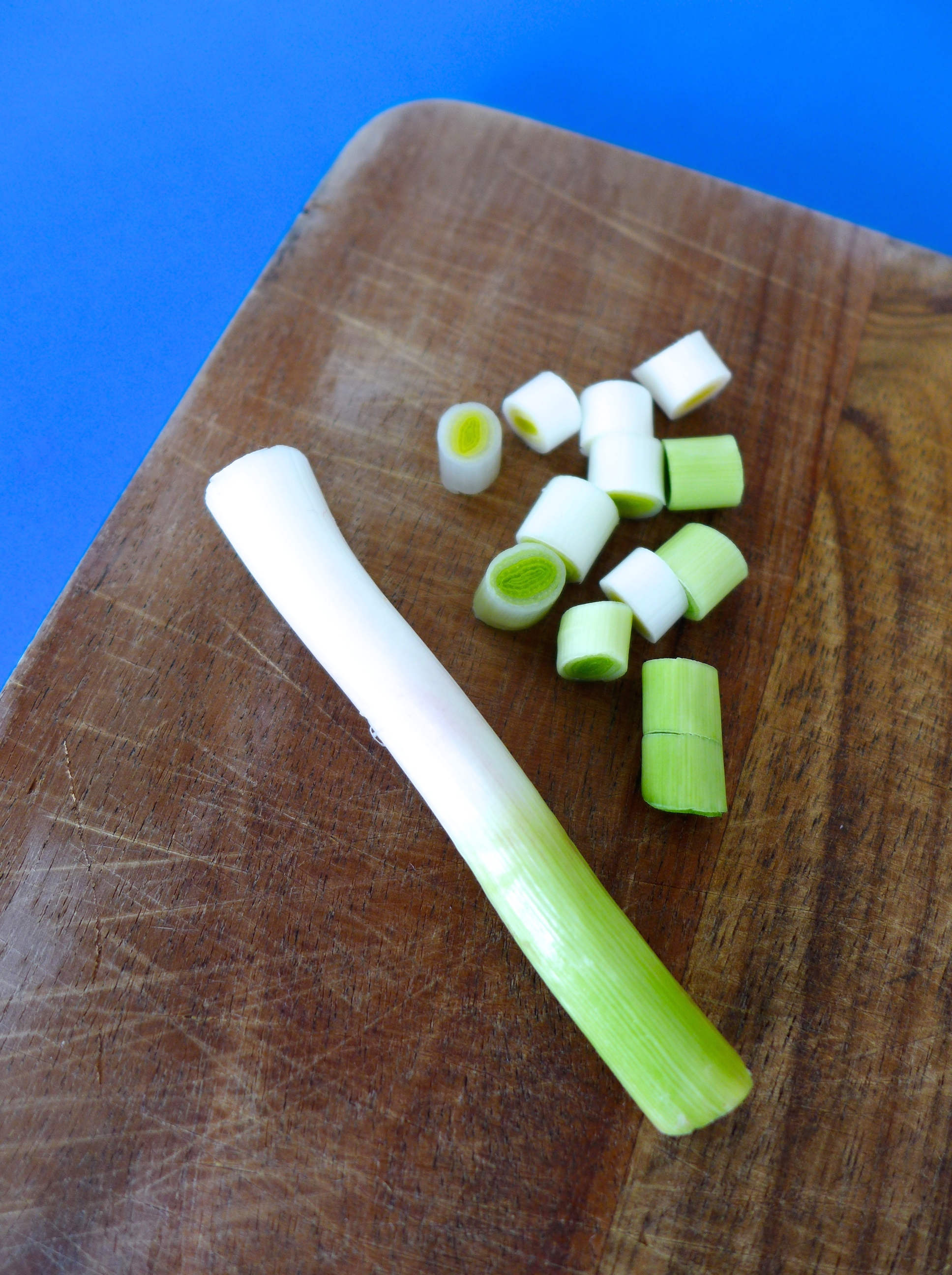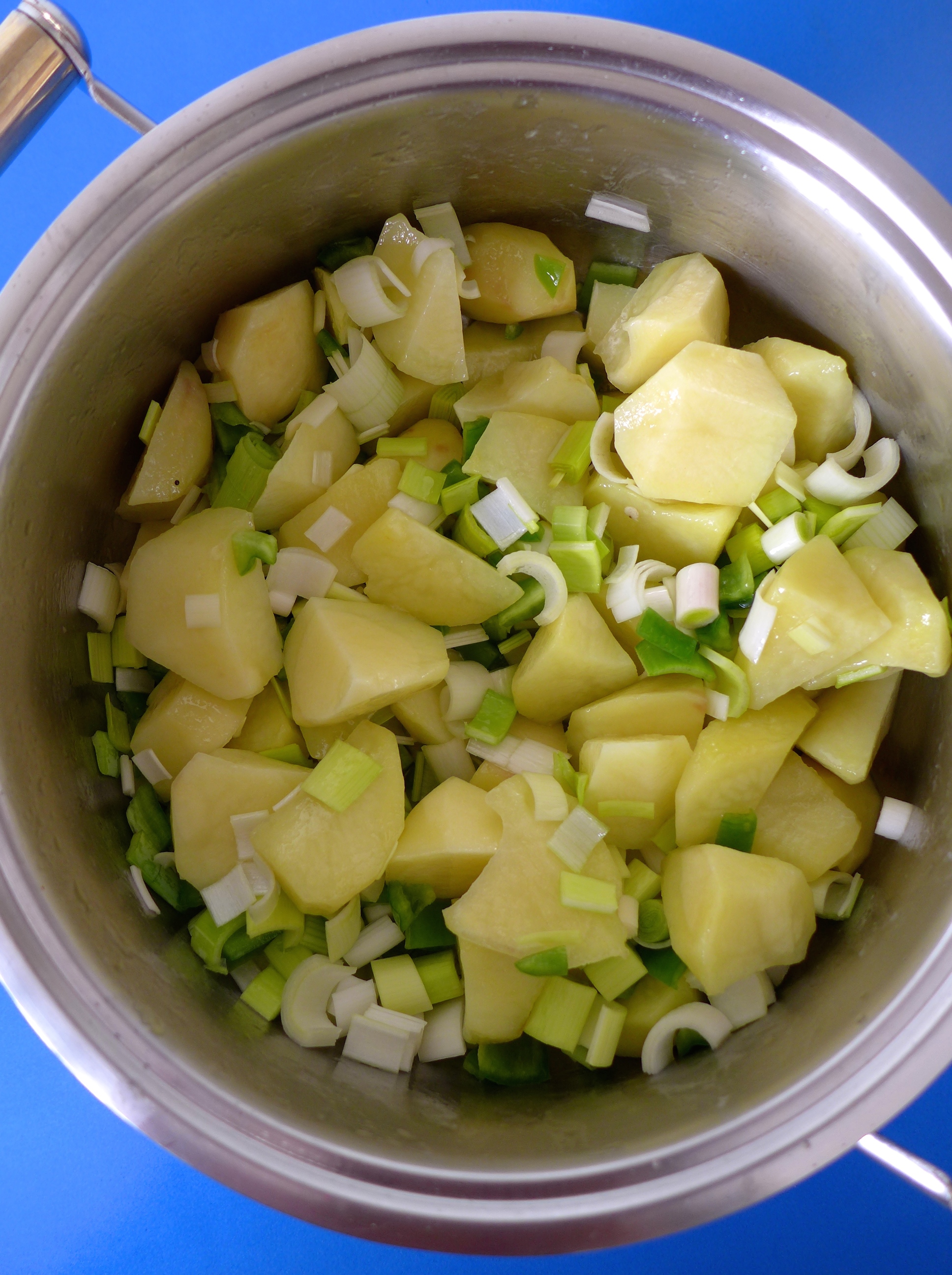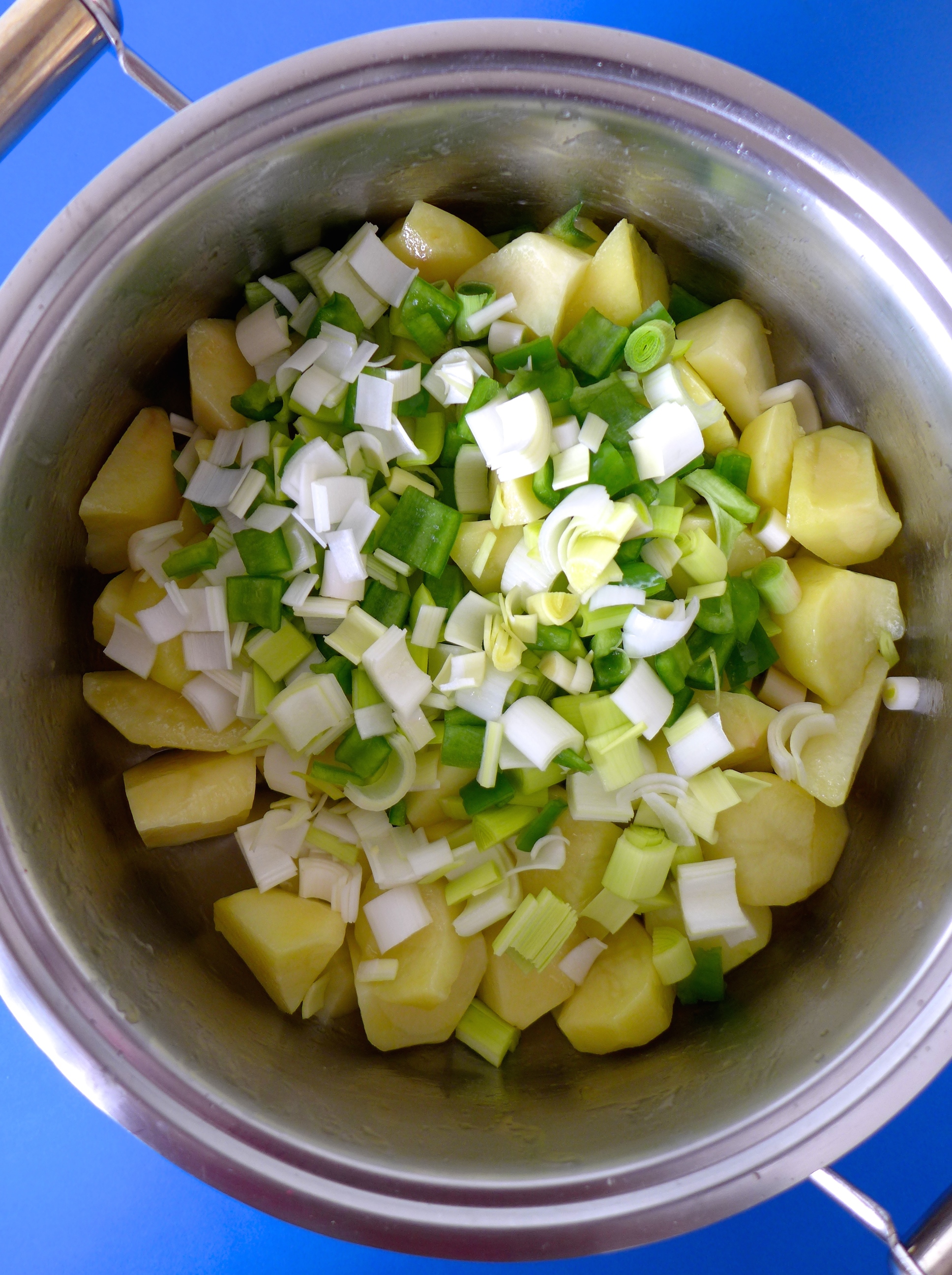 Pico el ajete, el pimiento verde y el puerro, y los añado a las patatas. Remuevo.