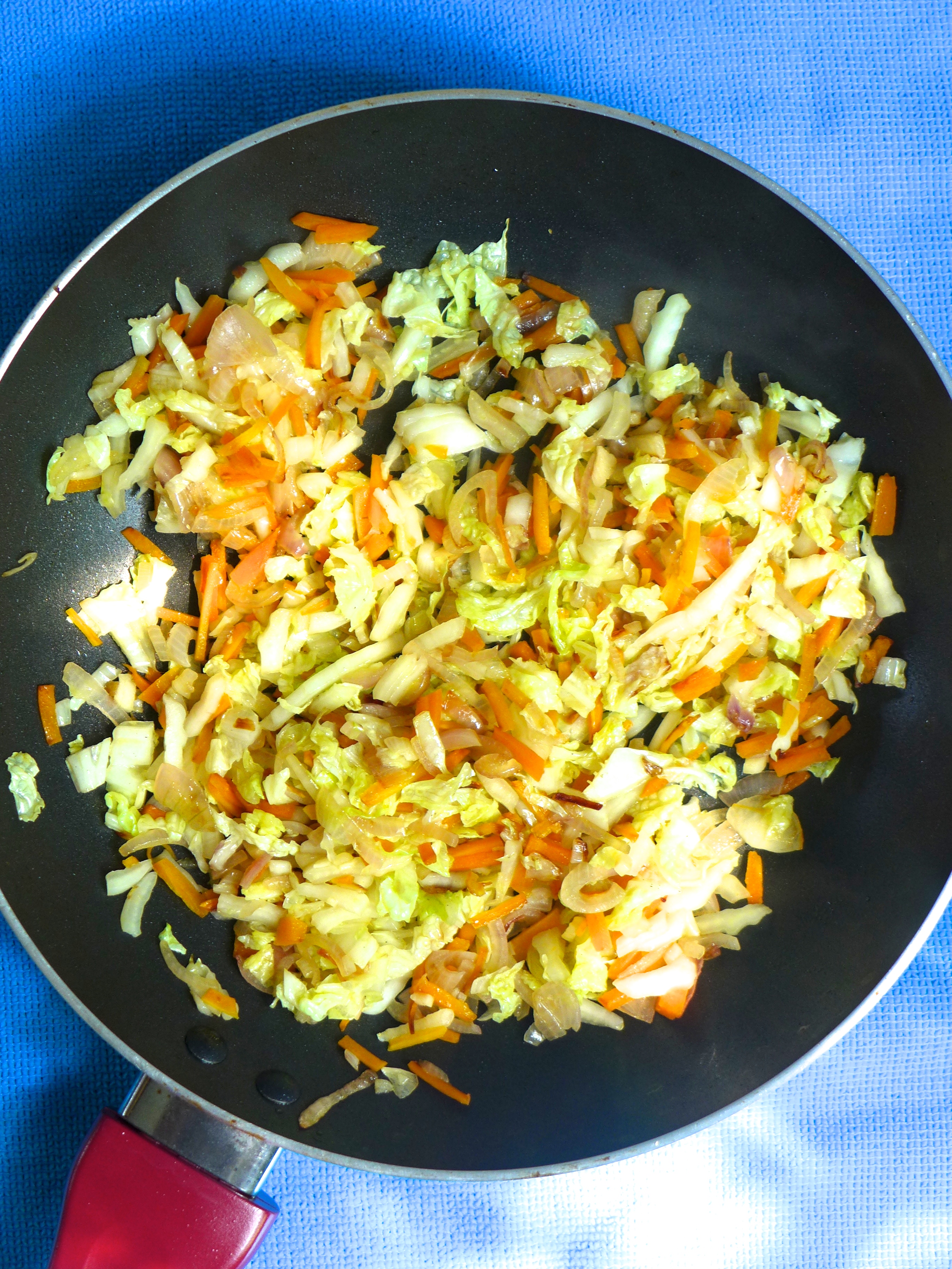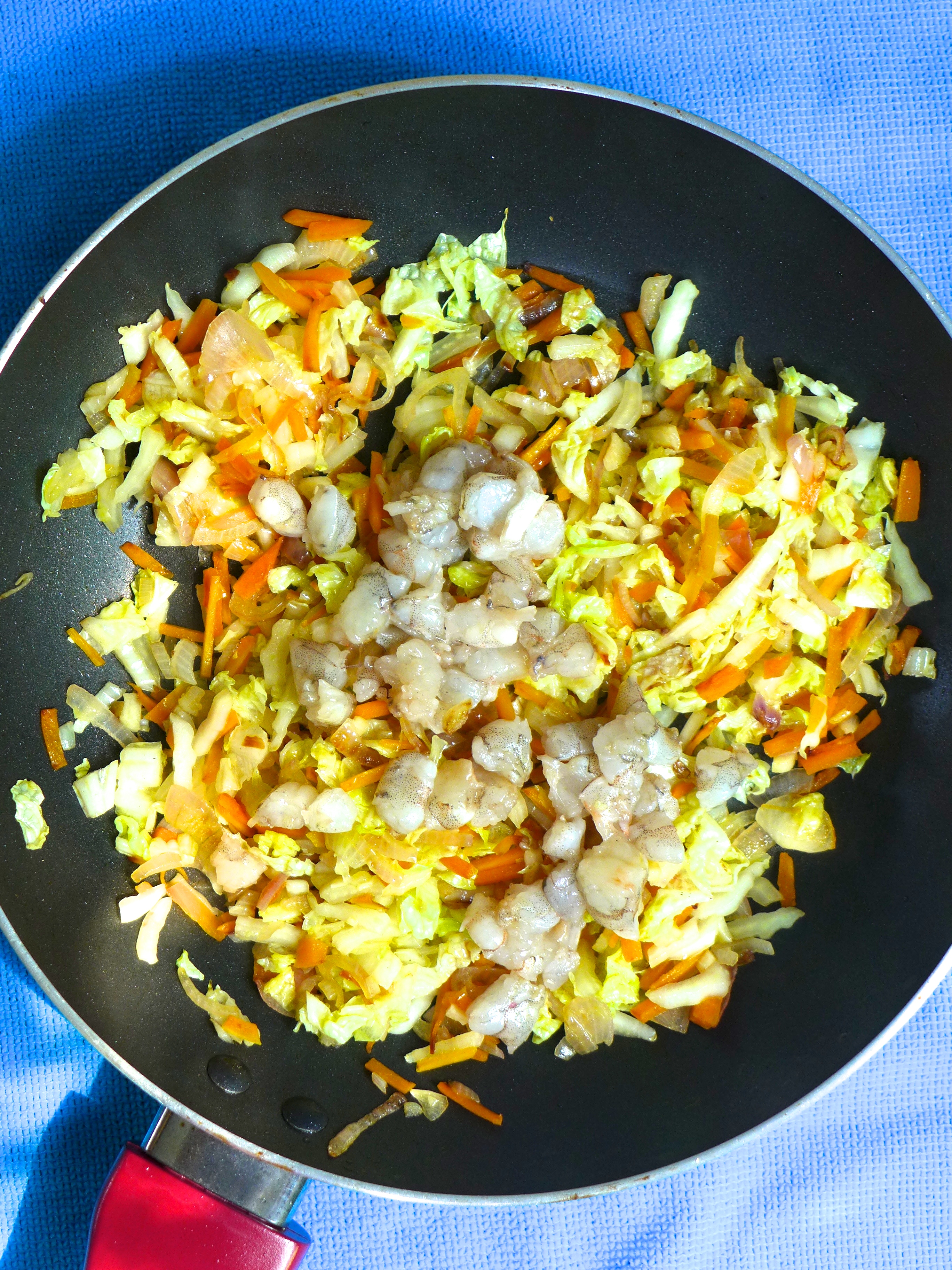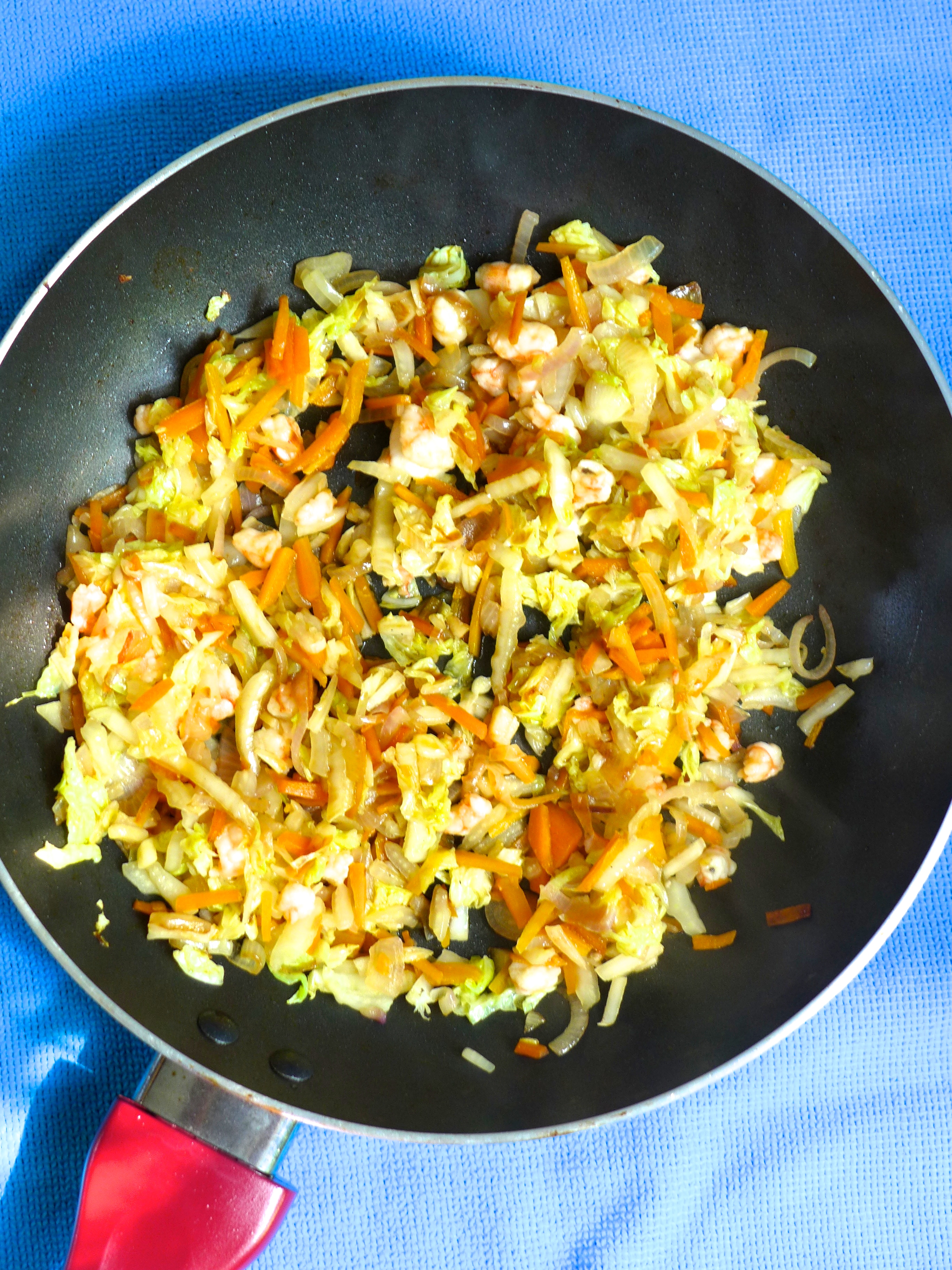 En una sartén con un poco de aceite salteo la zanahoria durante un par de minutos. Añado los chalotes y el ajo. Lo salteo durante otro par de minutos y añado la col china. Remuevo durante un minuto y echo las gambas.