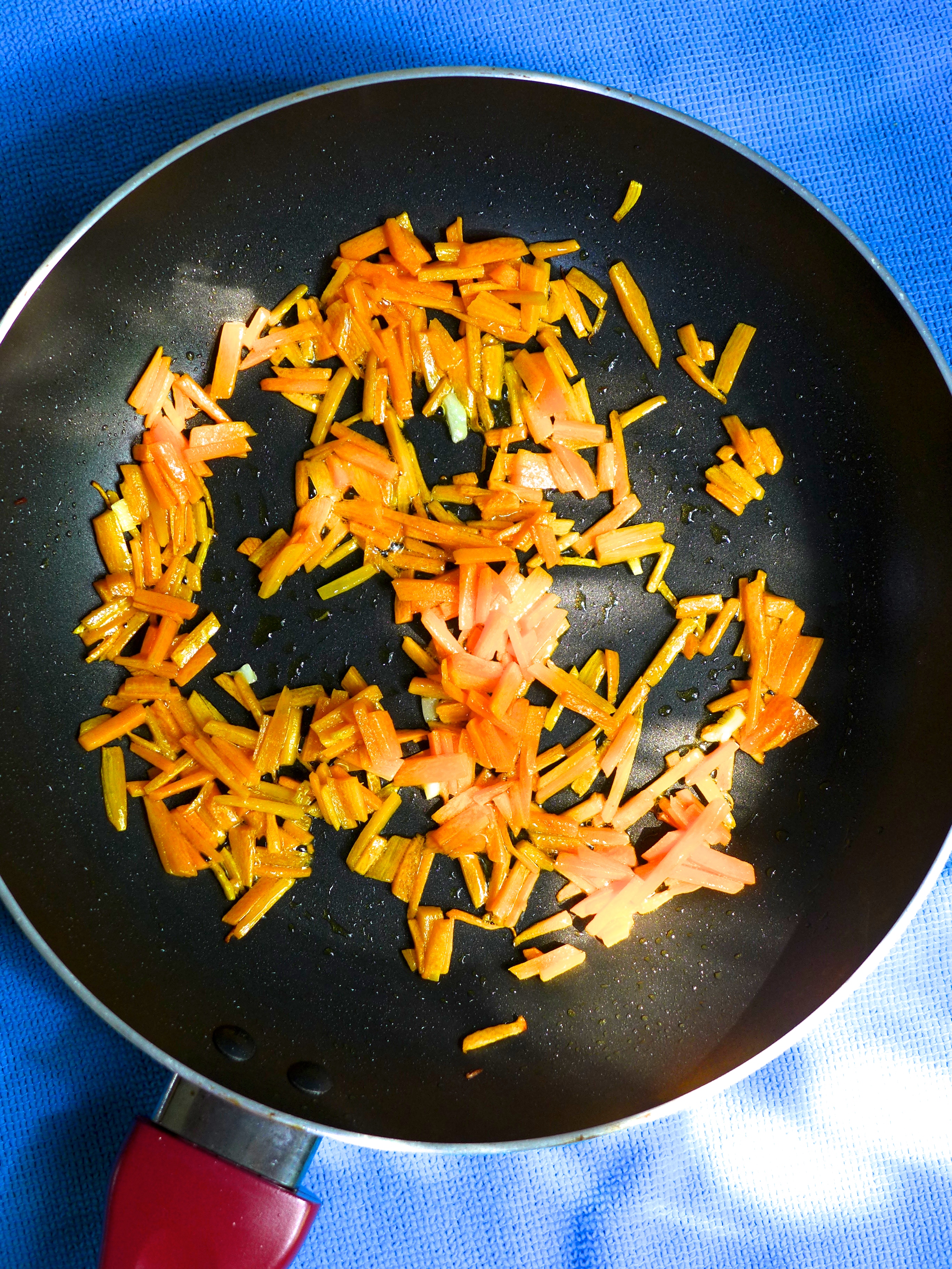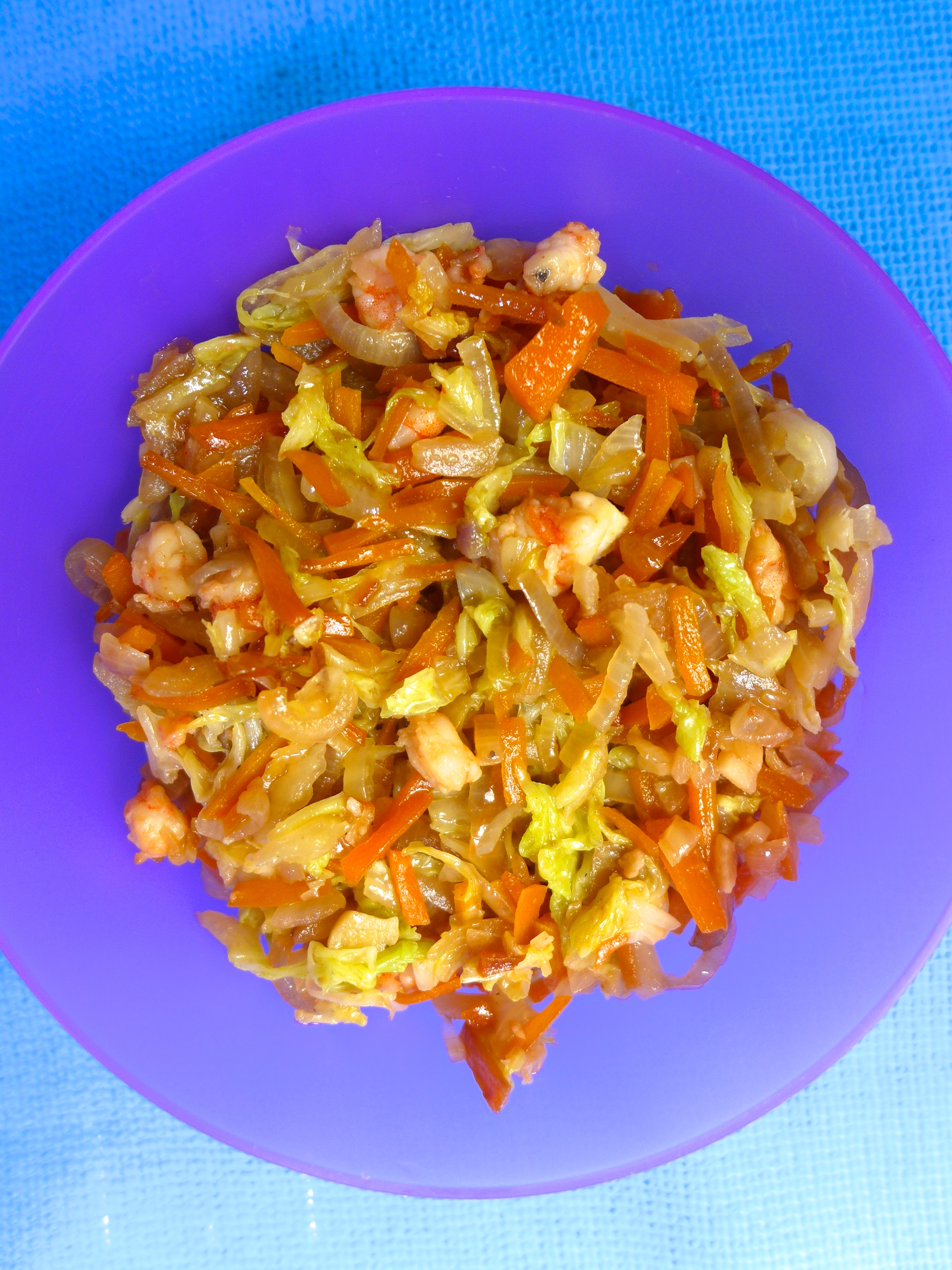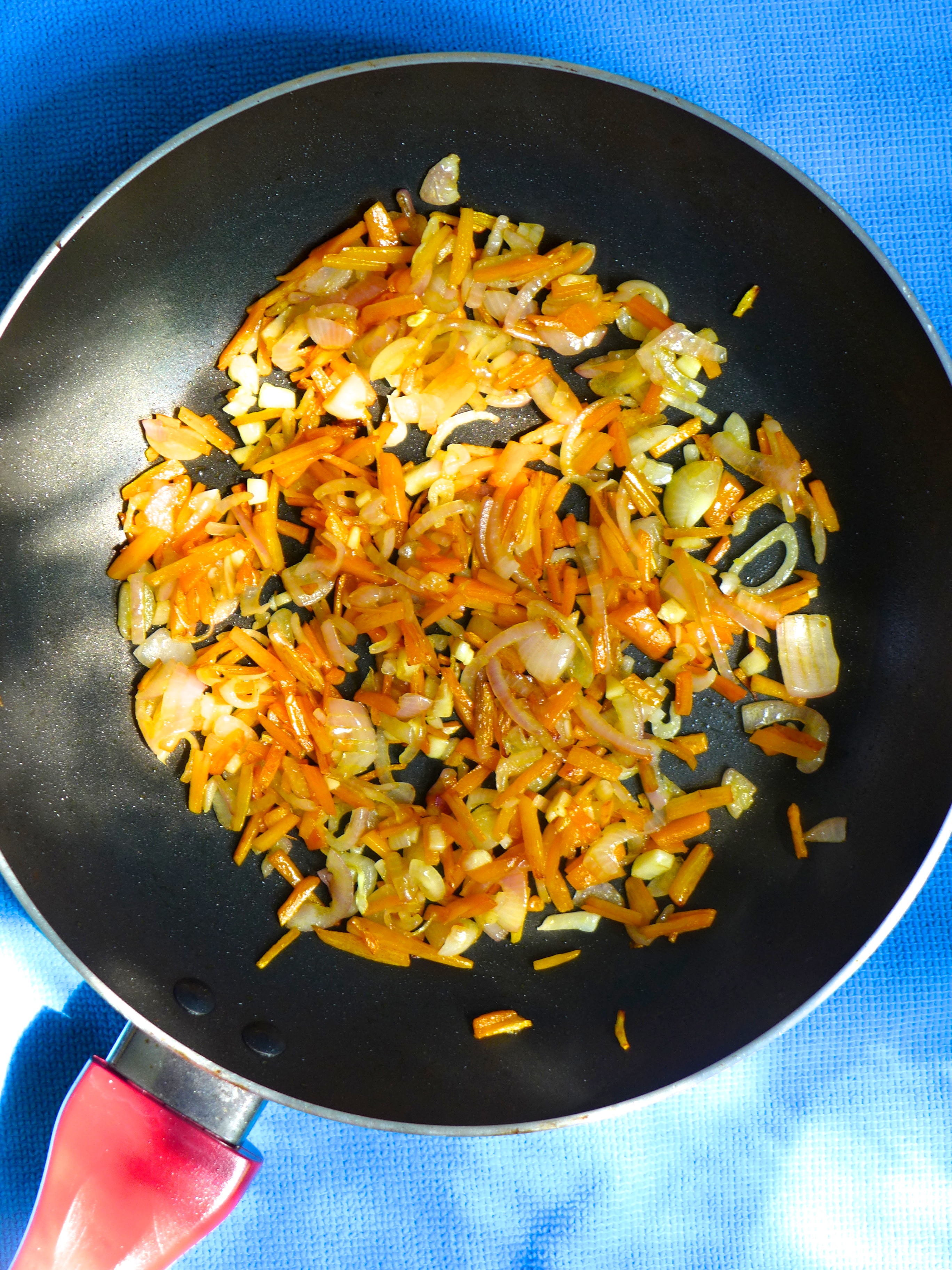 En una sartén con un poco de aceite salteo la zanahoria durante un par de minutos. Añado los chalotes y el ajo. Lo salteo durante otro par de minutos y añado la col china. Remuevo durante un minuto y echo las gambas.